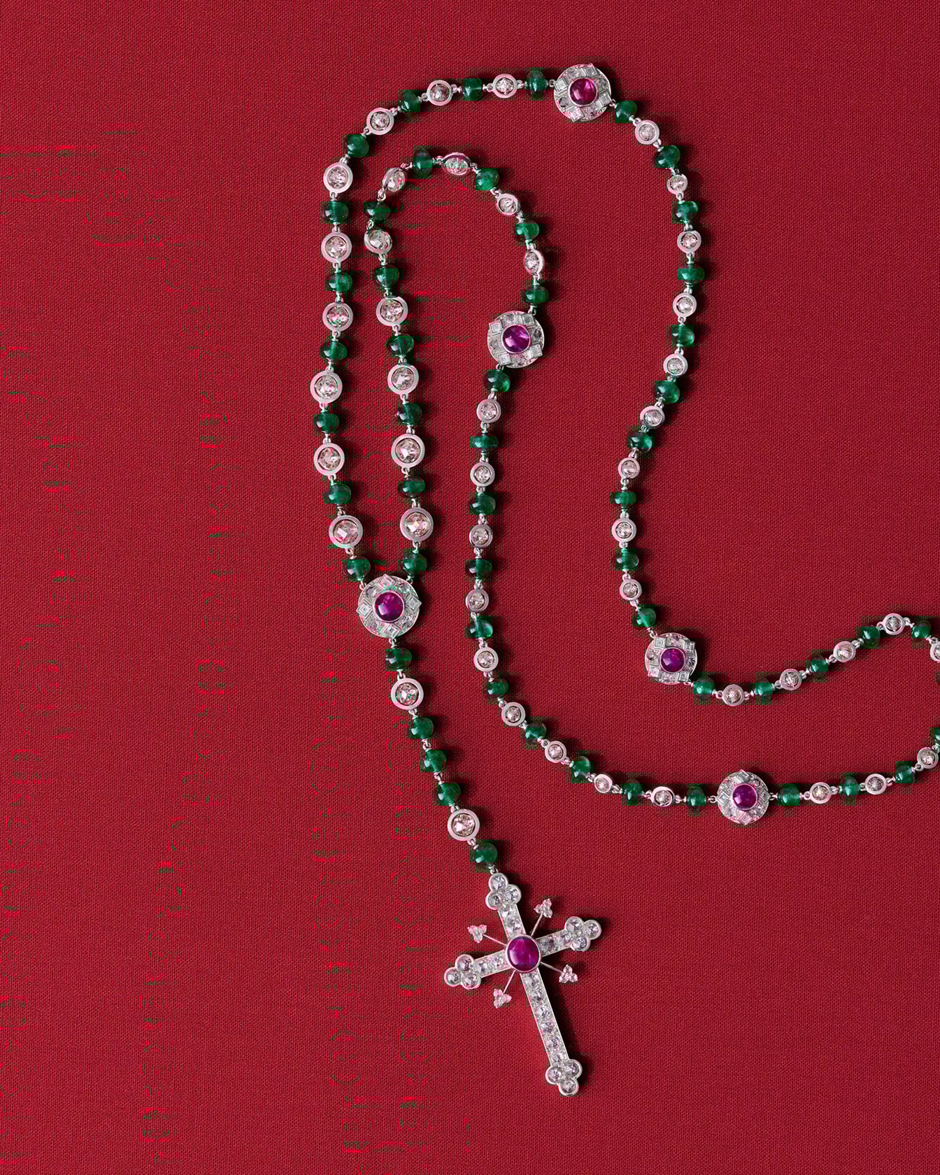 ルビーとエメラルドによる色のコントラストはもちろんのこと、ローズカットダイヤモンドをあしらったチェーンにはアンティークの要素が反映され、ウェス・アンダーソンの美しい世界観が存分に表現されています。