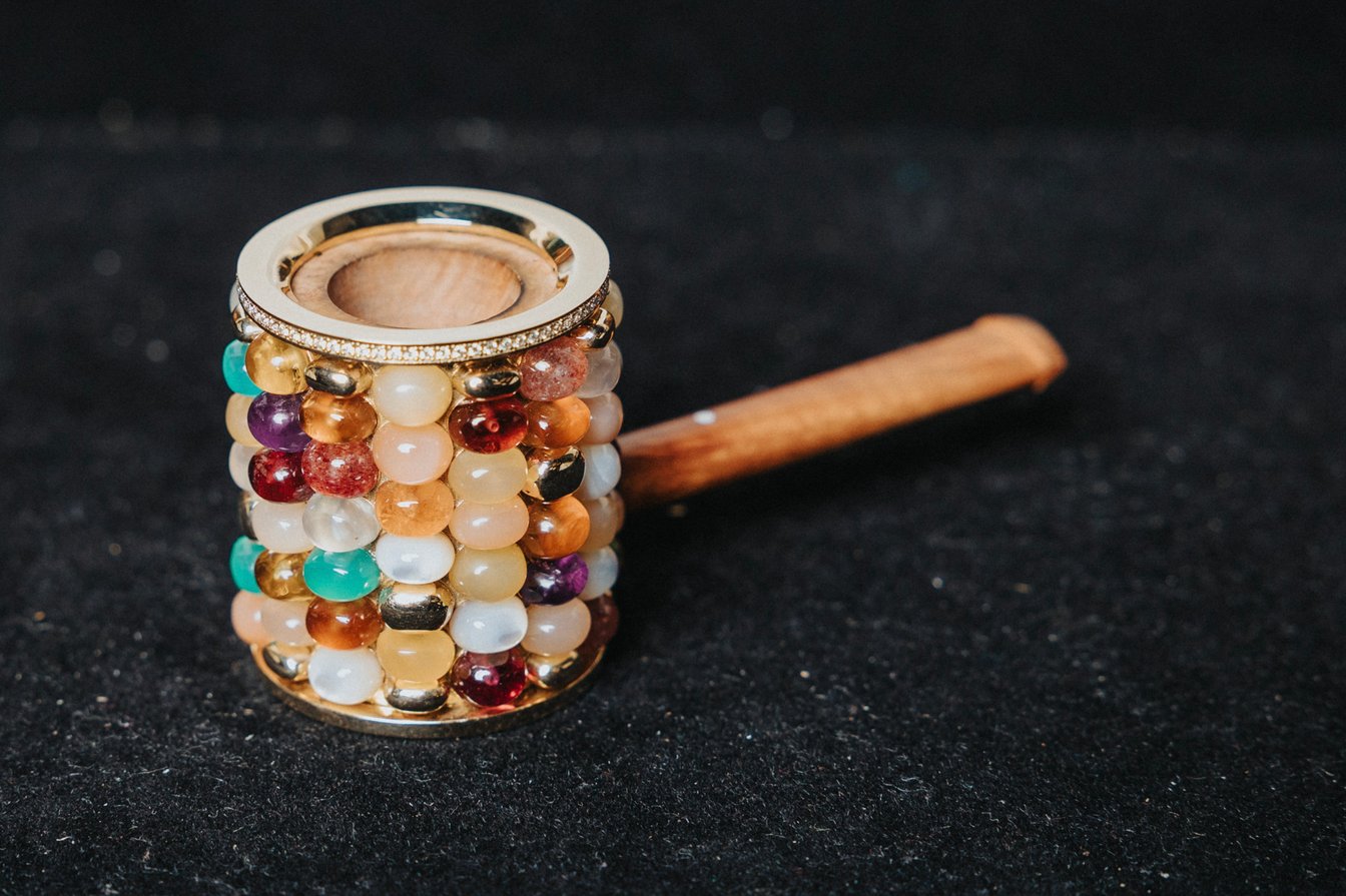 19世紀に流行したアメリカの古典的なコーンコブパイプ(トウモロコシの穂軸を削って作られたスタイル)から着想を得て作ったそうで、手作業でカットし磨き上げられた色鮮やかな石が、ボウルを囲む18金ゴールドのフレームに一粒ずつ精緻にあしらわれています。