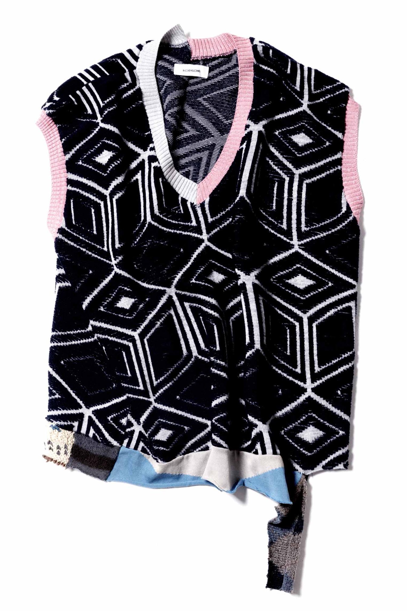2022年秋冬コレクションで、アーティストのKOUSUKE SHIMIZUにオリジナルジャカードの柄を依頼。ポップな一面とダークな一面が共存する総柄を“悪夢”と捉えた。