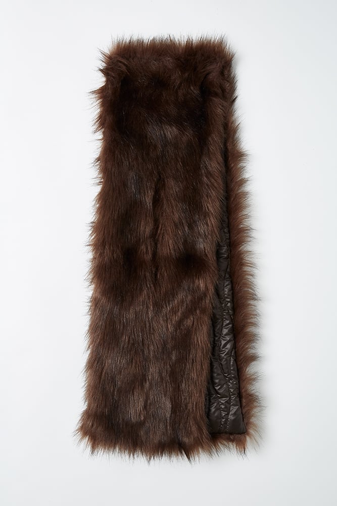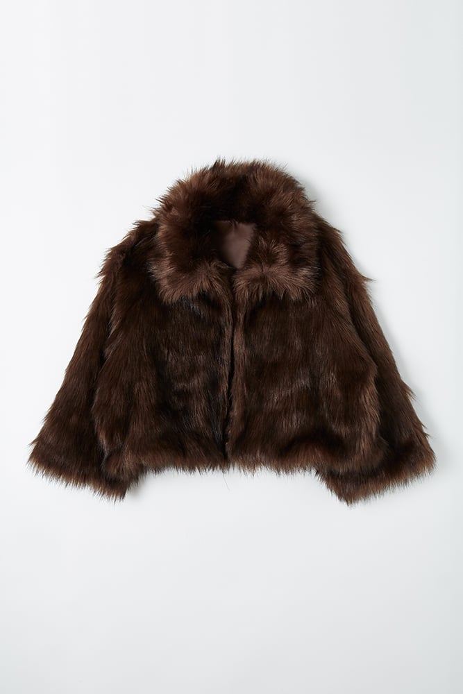 「パッと見のデザインは地味な印象ですが、素材がとにかく美しく、肌触りと着心地にうっとりします」とデザイナーも太鼓判を押すヴィーガンファー。トウモロコシ由来のポリエステルソロナとヘンプを主原料にしたファーは、全体の40%が植物由来で作られたエコペル社とブランドの別注素材。「ブランド創業当時より冬の定番として作ってきたアイテムが、背景や表情をアップデートして作ることができた自信作です」