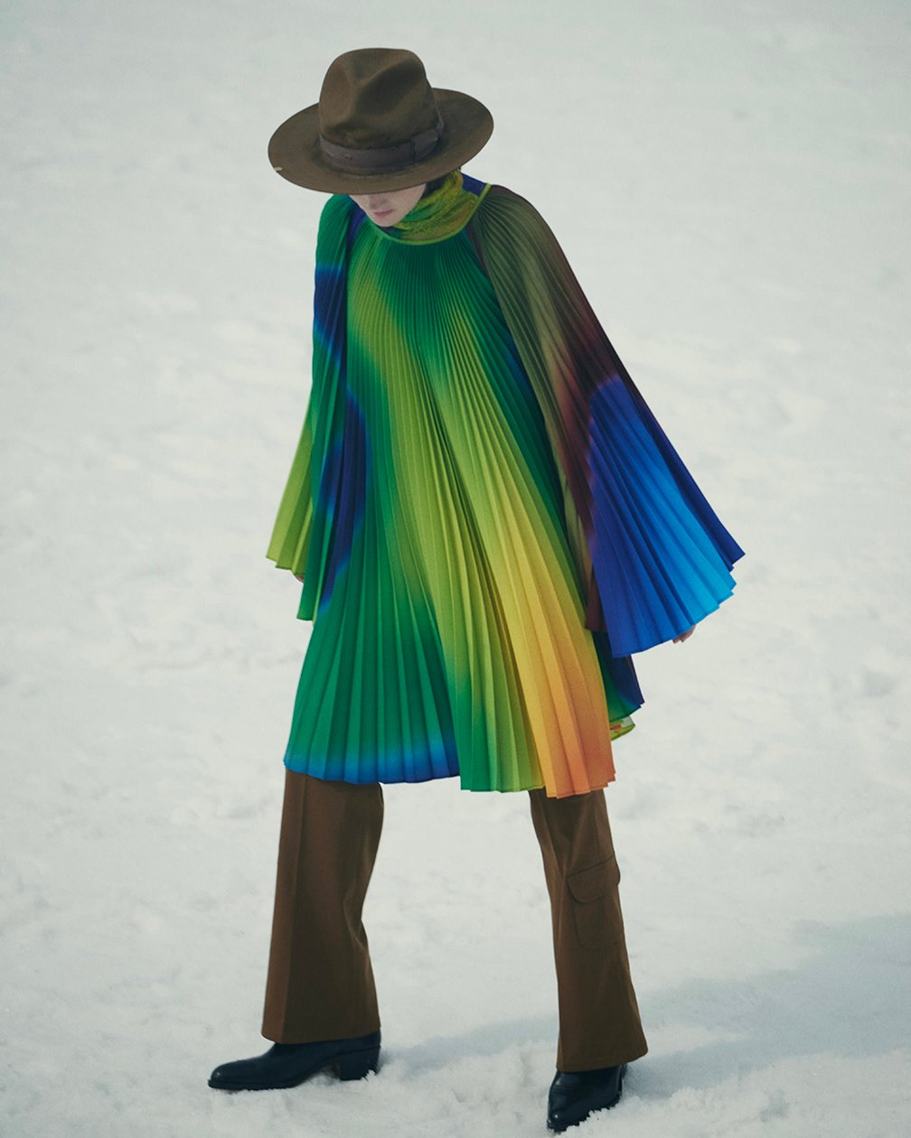 ヤシゲとビアンカがピックアップしたのは、讃美歌「アメージンググレース」が流れる雪山で撮影したクリノリンスタイルのスカートとフライトジャケット「B-3」を組み合わせたルック。また、オールグリーンでスタイリングしたルックは、陽の光が神秘的な雰囲気を演出していることからお気に入りのルックとしてピックアップした。