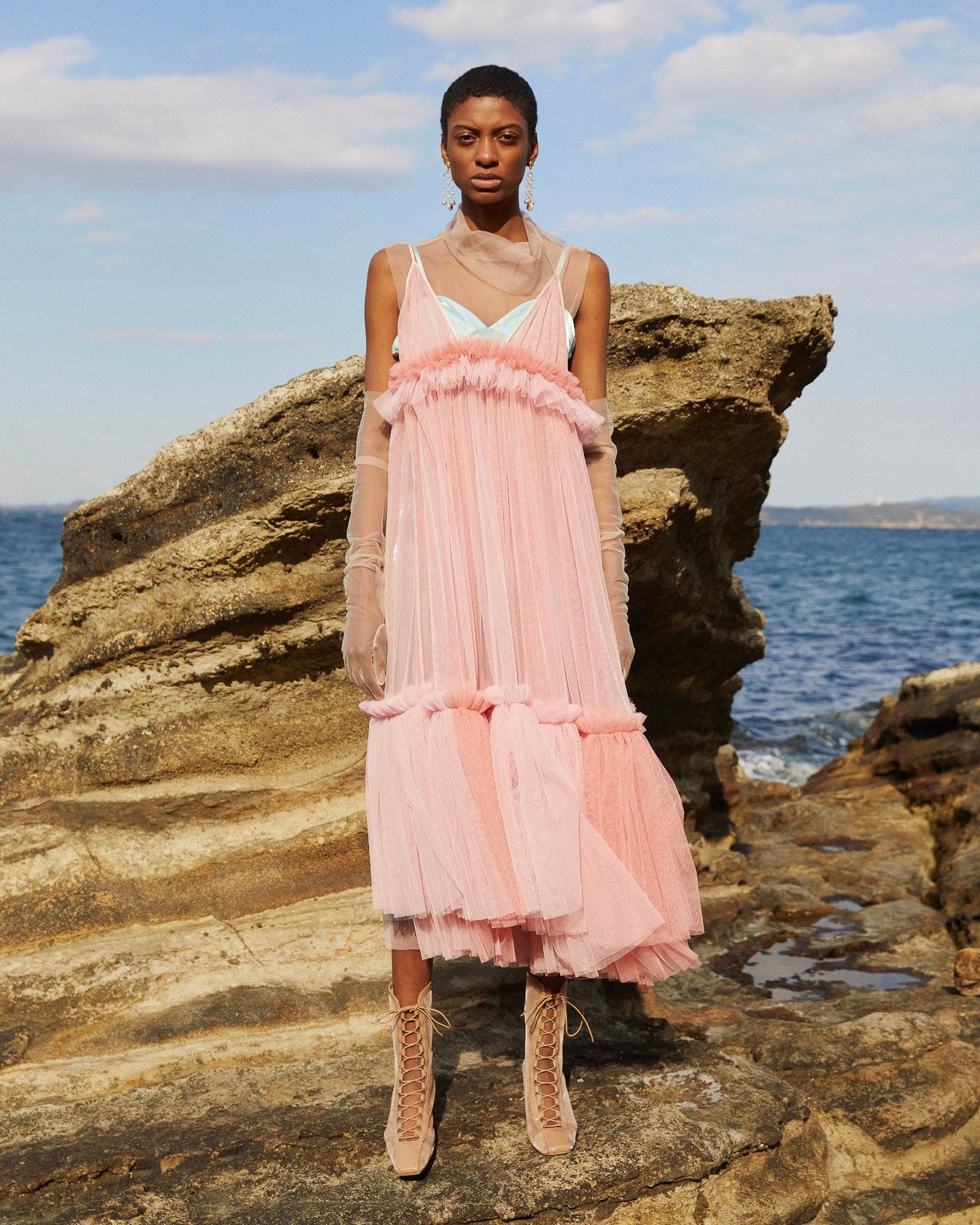 学生の頃からドレスが好きだったというデザイナーは、ジョン・ガリアーノ(John Galliano)やアレクサンダー・マックイーン(Alexander McQueen)のクリエイションから影響を受け、チュールという素材に魅了されたという。「ヴィヴィアーノでは、チュールの持つ透け感を最大限活かすようなデザインを採用している。異なる色味のものを重ねたり、あえて近似の色味を選んで奥行きを演出するなど組み合わせは無限であり、表現方法の幅が広いのがチュールの最大の魅力」と解説。チュールを用いたアイテムには裏地が付かないのも透け感を活かしてインナーとのレイヤードを楽しんで欲しいというデザイナーの考えからだ。一方、ラッフルも毎シーズン欠かさず取り入れている象徴的なディテールである。アイコニックなチュールに負けない分量感や独創的なフォルムを作り出し、ブランドのモチーフである花を表現する際に役立つという。シーズンごとに作り方を変え、多彩な方法で活用しているそうだ。