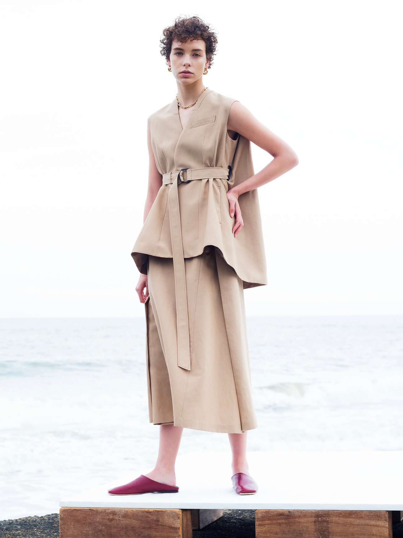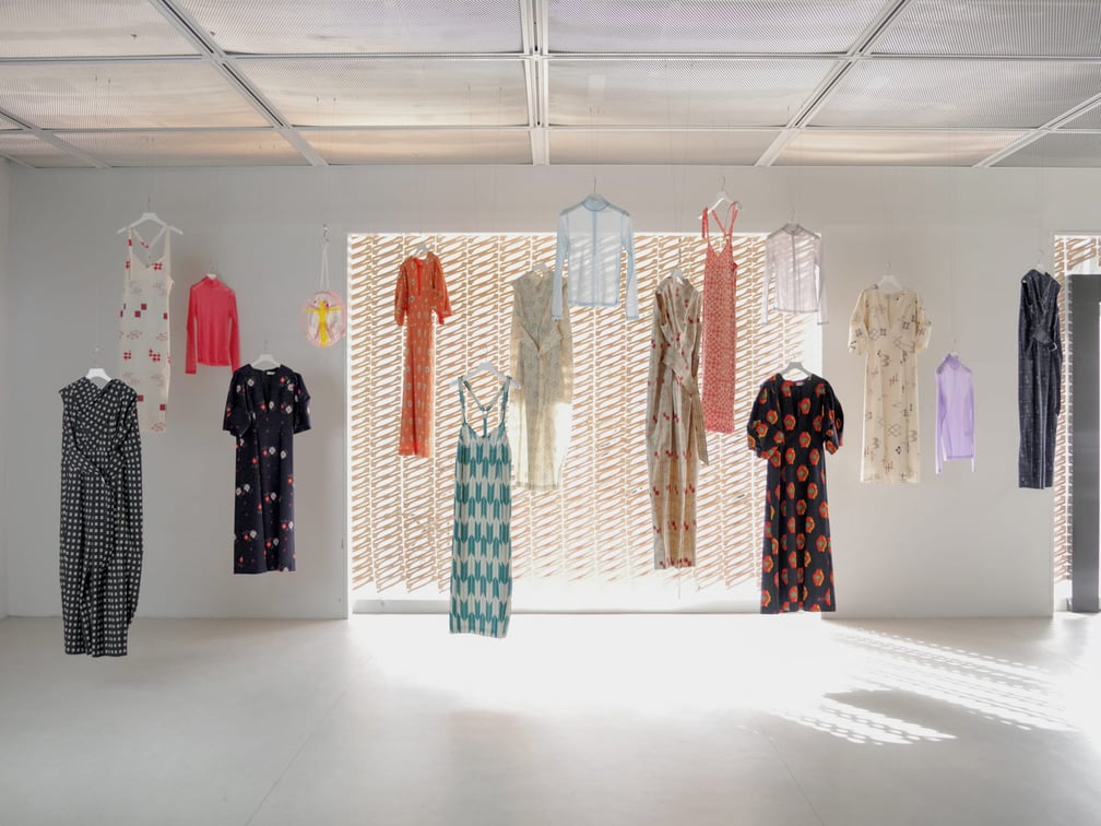 その中でもバックスタイルにマントのようなボリュームを持たせたシルエットは、トップスやワンピースなど様々なアイテムに展開されており、ブランドの象徴となっている。ウエストに取り付けられた大きなハトメにベルトを通すことで、後ろのボリュームを保ちつつスッキリとした印象に仕上げることができるという。生地をたっぷりと使用したワンピースは、ブランドの中でも特に人気の高いアイテムだ。