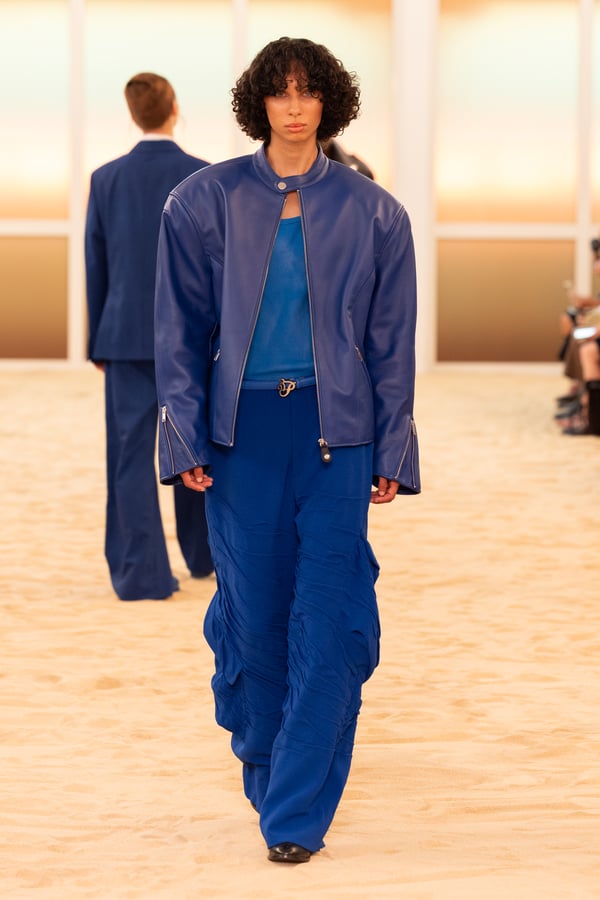 デザイナーのエメリック・チャチュア(Emeric Tchatchoua)が手掛ける、パリ発「スリー.パラディ(3.PARADIS)」の2026年春夏コレクションのテーマは「Steps to Nowhere(どこへも至らない歩み)」。広大で、果てしなく続く砂漠が持つ「時を超越する」ようなイメージを通して、「時間」の儚さを表現したという。砂漠に見立てた砂が一面に敷き詰められたランウェイを、放浪するようなゆっくりとした足取りでモデルたちが歩いた。