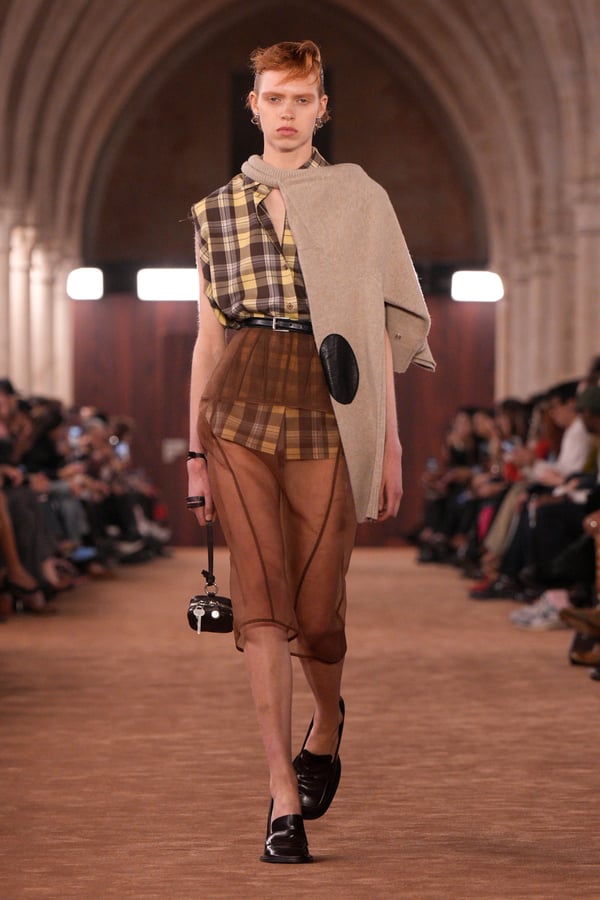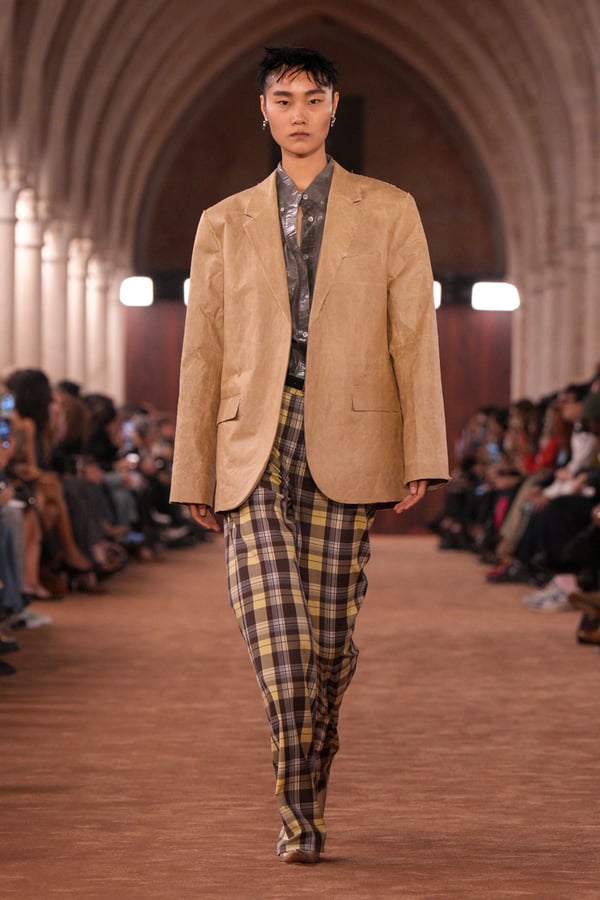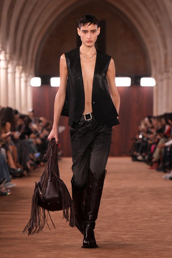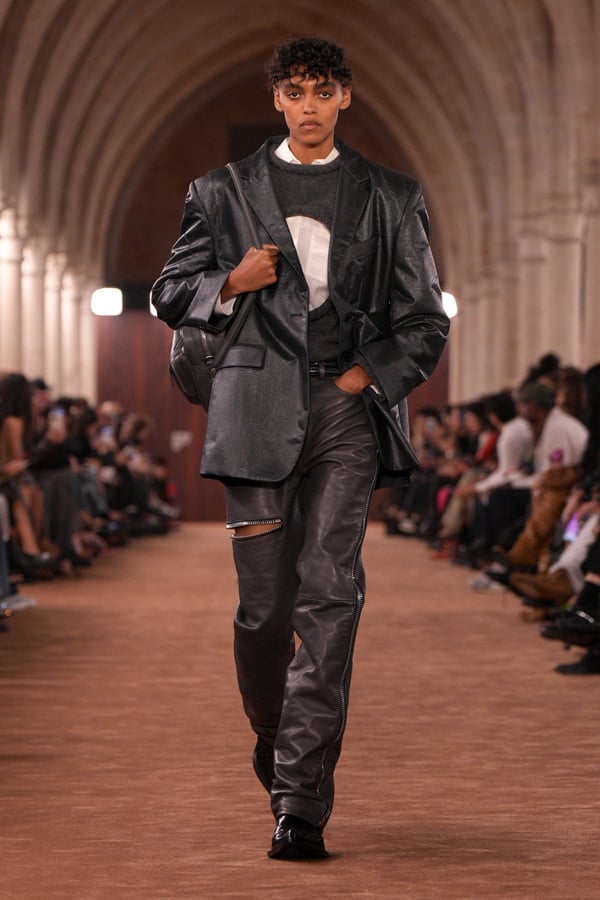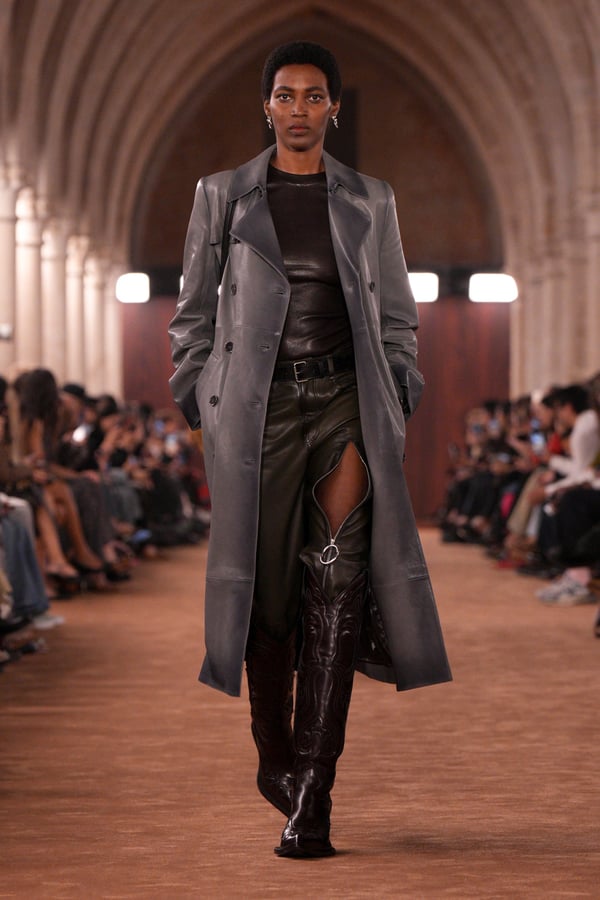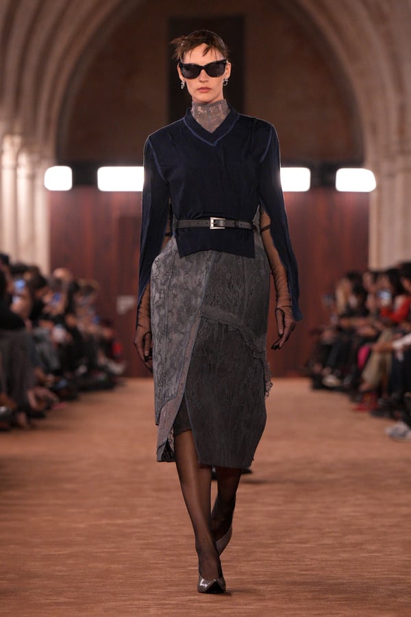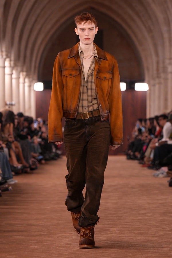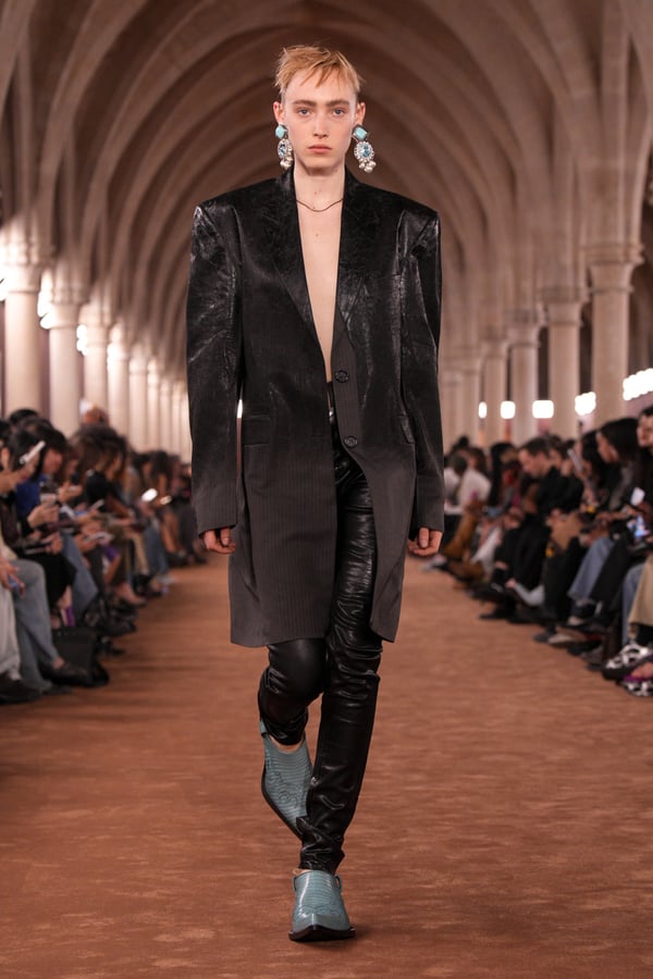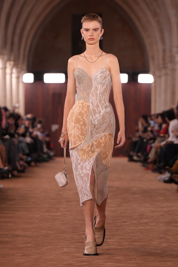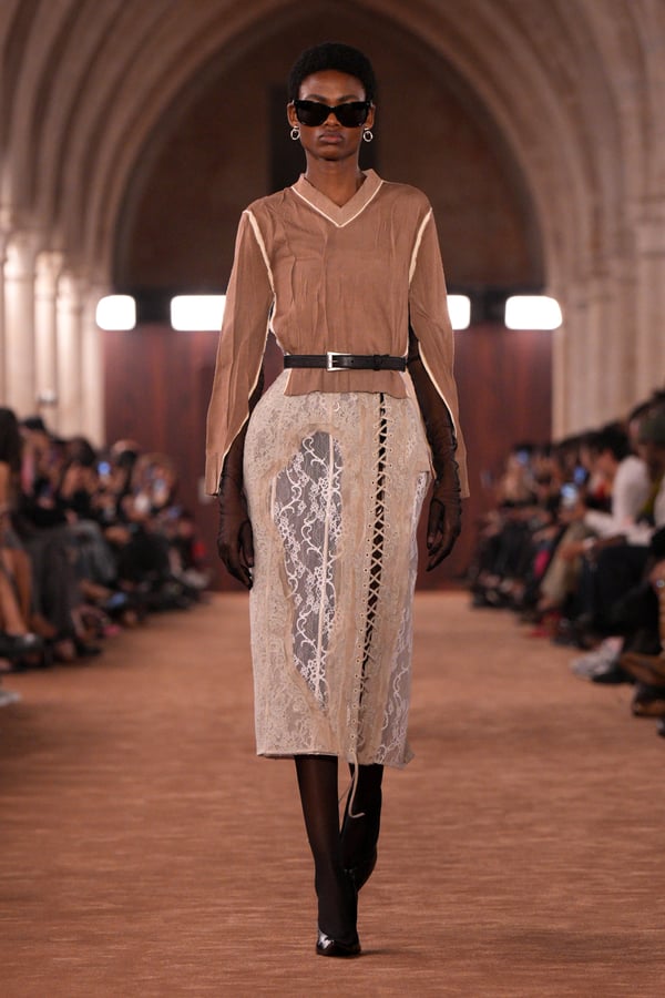 「アクネ ストゥディオズ(Acne Studios)」2026年春夏コレクションは、メンズとウィメンズのアーキタイプを再解釈し、ジェンダーを横断する新たな女性像を描き出した。アーチが重なる歴史的空間に設えられたチョコレートブラウンのシガーサロン風のランウェイには、写真家パシフィコ・シラーノの作品が飾られ、会場にも姿を見せたスウェーデンの国民的歌手Robynが手掛けた楽曲が反響した。BGMに合わせてパワフルなウォーキングを見せるモデルたちは挑発的でマスキュリンな雰囲気をまとい、凛々しい出で立ち。コレクションでは肩幅のあるジャケットに直線的なボトムスを合わせるほか、レザーや紙のような加工が施されたデニム、エポーレットシャツ、強靭なカウボーイブーツやスクエアトゥのローファーなどメンズのワードローブを思わせるタフなルックが多く見受けられた。一方で透ける素材も多用され、レースのパッチワークドレスやコルセットといった女性らしい体のラインを強調するアイテムも登場し、日常と非日常、マスキュリンとフェミニンの境界を遊ぶようなルックが並んだ。シャツやセーターに大胆にカッティングされた“窓”からはシラーノの作品や、中に着たシャツなどが顔を出しユニークなピースに。ブランド創立30周年に向け、多面的で自由な女性像を提示したコレクションとなった。