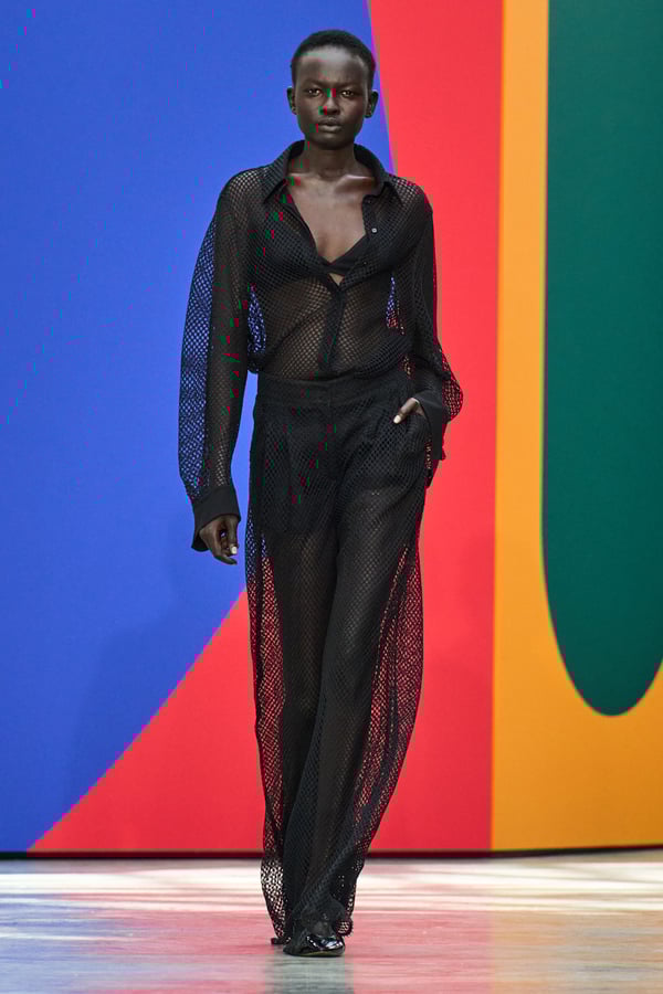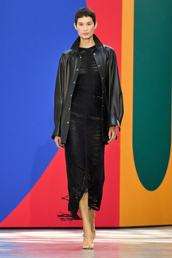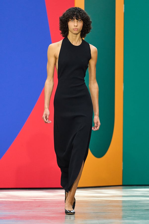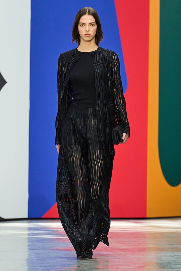 クリームラー自身が2023年チューリッヒのハウス・コンストルクティヴで出会った「セブン・インボルブメンツ・イン・ワン」の鮮やかさと精緻さが、ランウェイ全体に反映された。色鮮やかなカラーパレットに加え、自社開発のドレープフリンジニットは、スミスの描く曲線美を体現しながら身体を優雅に包み込み、刺繍を施したドレスとガウンは、装飾ではなく構造の一部として機能していた。