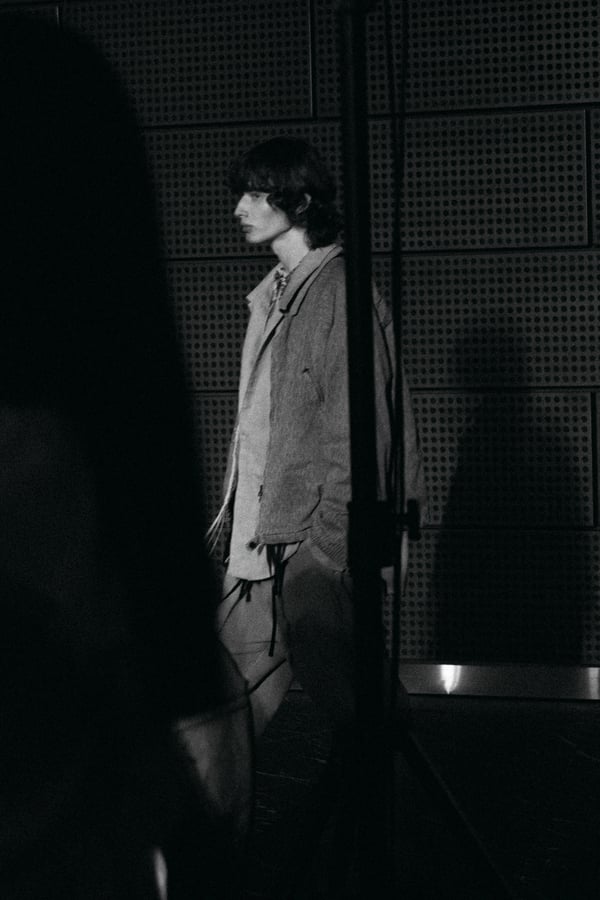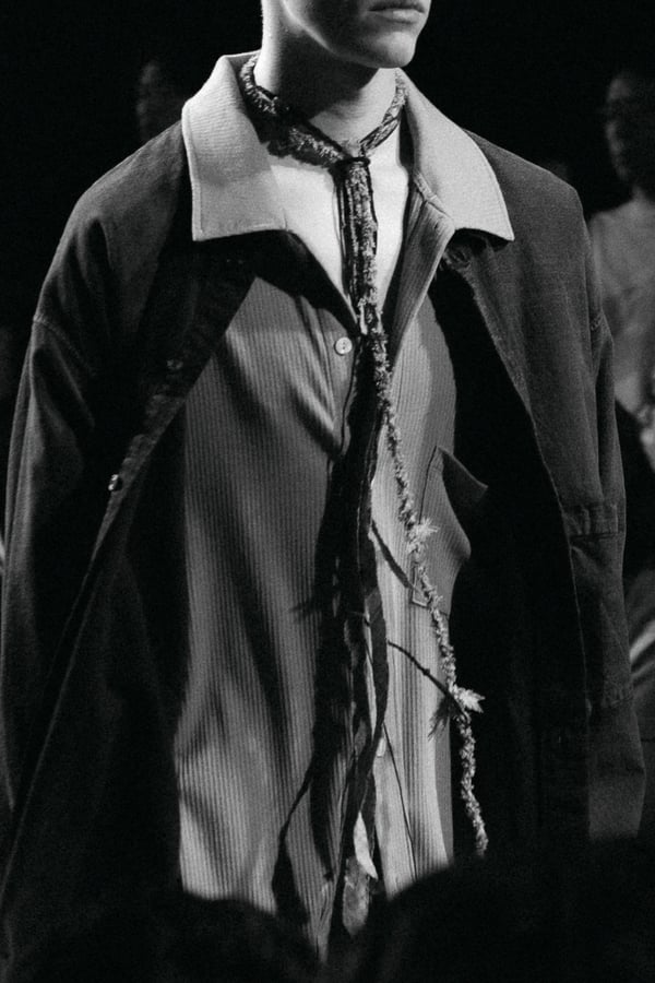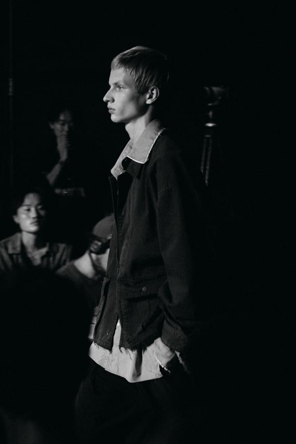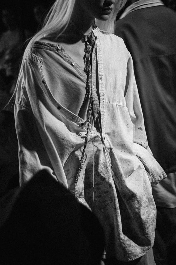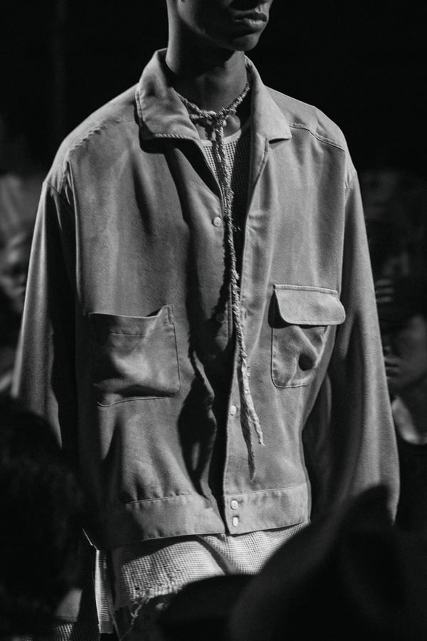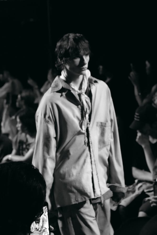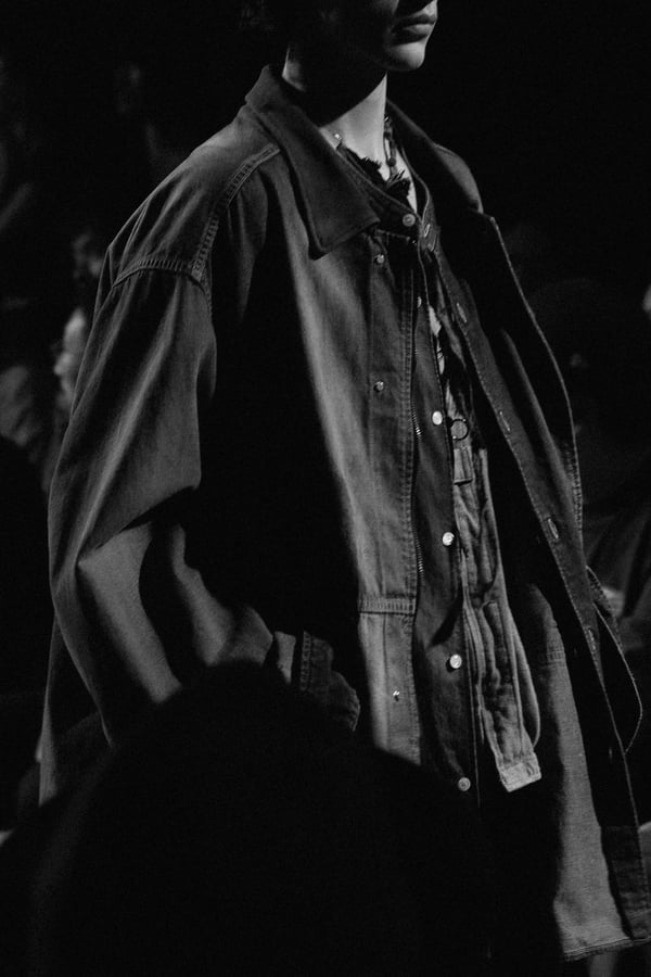コレクションでは、ブランドの代名詞とも言えるデニムアイテムのほか、ブランド初の革製品である表面にガラスコーティングを施したレザージャケット、ブランドコンセプトである経年変化を表現したような裾や袖先が切りっぱなしになっているセットアップやシャツなどが登場。グランジ風のアイテムにあえてスカーフをスタイリングするなど、キレイめな要素と組み合わせることでアイテムの奥行きや可能性を表現した。