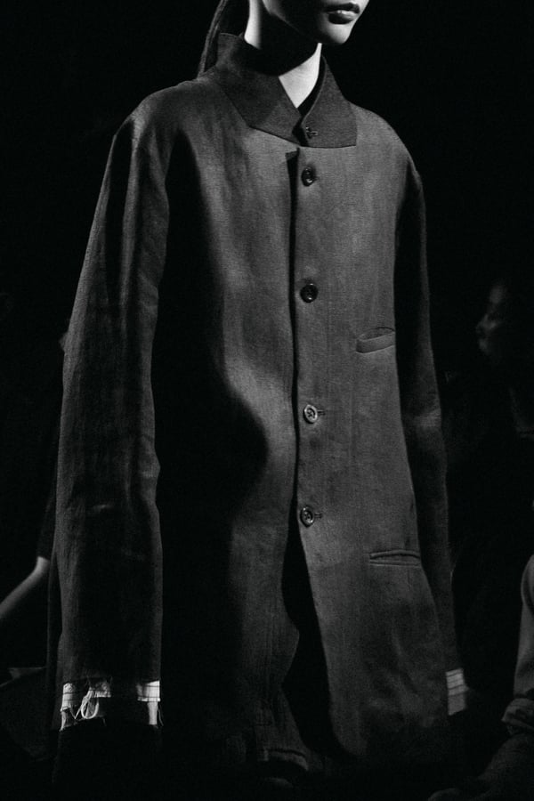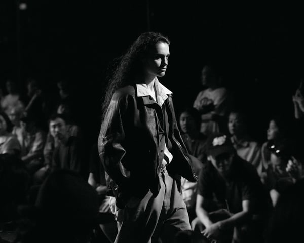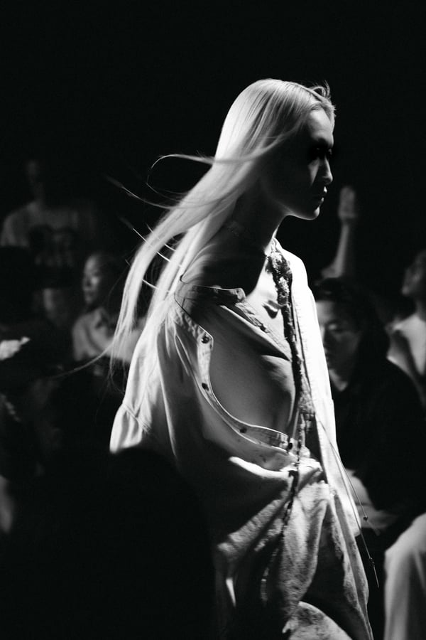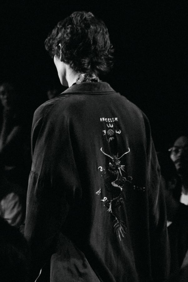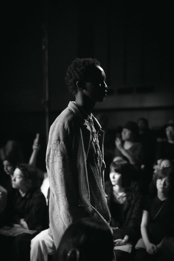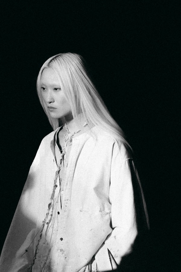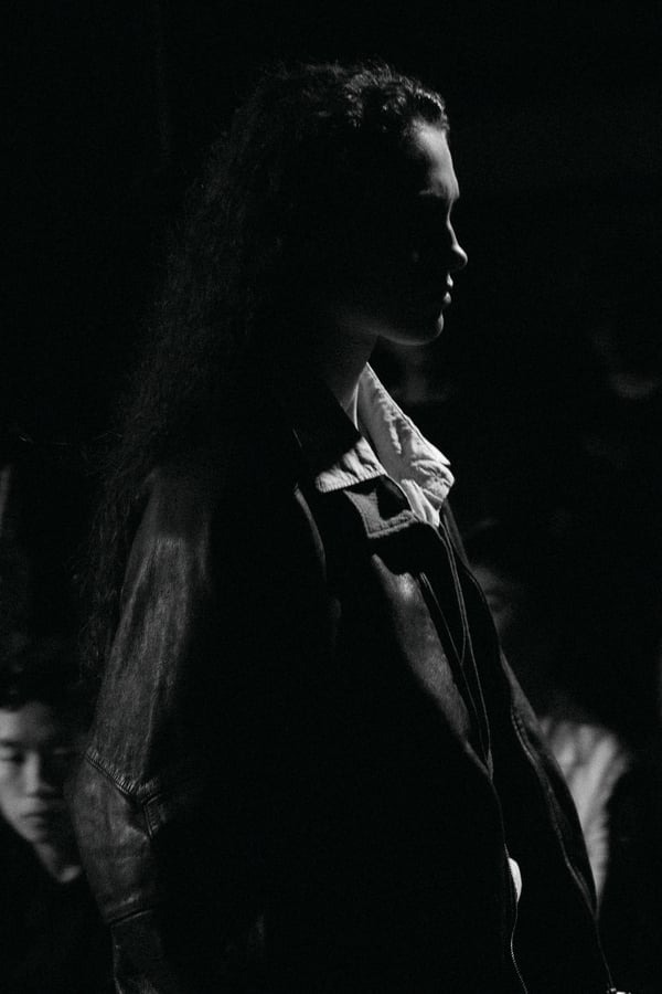 コレクションでは、ブランドの代名詞とも言えるデニムアイテムのほか、ブランド初の革製品である表面にガラスコーティングを施したレザージャケット、ブランドコンセプトである経年変化を表現したような裾や袖先が切りっぱなしになっているセットアップやシャツなどが登場。グランジ風のアイテムにあえてスカーフをスタイリングするなど、キレイめな要素と組み合わせることでアイテムの奥行きや可能性を表現した。