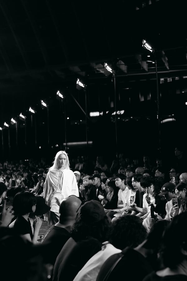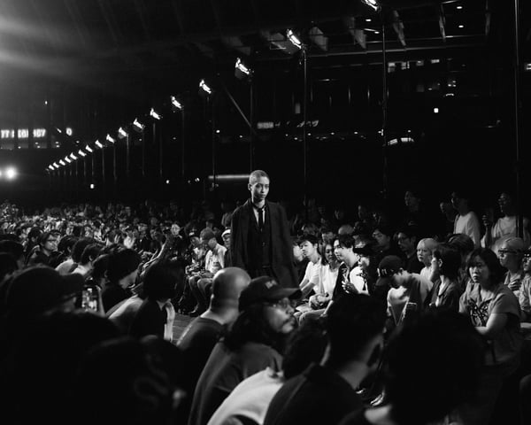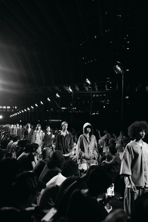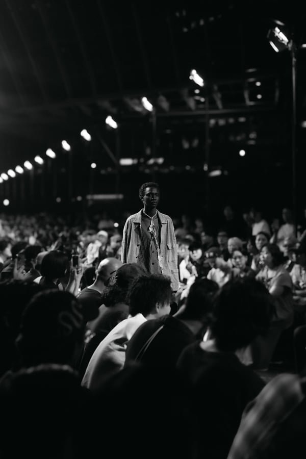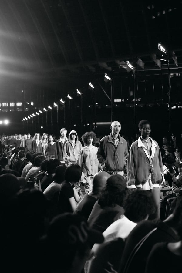 初のショーの舞台は、新宿住友ビル三角広場。約3250平方メートルの空間を贅沢に使用し、会場中央に用意されたランウェイの上を新作をまとったモデルが歩いた。