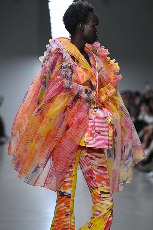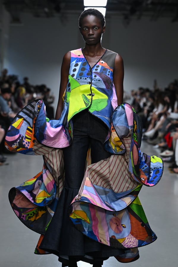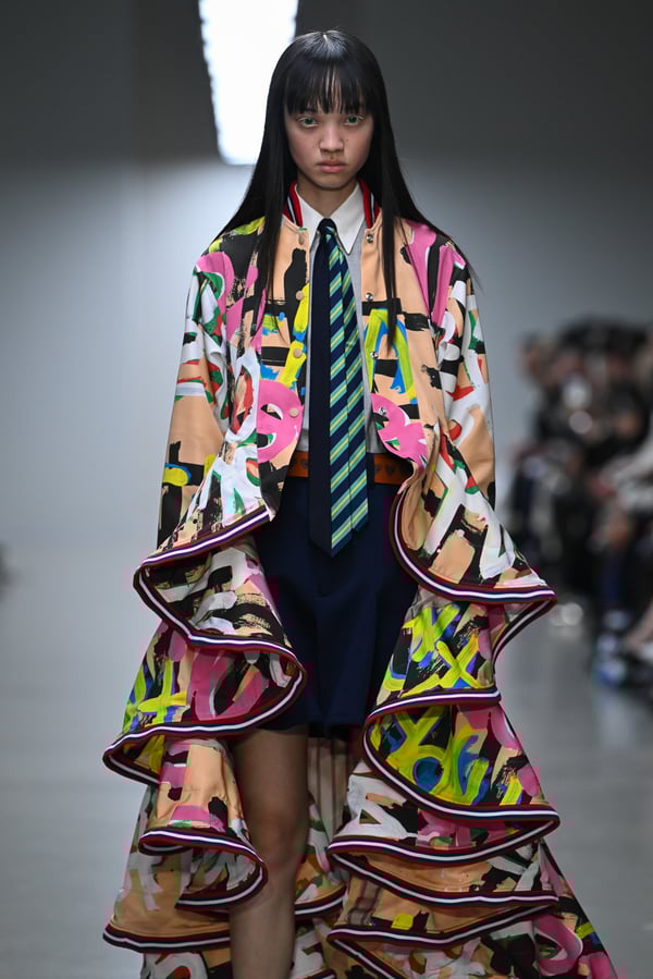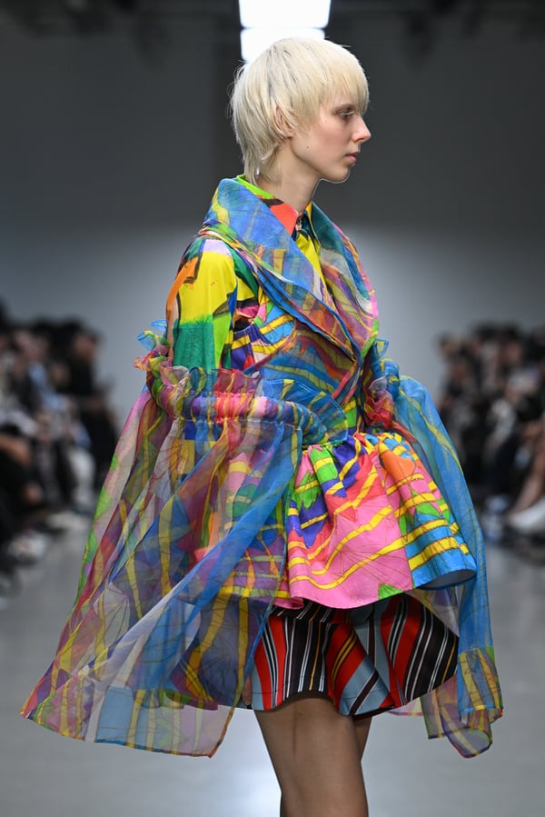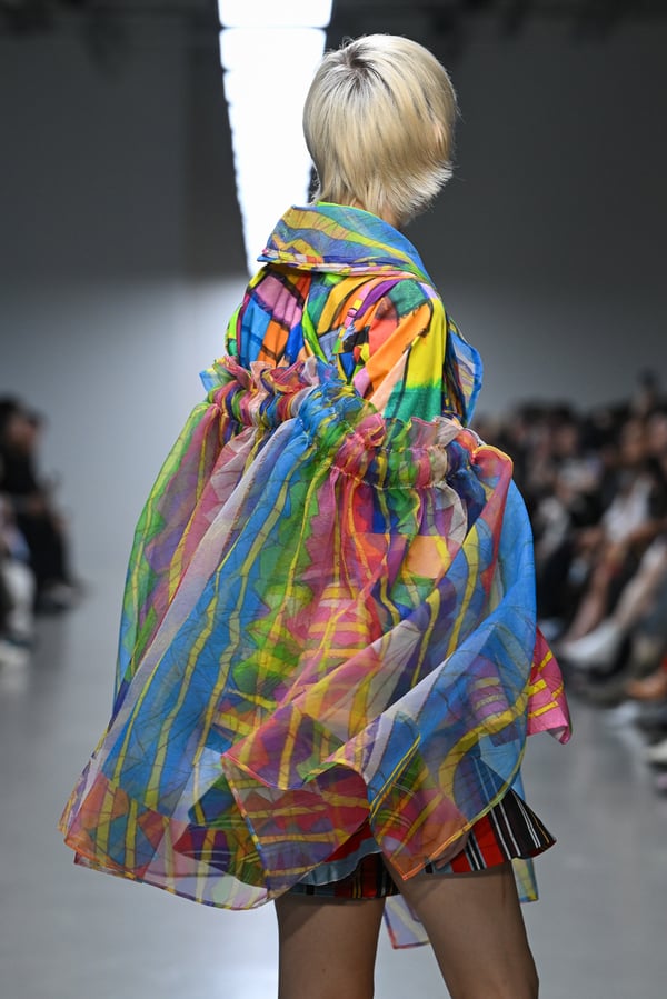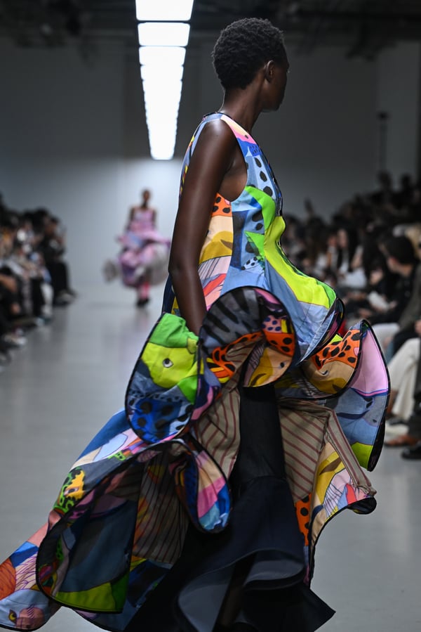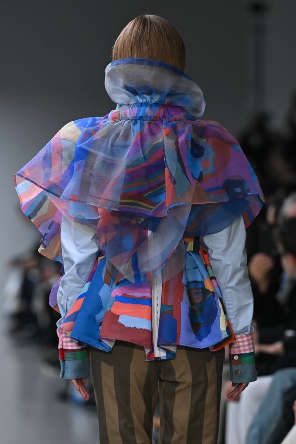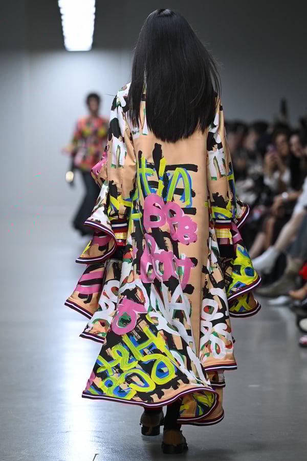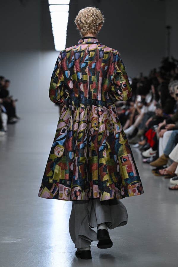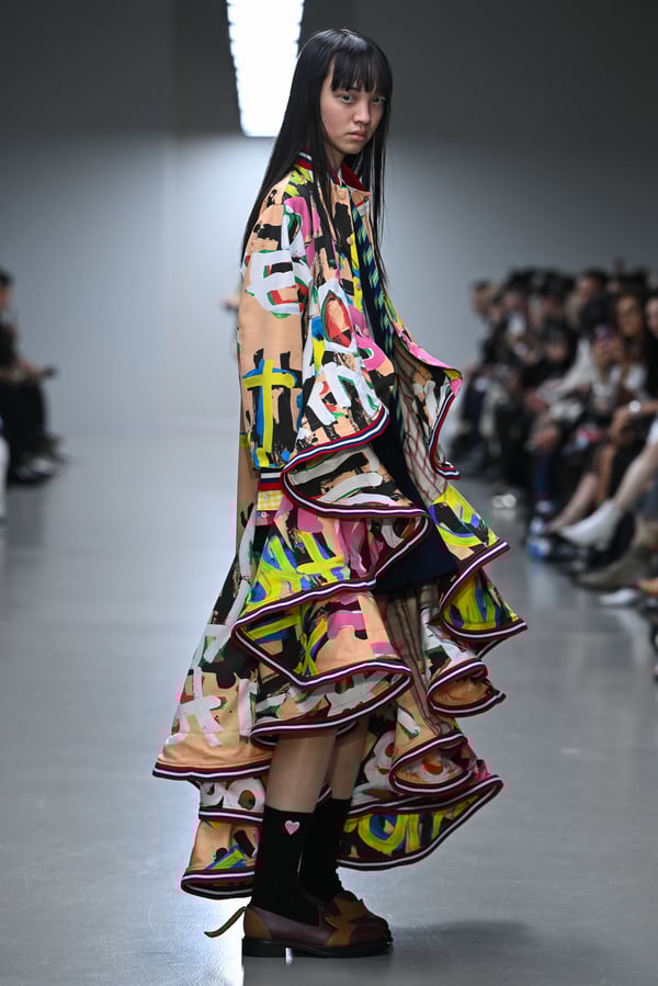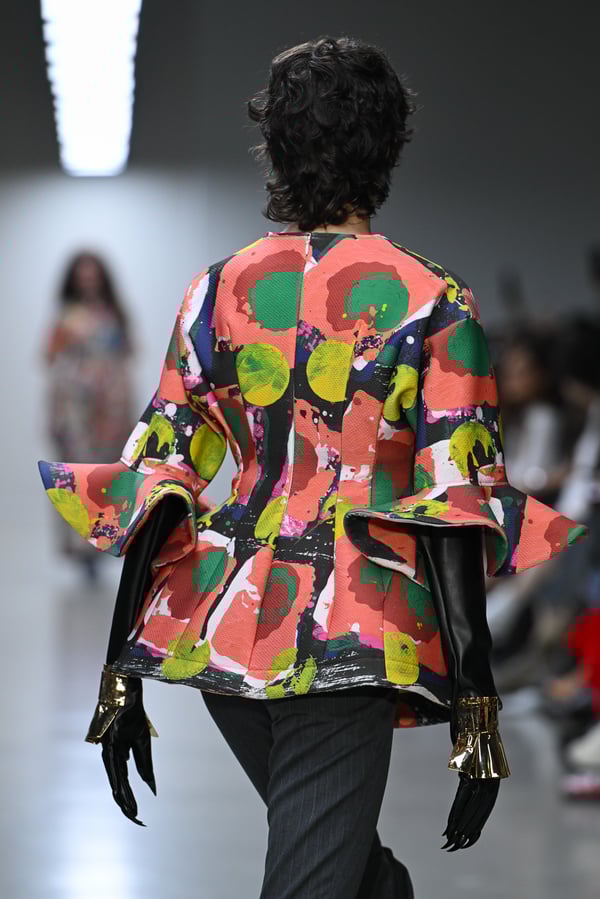 コレクションでは、「ヘラルボニー(HERALBONY)」の契約作家18名によるアートとコラボレーション。KYOCERAの持続可能な繊維プリンターFOREARTHによって鮮やかにプリントされた作品が、大胆なボリュームを持つコレクションピースを彩った。