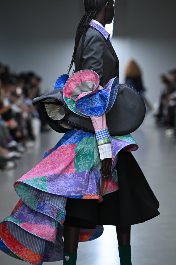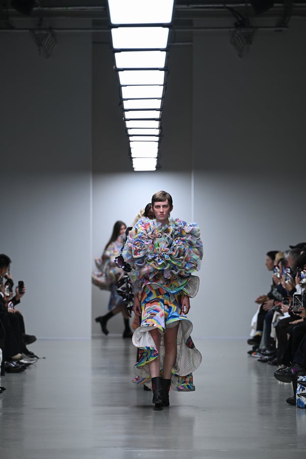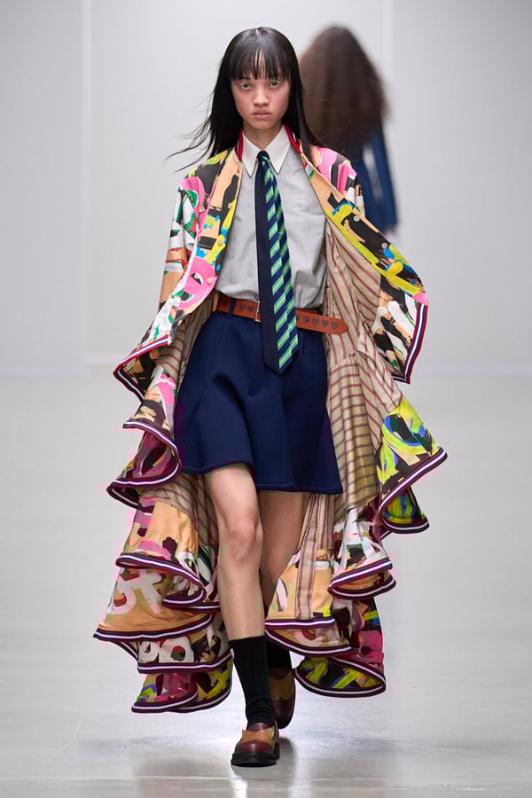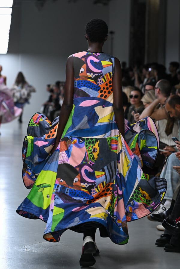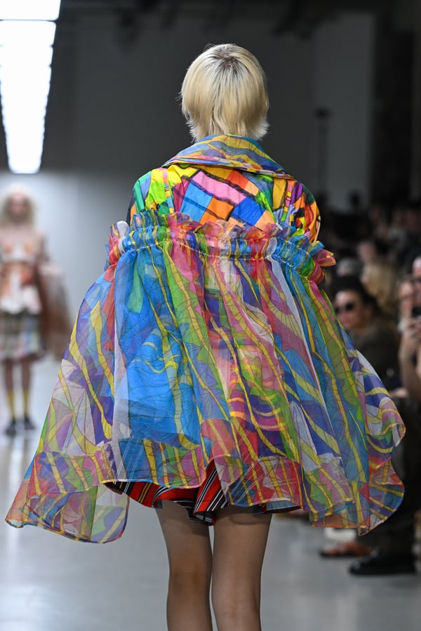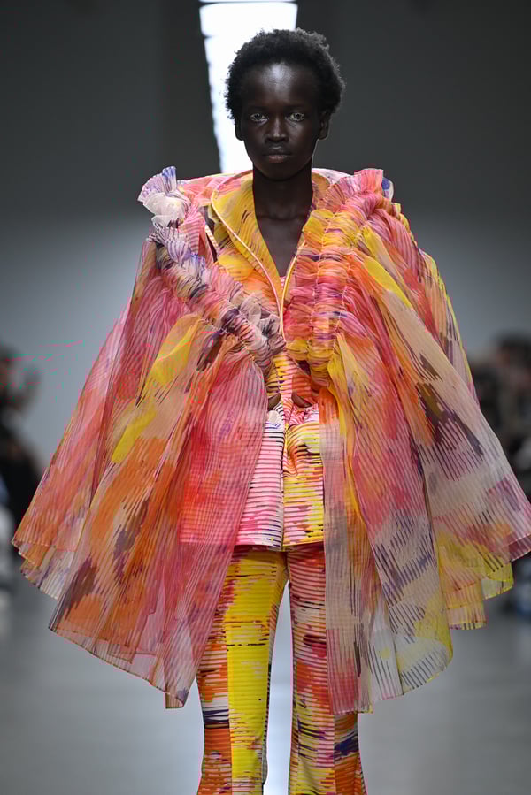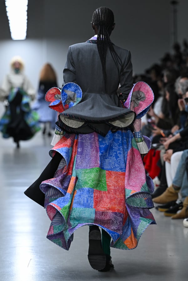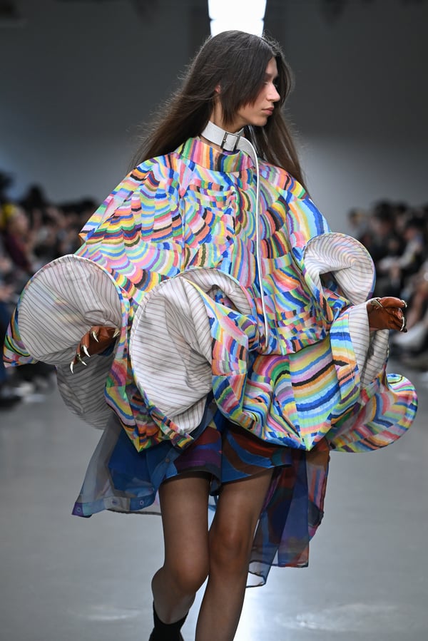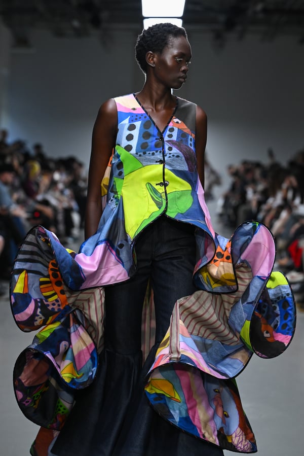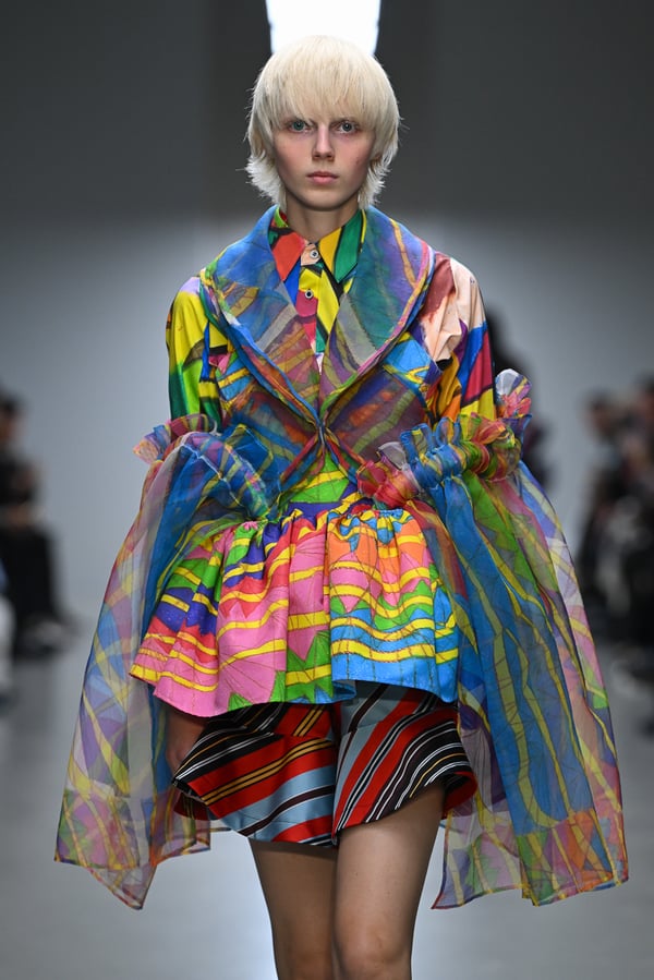 コレクションでは、「ヘラルボニー(HERALBONY)」の契約作家18名によるアートとコラボレーション。KYOCERAの持続可能な繊維プリンターFOREARTHによって鮮やかにプリントされた作品が、大胆なボリュームを持つコレクションピースを彩った。