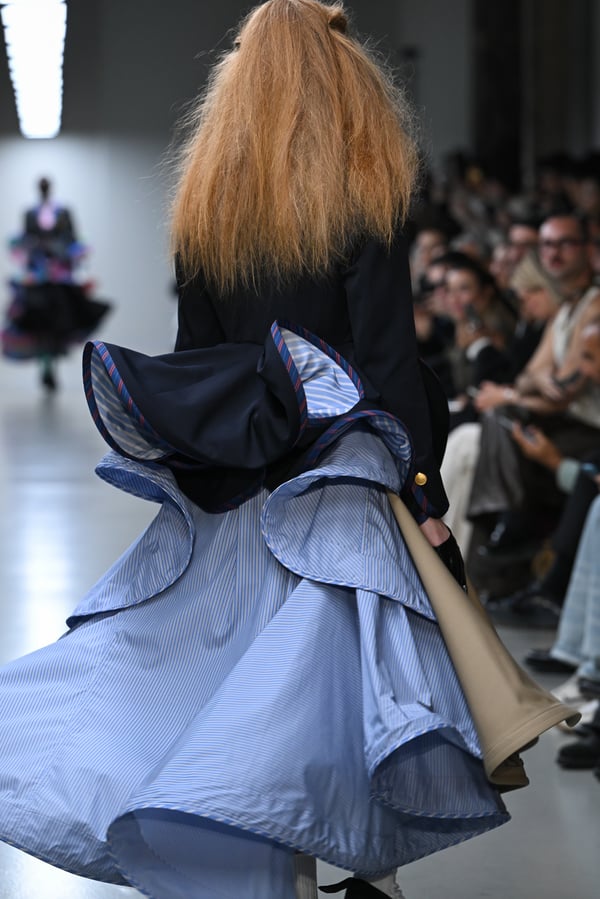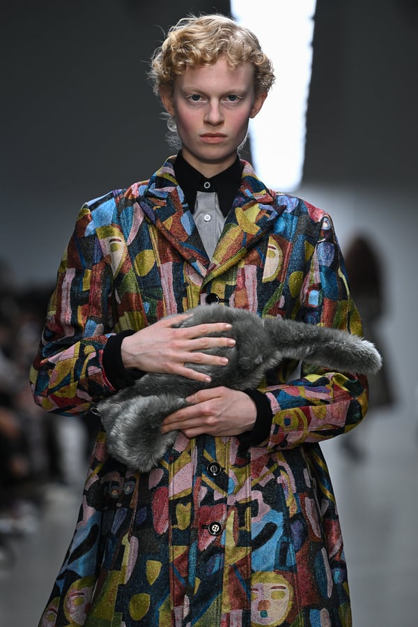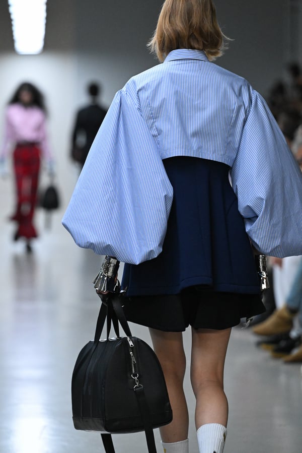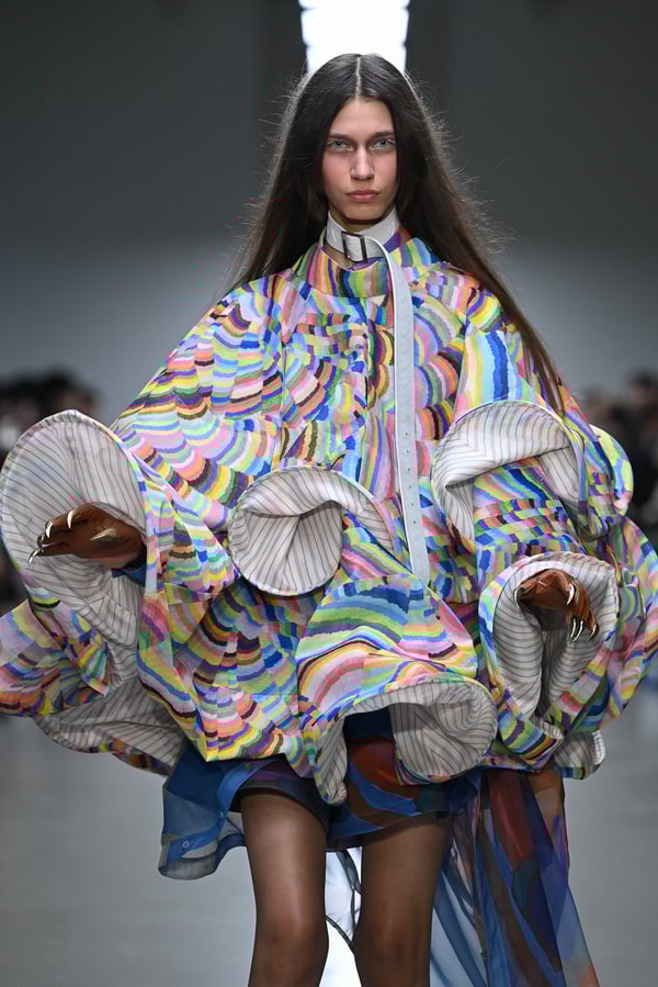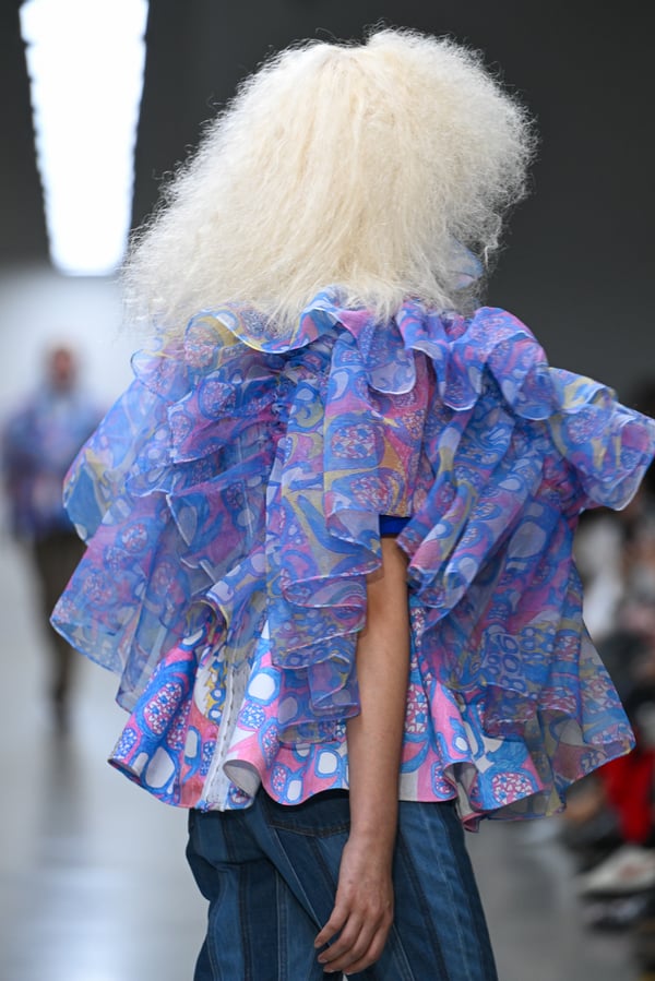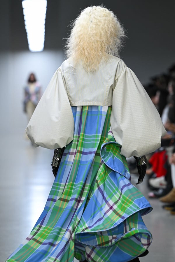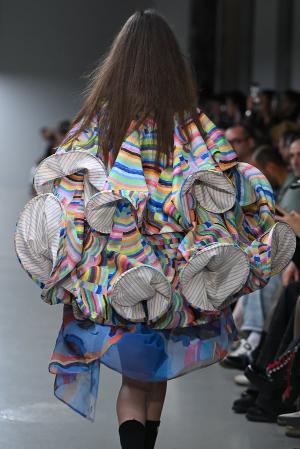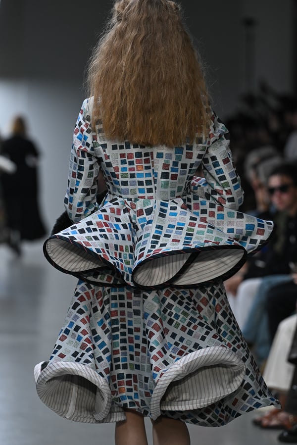 デザインにも生命のテーマを表現。フリルが鼓動するかのように揺れ動き、ラッフルやスカートのヘムラインは有機的な動きを見せた。クッション型セラピーロボットQooboを制作しているYukai Engineering Inc.と共同開発されたバッグは、撫でるとファーの尻尾が揺れる。服に命を吹き込み、生命の尊さと多様性をたたえた。