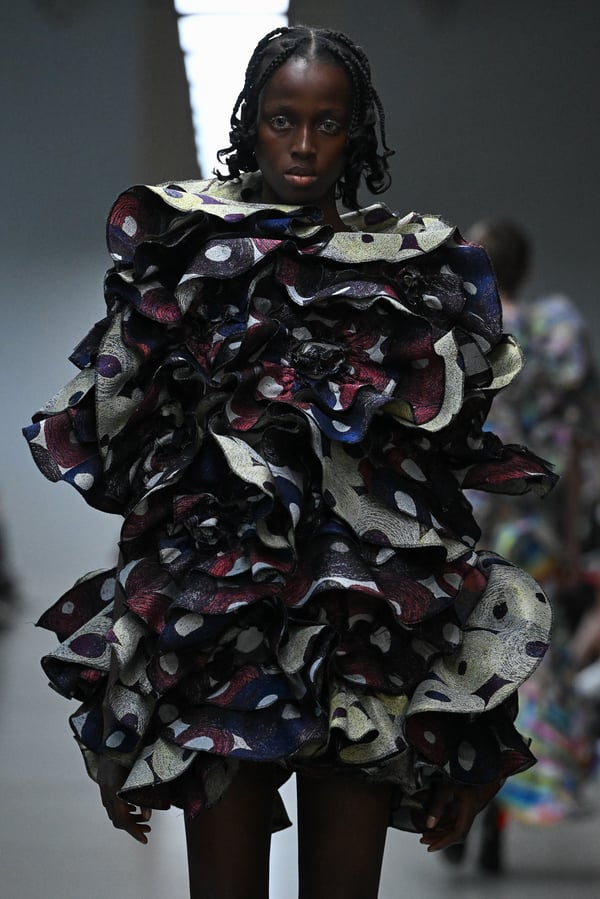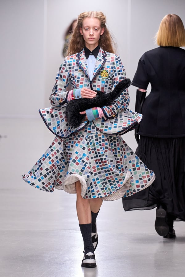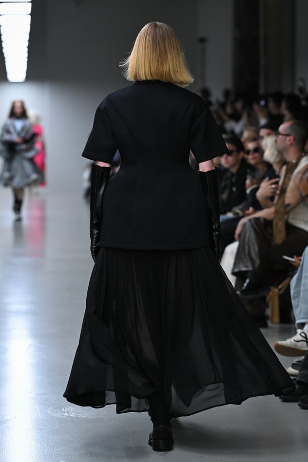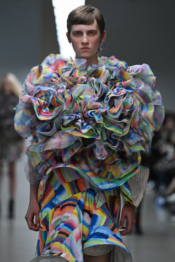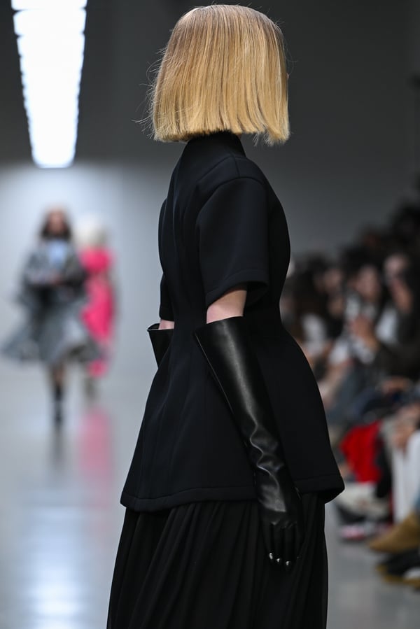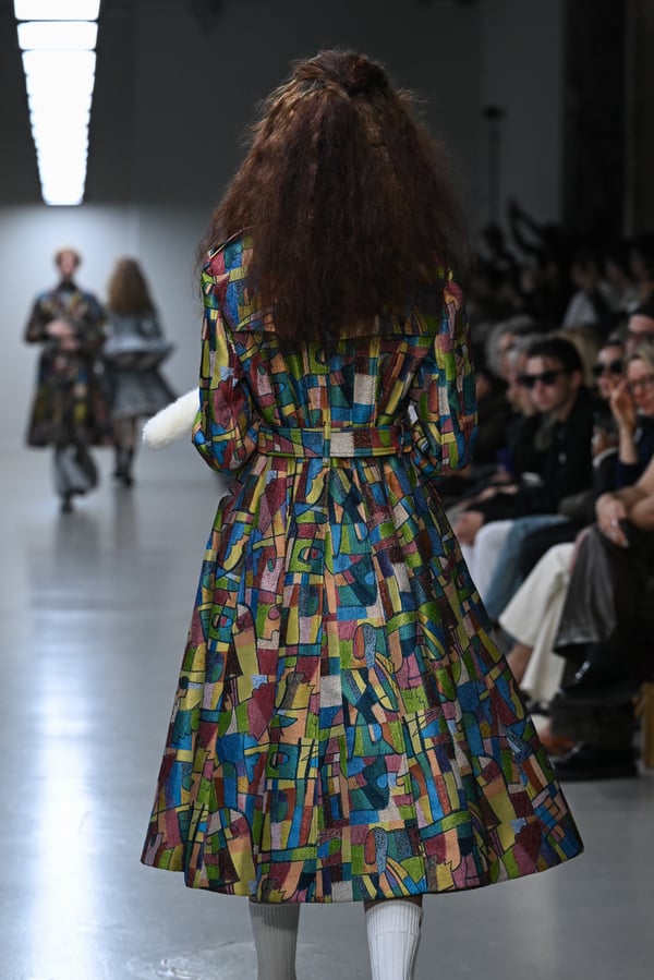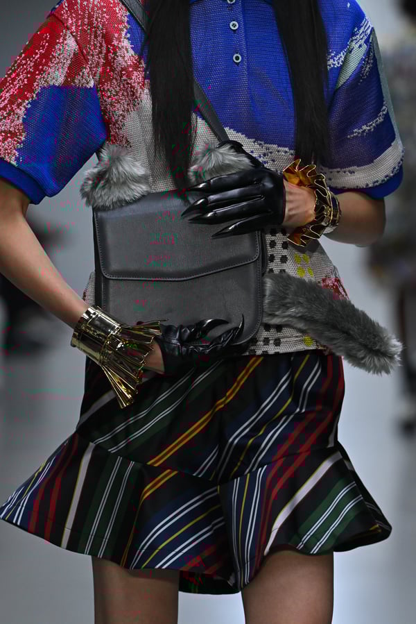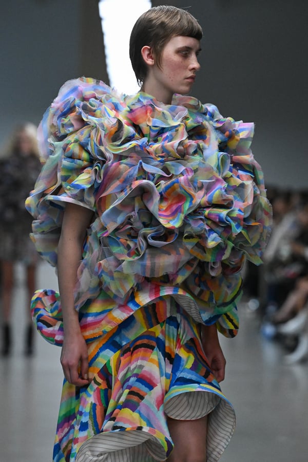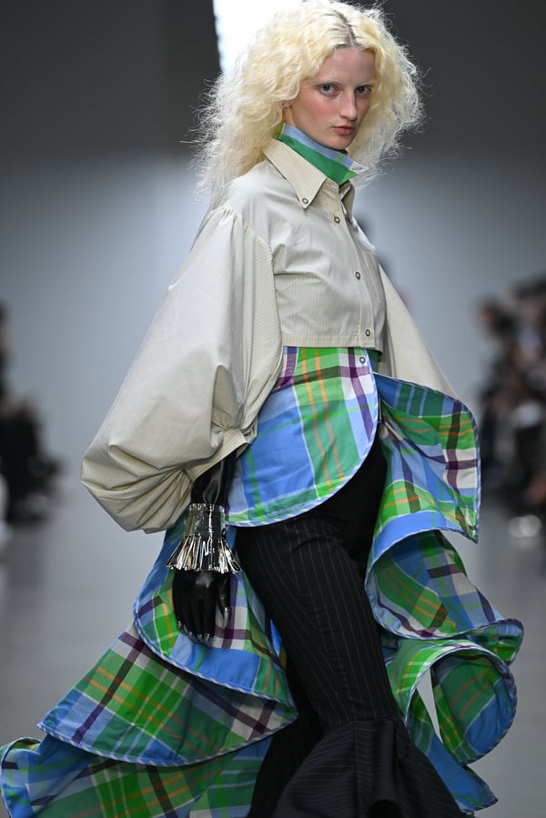 デザインにも生命のテーマを表現。フリルが鼓動するかのように揺れ動き、ラッフルやスカートのヘムラインは有機的な動きを見せた。クッション型セラピーロボットQooboを制作しているYukai Engineering Inc.と共同開発されたバッグは、撫でるとファーの尻尾が揺れる。服に命を吹き込み、生命の尊さと多様性をたたえた。