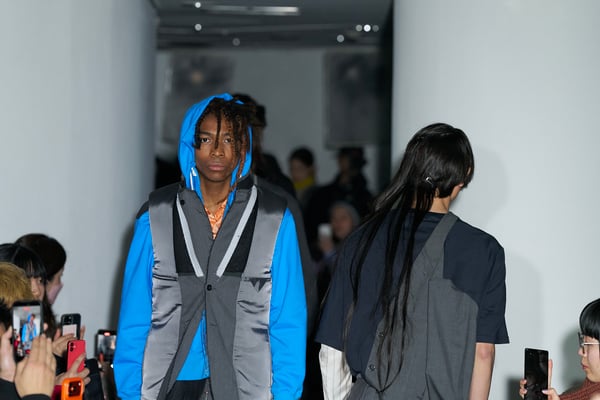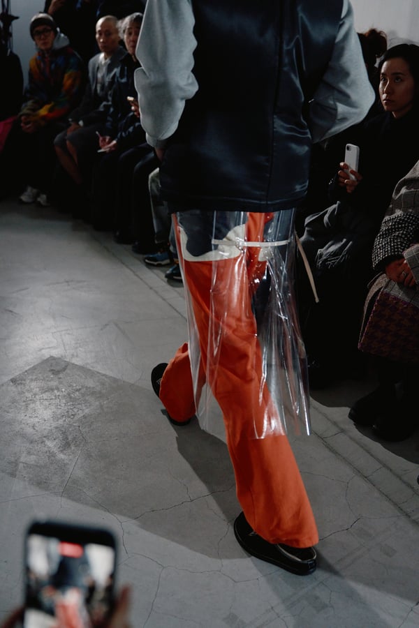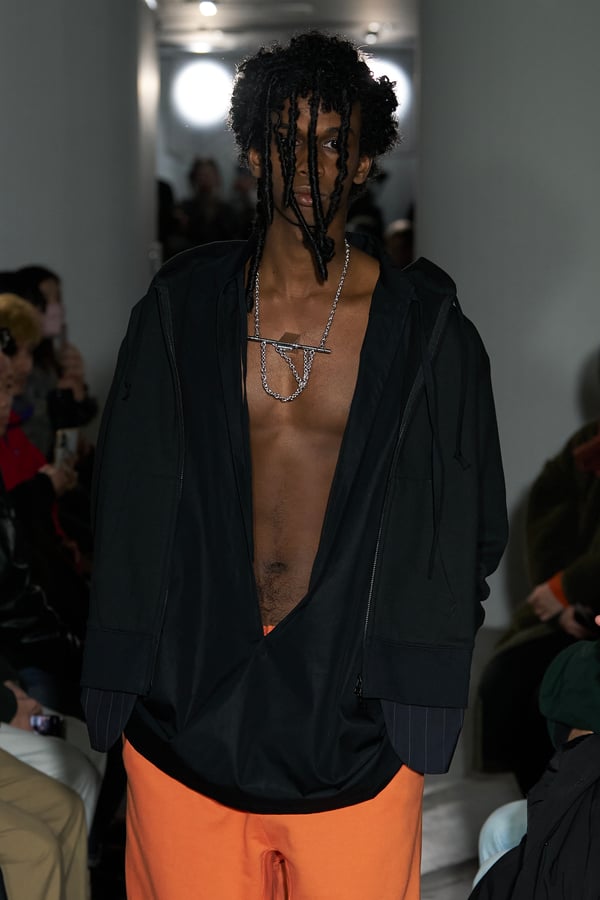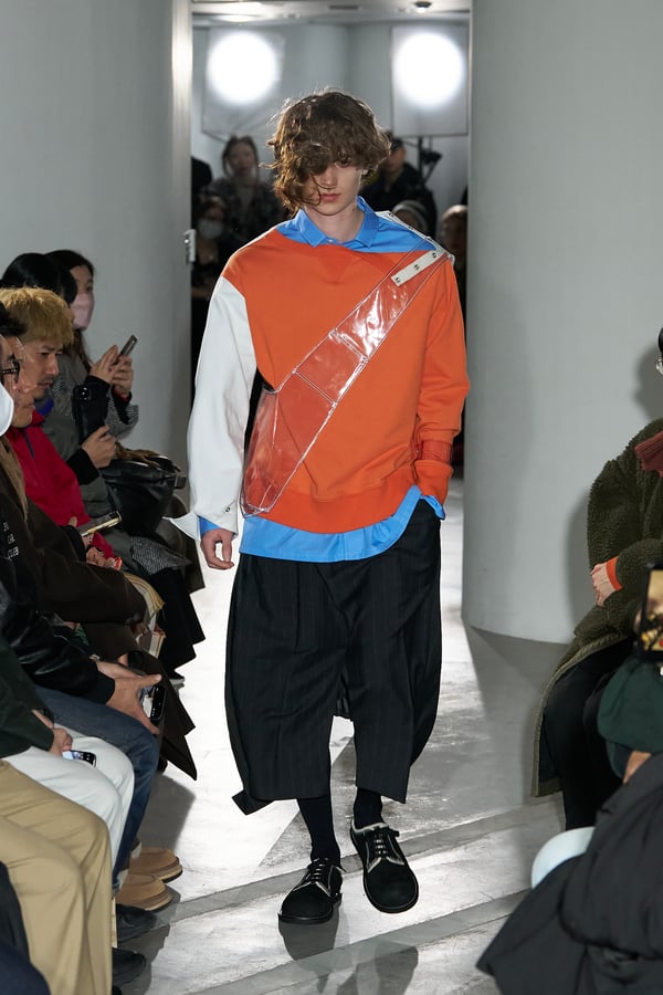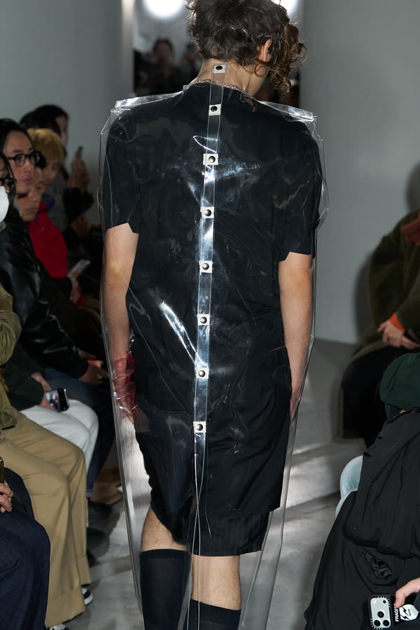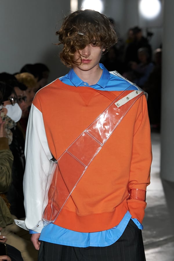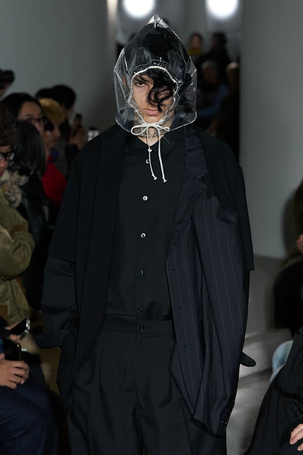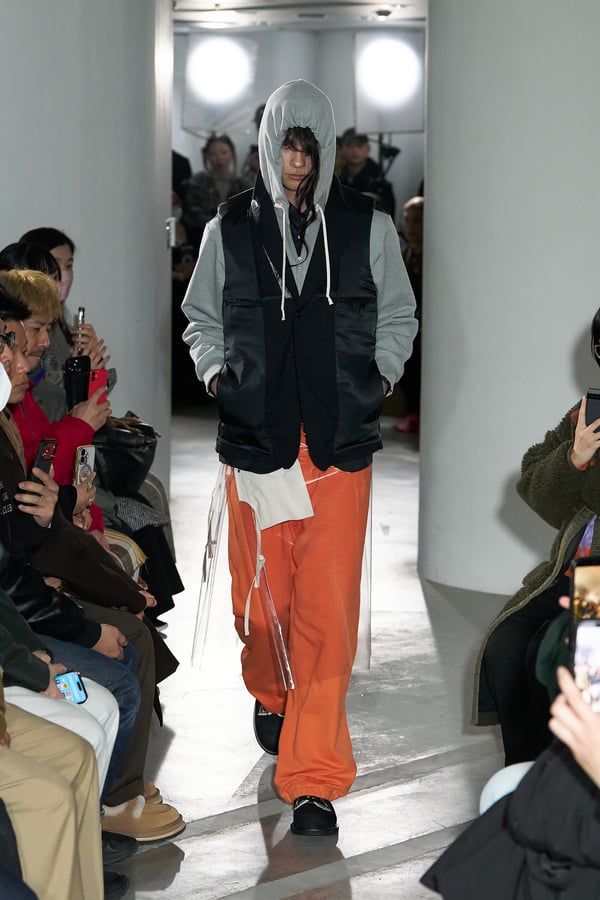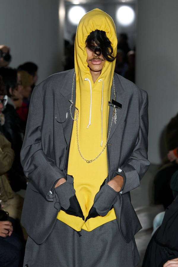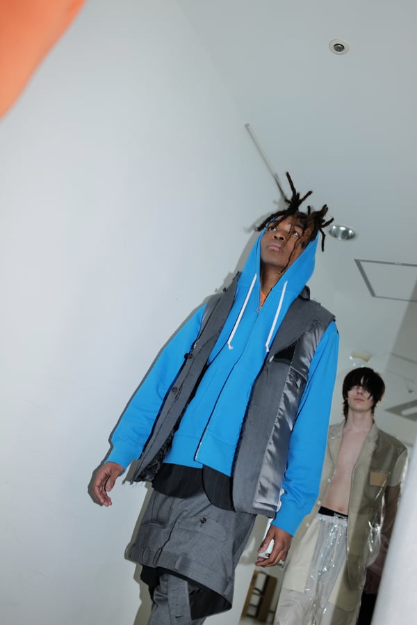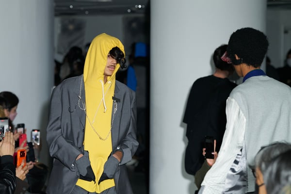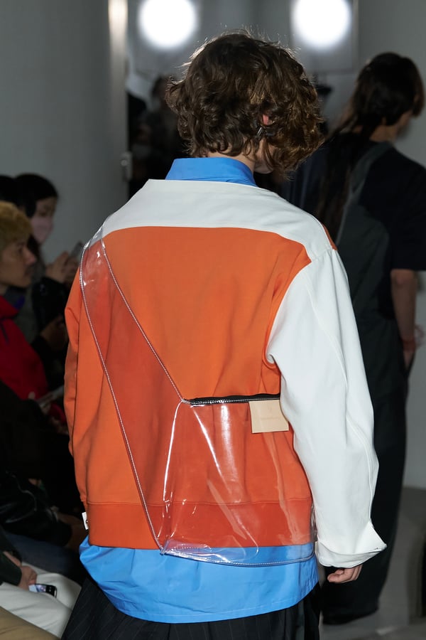 各ルックは、ブラックやグレーのスーツをベースに、Tシャツやフーディーをはじめとしたストリート要素や、オレンジ、イエロー、グリーン、ブルーといった原色やPVC素材のクリアカラーなどを多様な形で融合。「スーツ」というクラシックなアイテムを基調としながらも、重低音が軽快なリズムで響くBGMとも共鳴する、若々しくフレッシュなエネルギーと高揚感に満ちたコレクションを披露した。