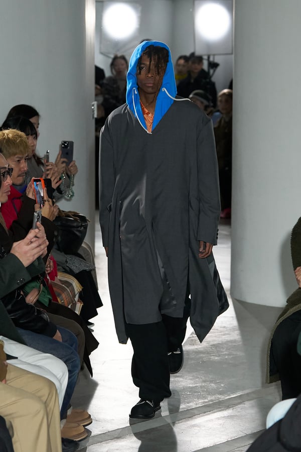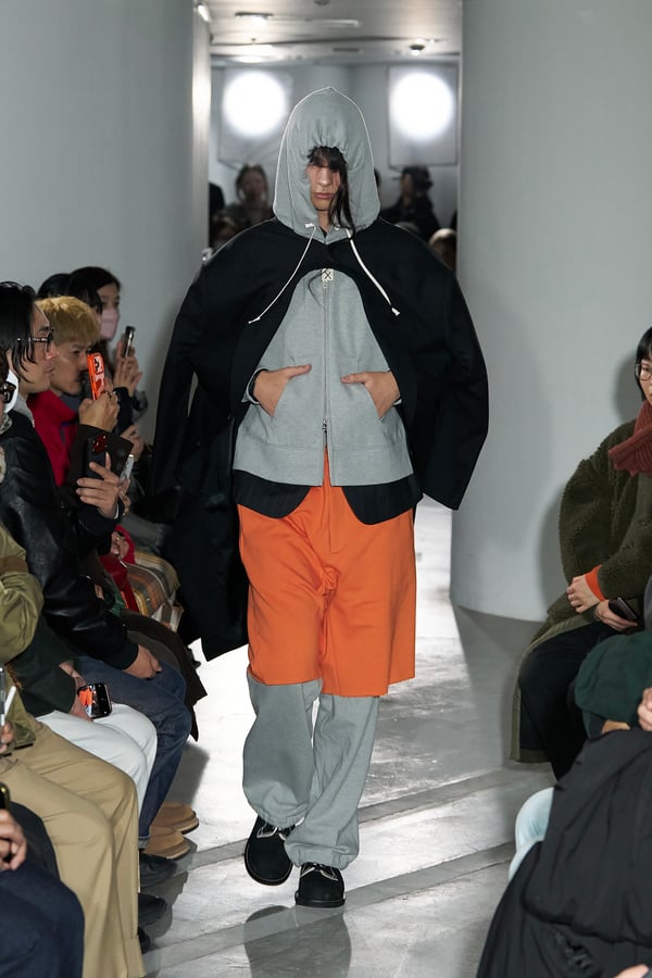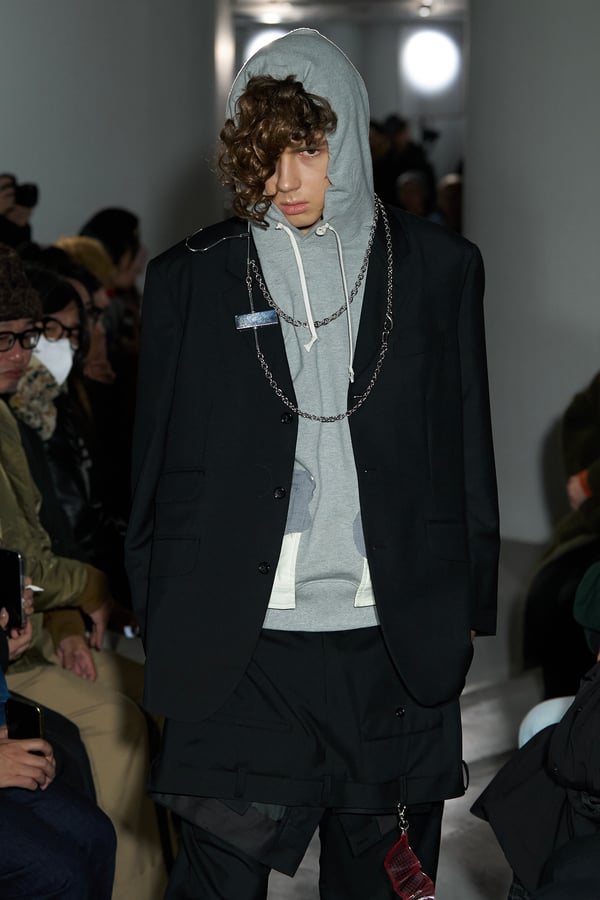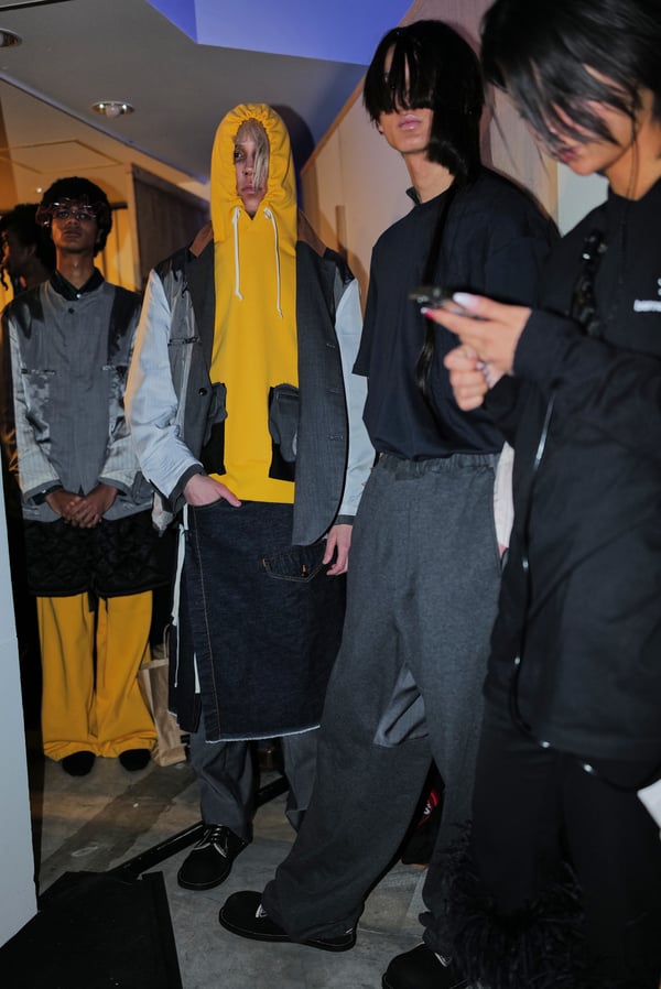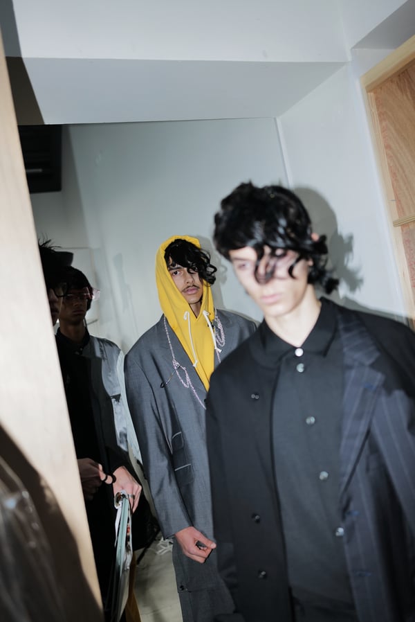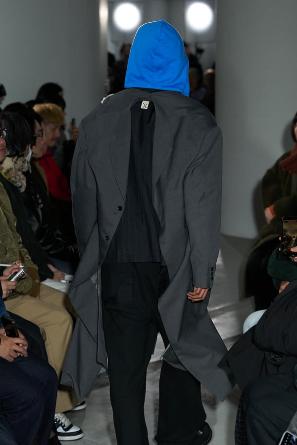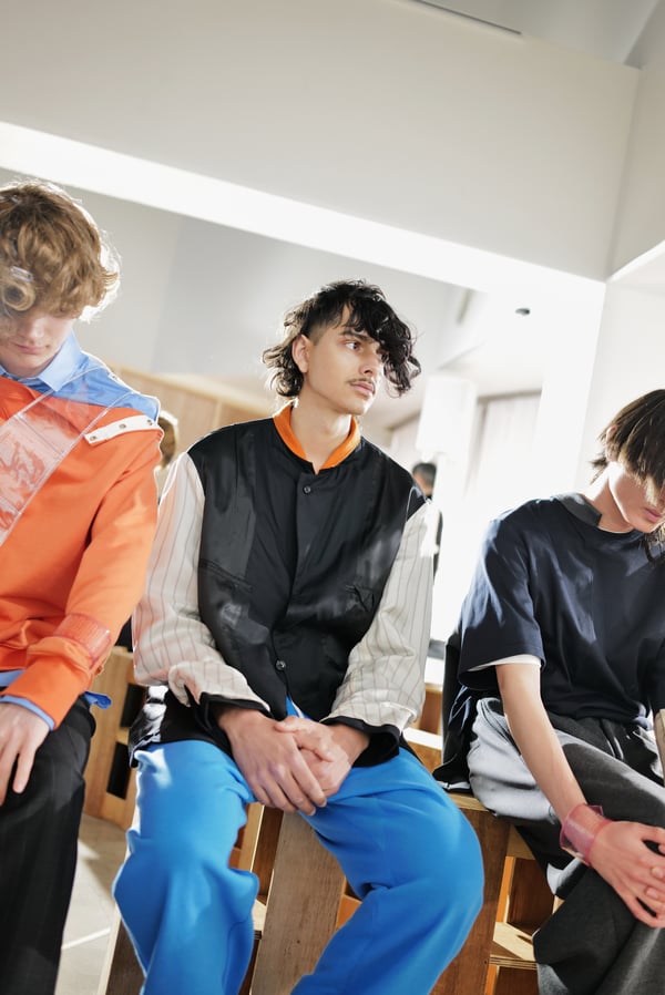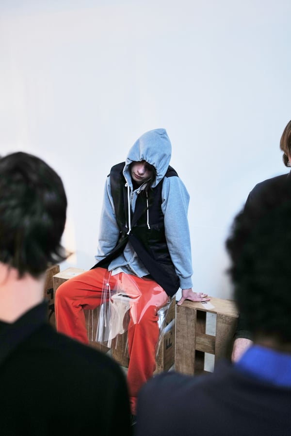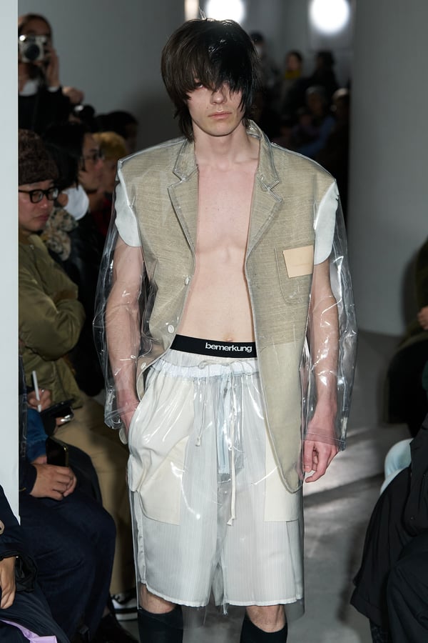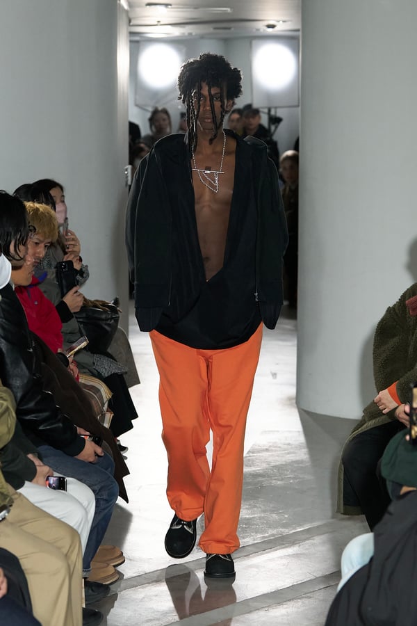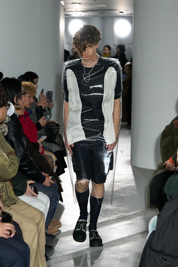 各ルックは、ブラックやグレーのスーツをベースに、Tシャツやフーディーをはじめとしたストリート要素や、オレンジ、イエロー、グリーン、ブルーといった原色やPVC素材のクリアカラーなどを多様な形で融合。「スーツ」というクラシックなアイテムを基調としながらも、重低音が軽快なリズムで響くBGMとも共鳴する、若々しくフレッシュなエネルギーと高揚感に満ちたコレクションを披露した。