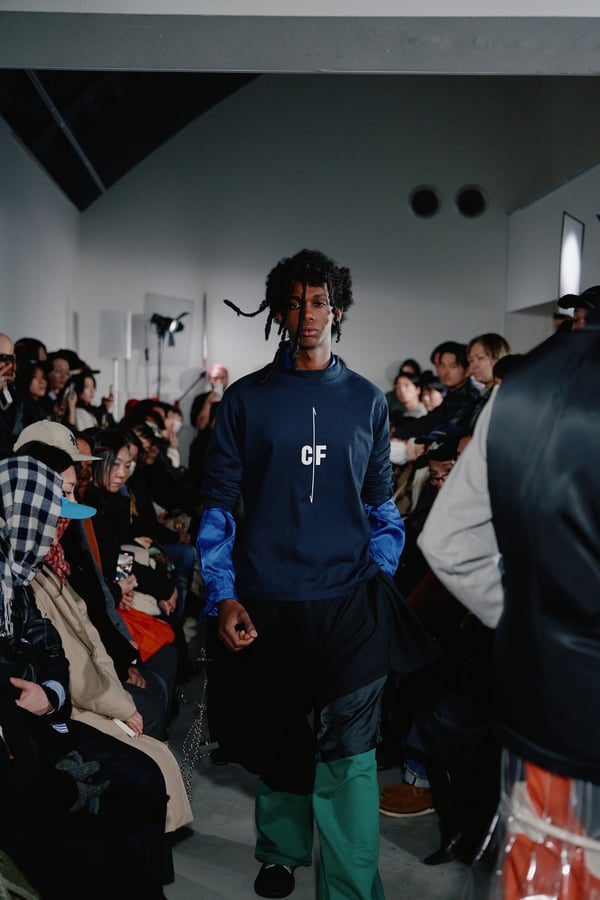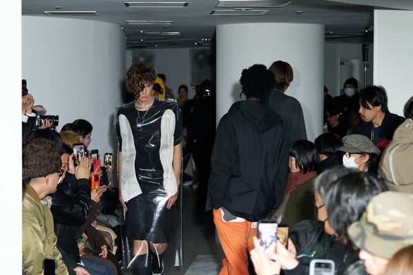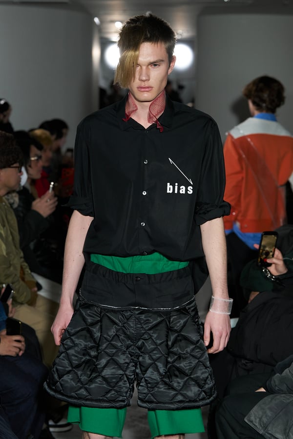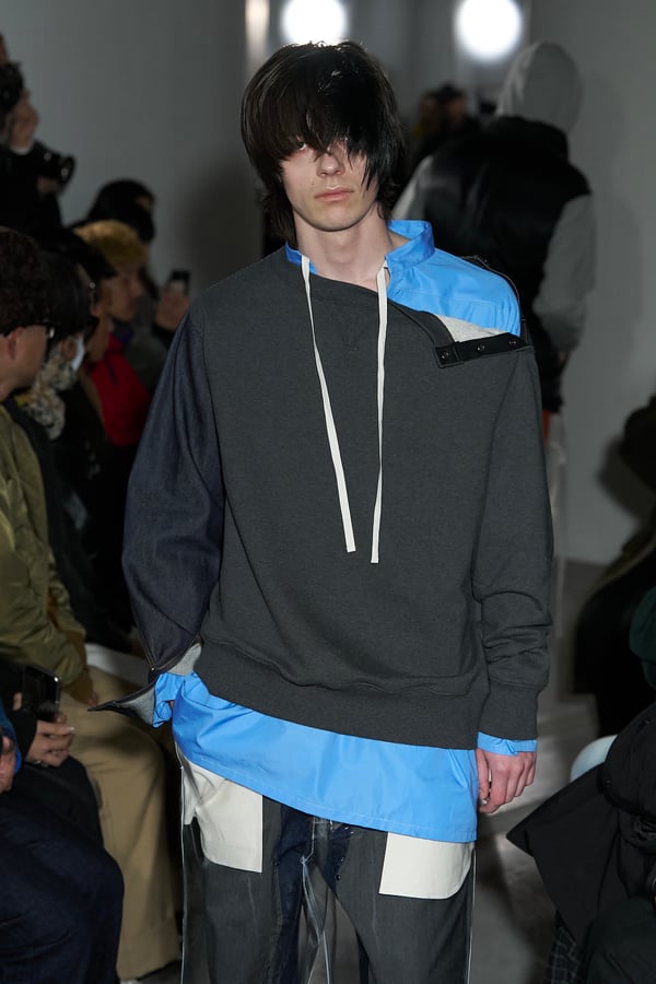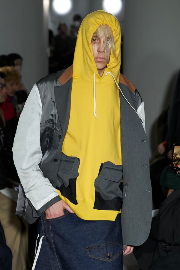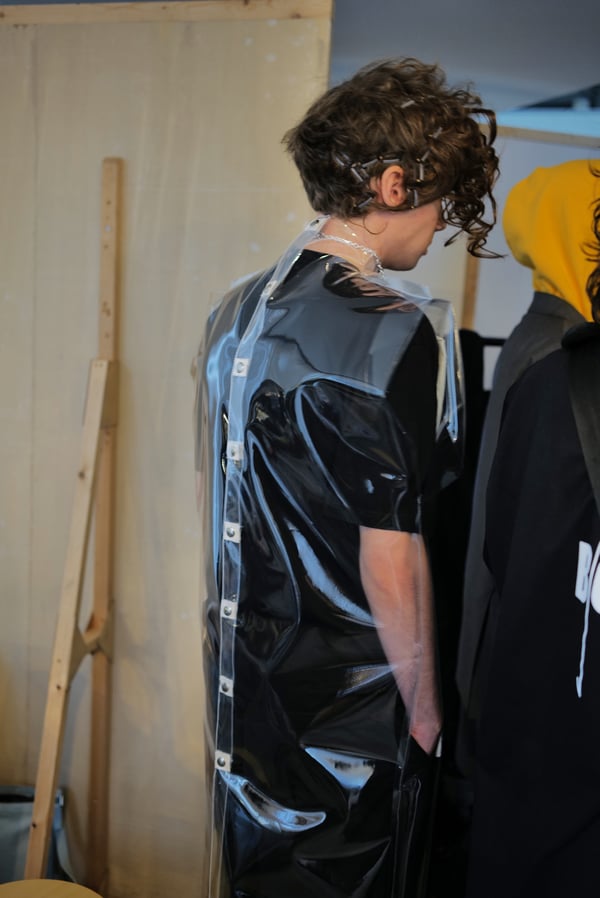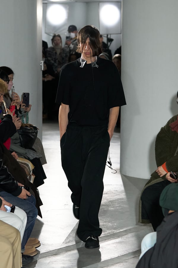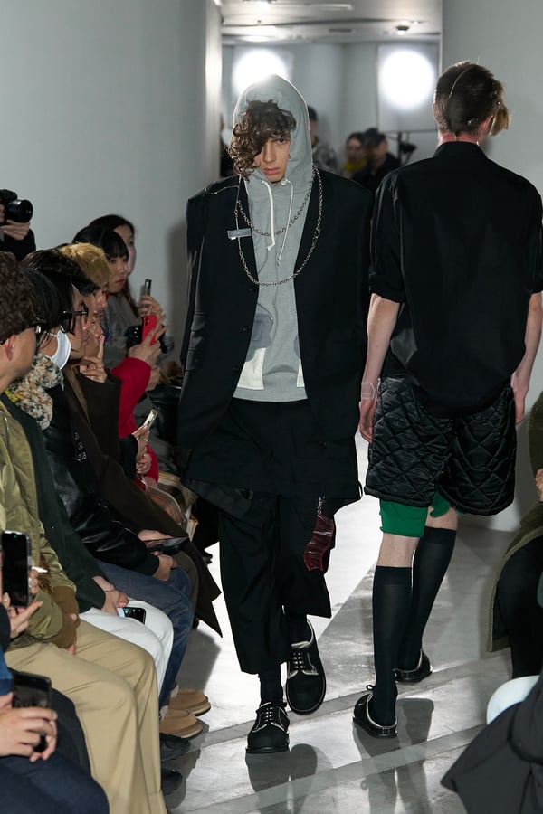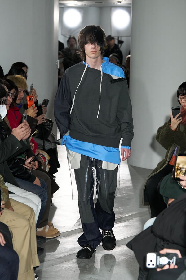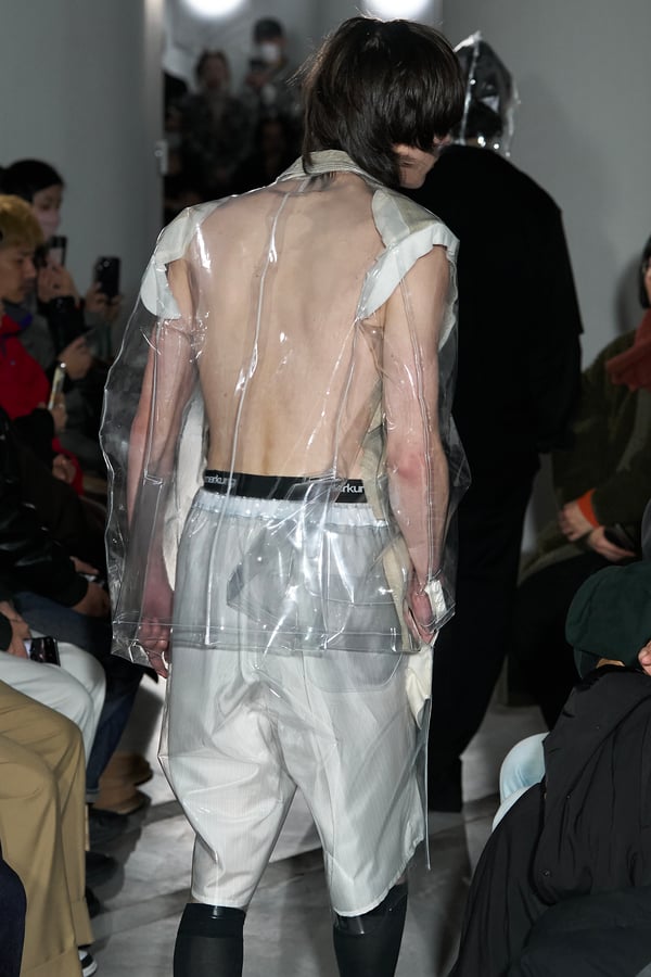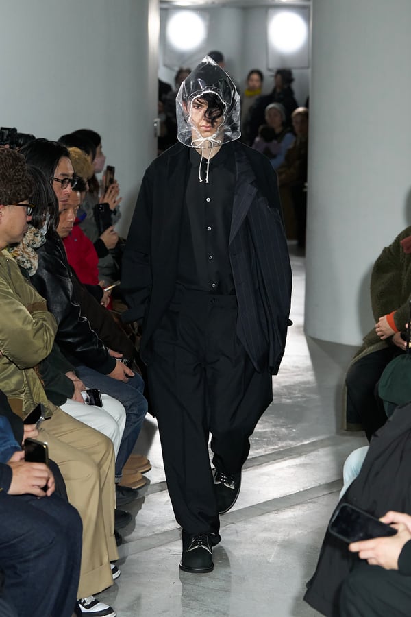 各ルックは、ブラックやグレーのスーツをベースに、Tシャツやフーディーをはじめとしたストリート要素や、オレンジ、イエロー、グリーン、ブルーといった原色やPVC素材のクリアカラーなどを多様な形で融合。「スーツ」というクラシックなアイテムを基調としながらも、重低音が軽快なリズムで響くBGMとも共鳴する、若々しくフレッシュなエネルギーと高揚感に満ちたコレクションを披露した。
