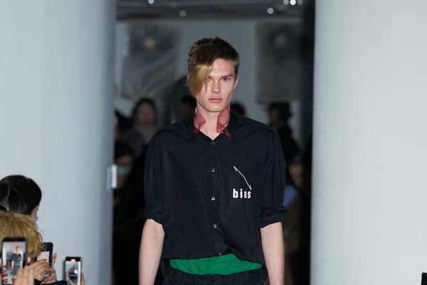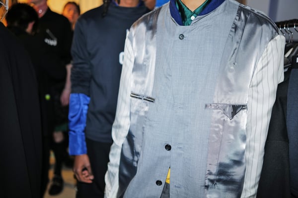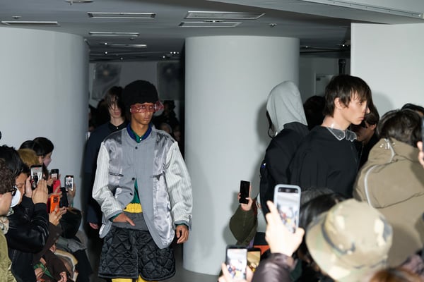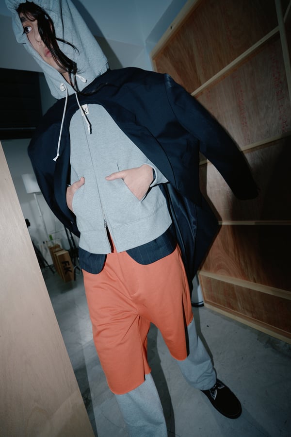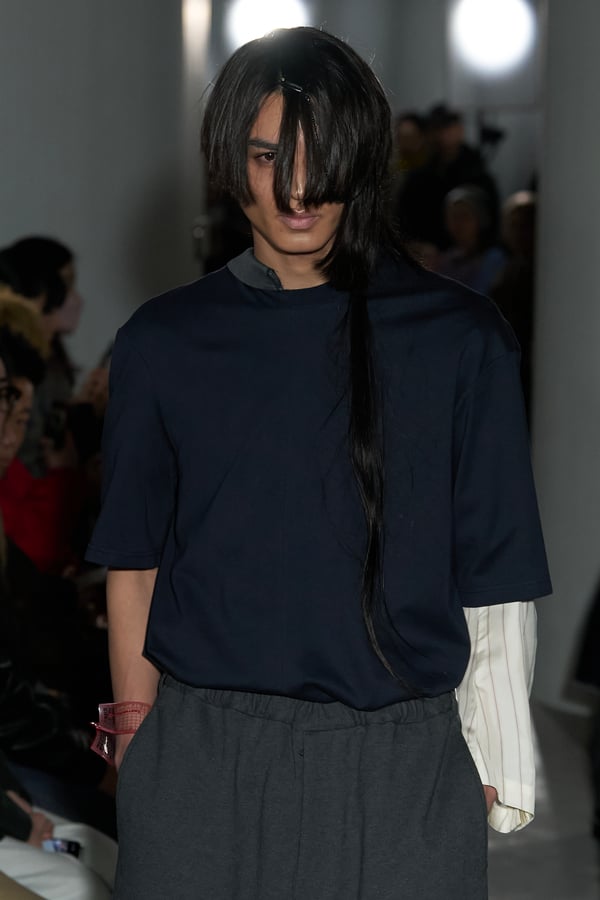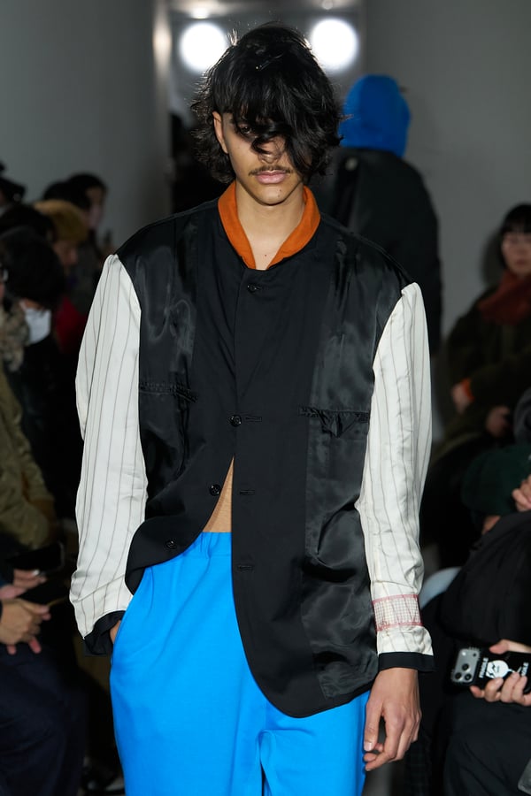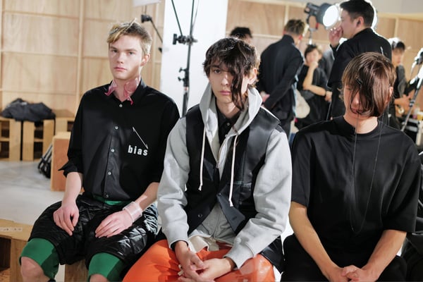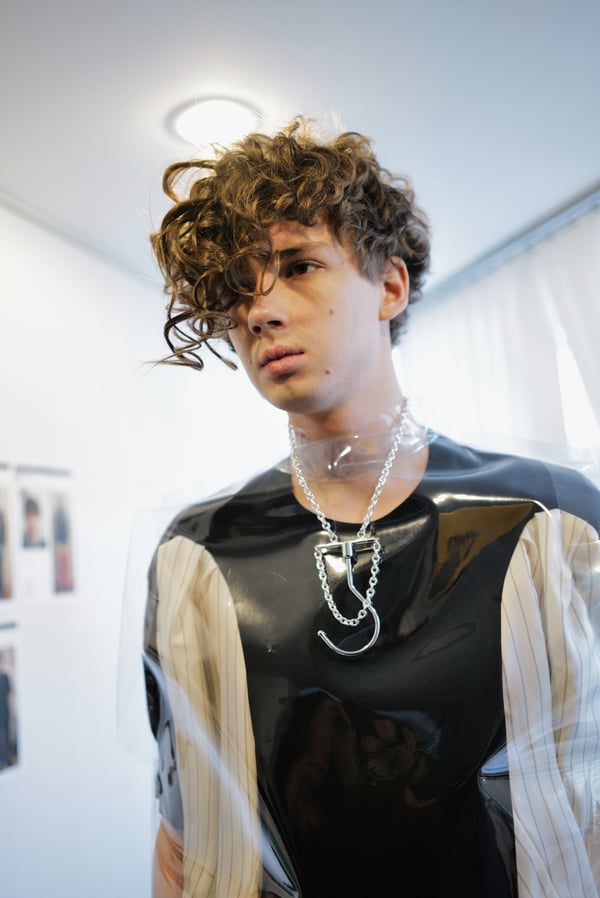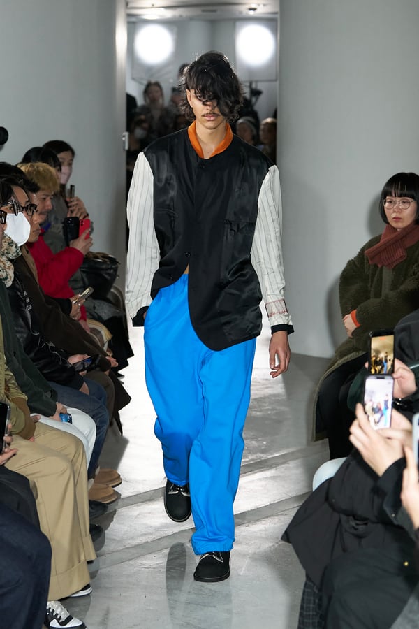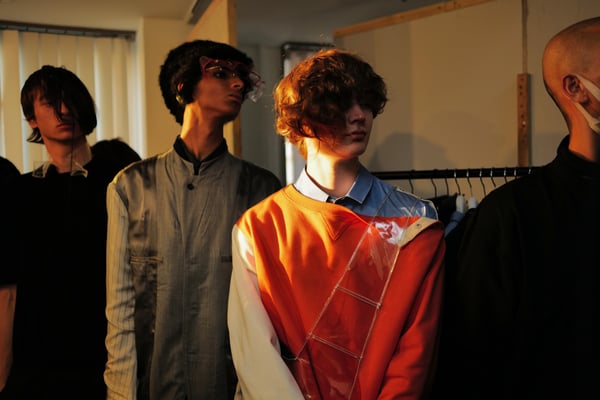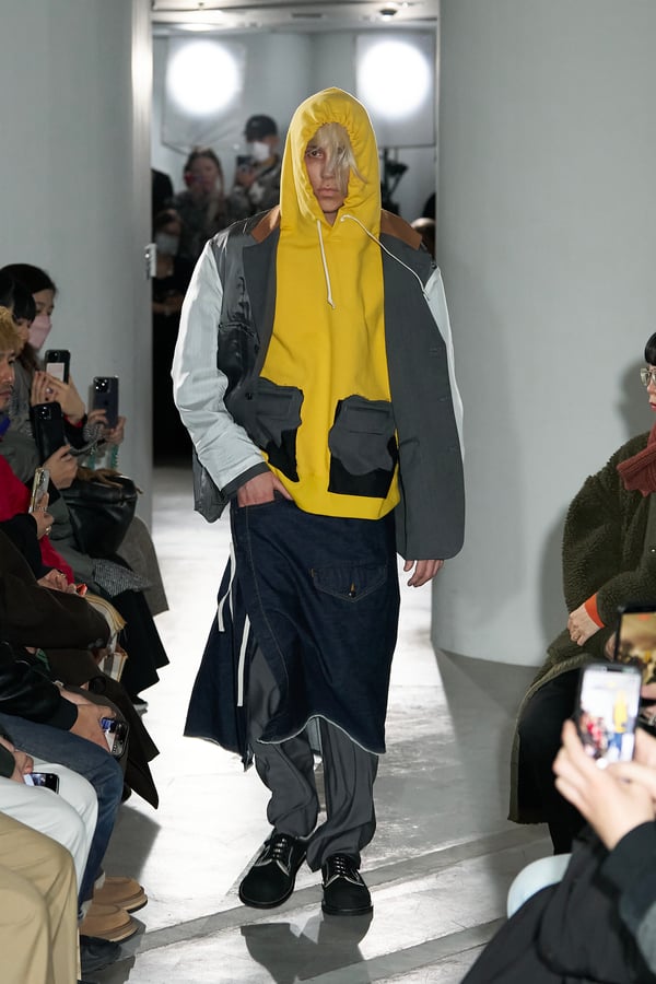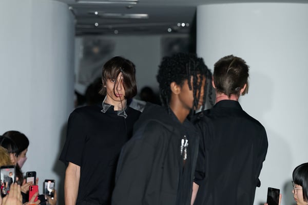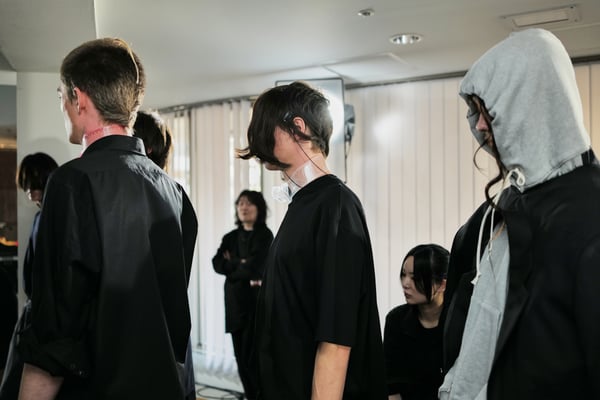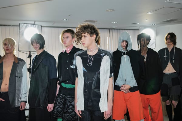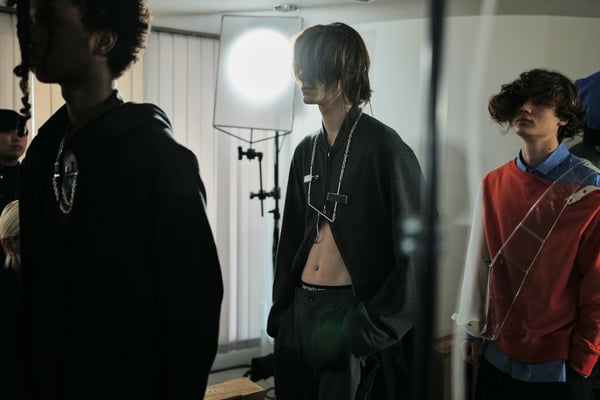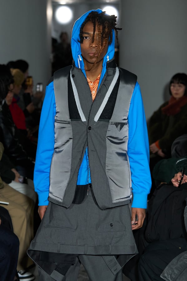 各ルックは、ブラックやグレーのスーツをベースに、Tシャツやフーディーをはじめとしたストリート要素や、オレンジ、イエロー、グリーン、ブルーといった原色やPVC素材のクリアカラーなどを多様な形で融合。「スーツ」というクラシックなアイテムを基調としながらも、重低音が軽快なリズムで響くBGMとも共鳴する、若々しくフレッシュなエネルギーと高揚感に満ちたコレクションを披露した。