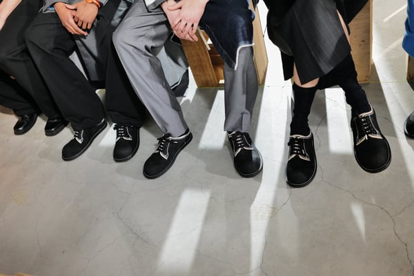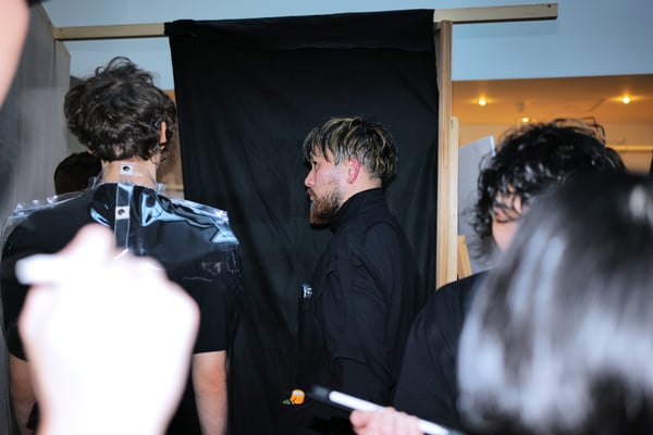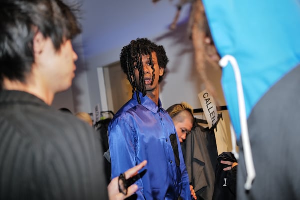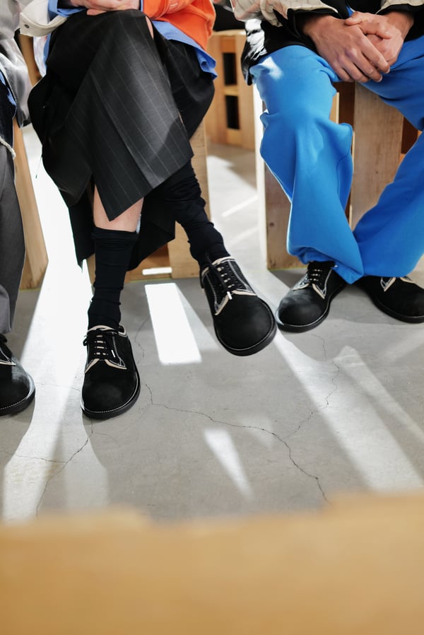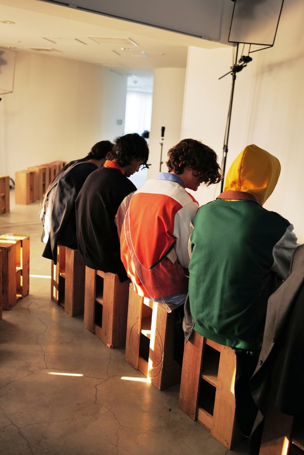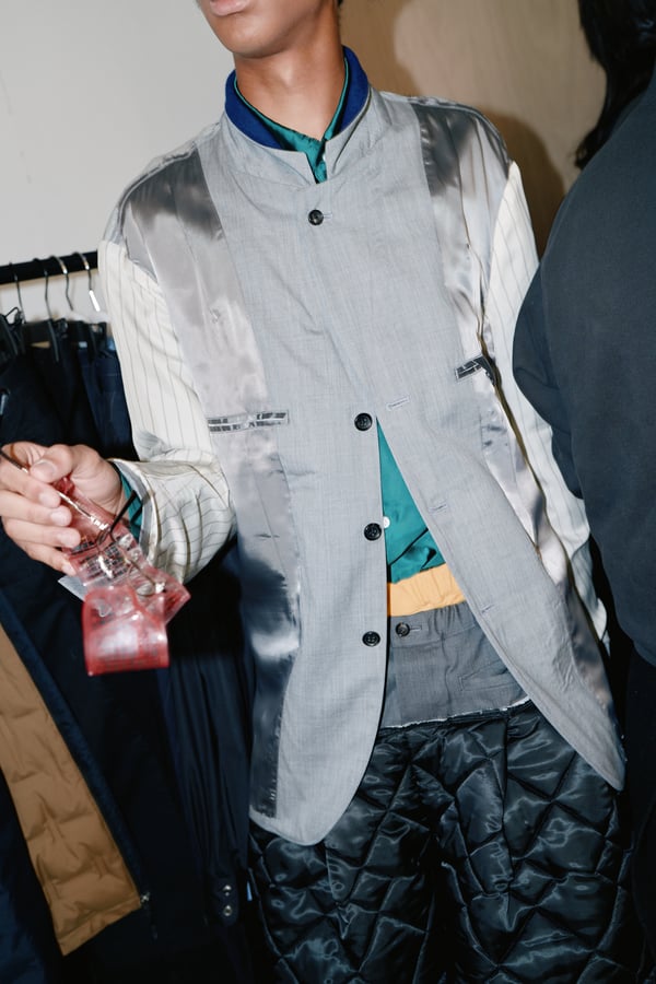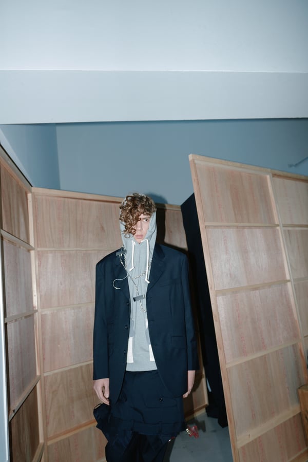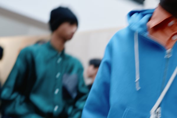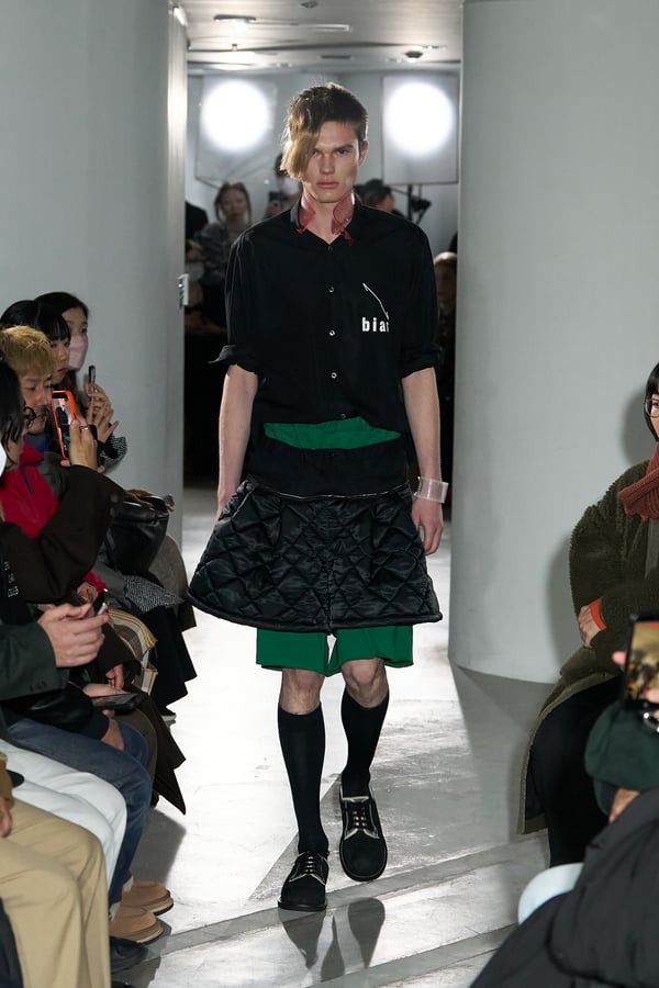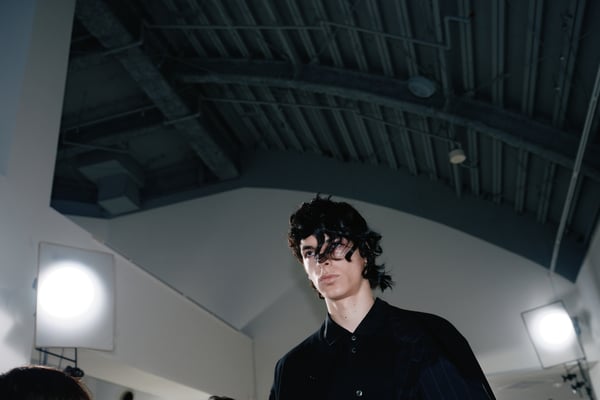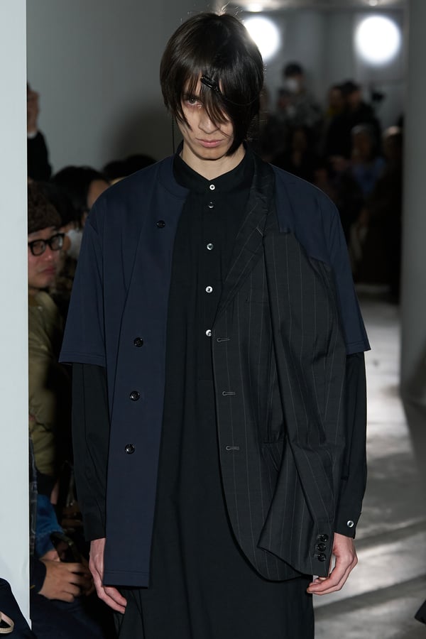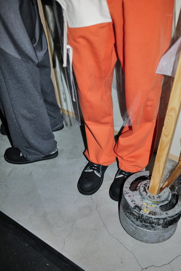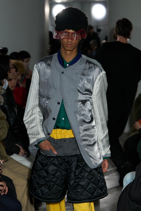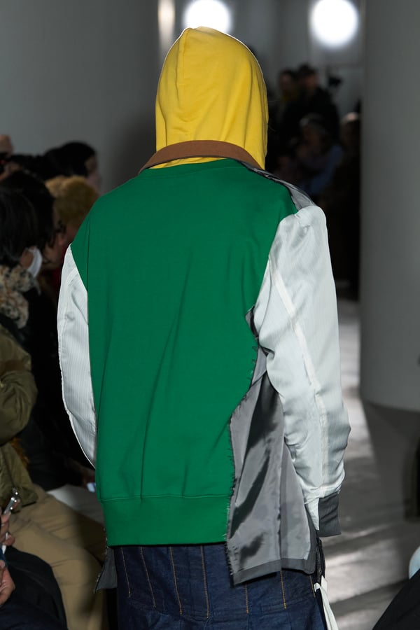 各ルックは、ブラックやグレーのスーツをベースに、Tシャツやフーディーをはじめとしたストリート要素や、オレンジ、イエロー、グリーン、ブルーといった原色やPVC素材のクリアカラーなどを多様な形で融合。「スーツ」というクラシックなアイテムを基調としながらも、重低音が軽快なリズムで響くBGMとも共鳴する、若々しくフレッシュなエネルギーと高揚感に満ちたコレクションを披露した。