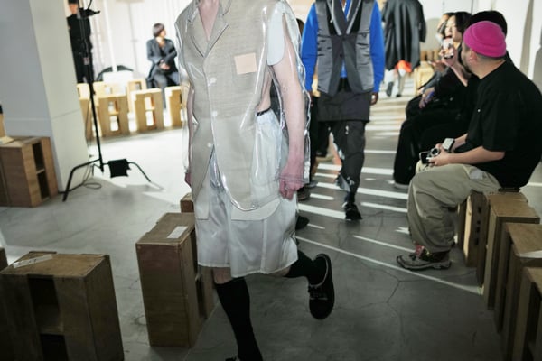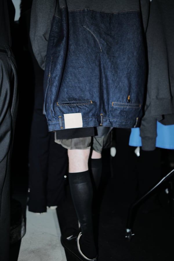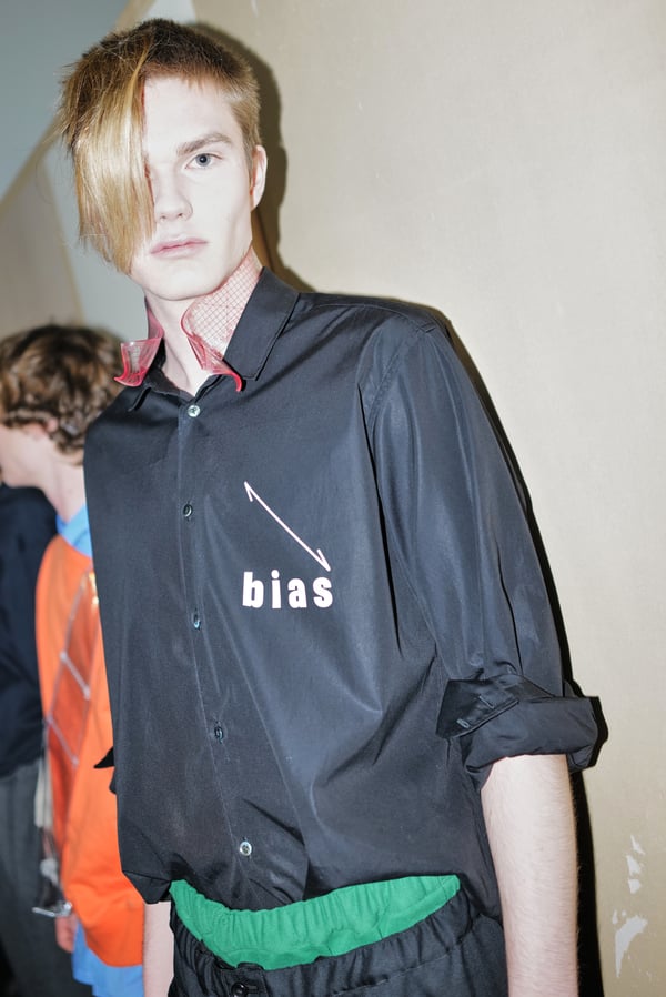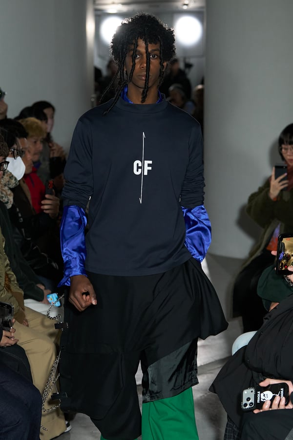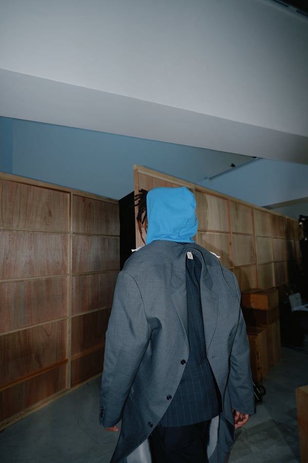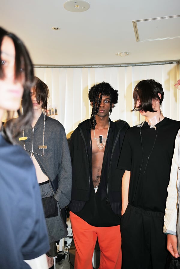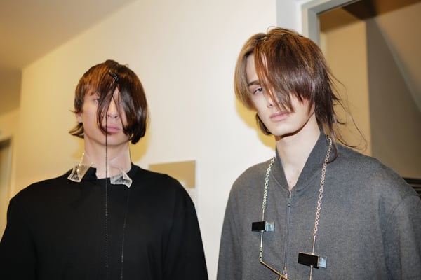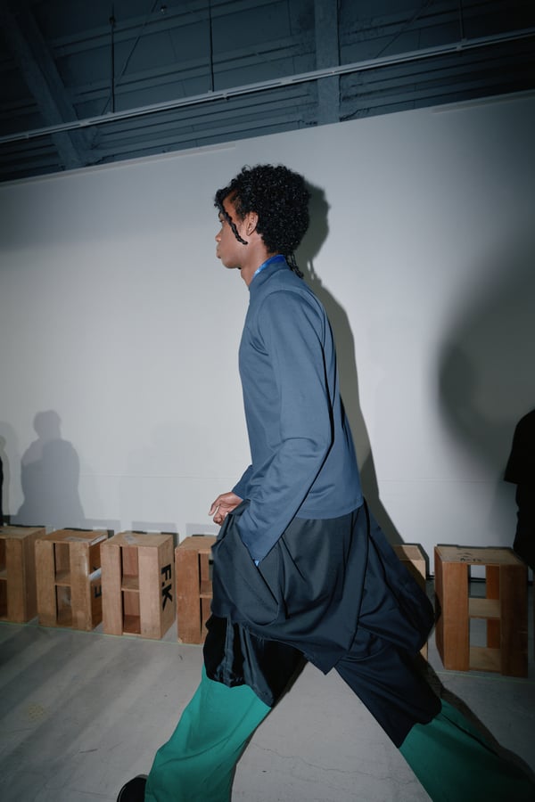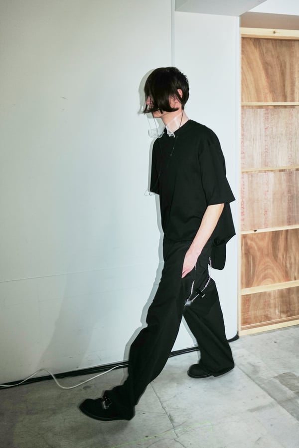 デビューから3シーズン目となる今回、同氏がコレクションのテーマに据えたのは、「視点の転換」。元々ある衣服の本来は縦になっているものを横に、裏を表に、上を下にといったデザインや構造、素材の実験的な転換や発展を行い、「普段見ているようで見ていない視点からものを作ることを目指した」という。