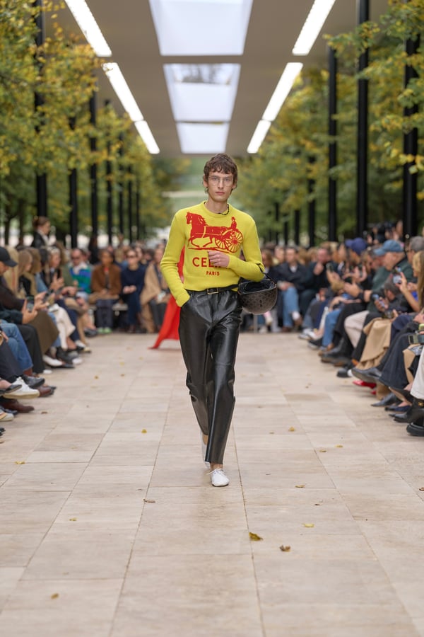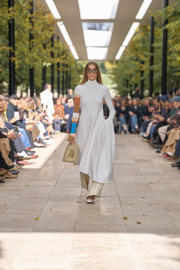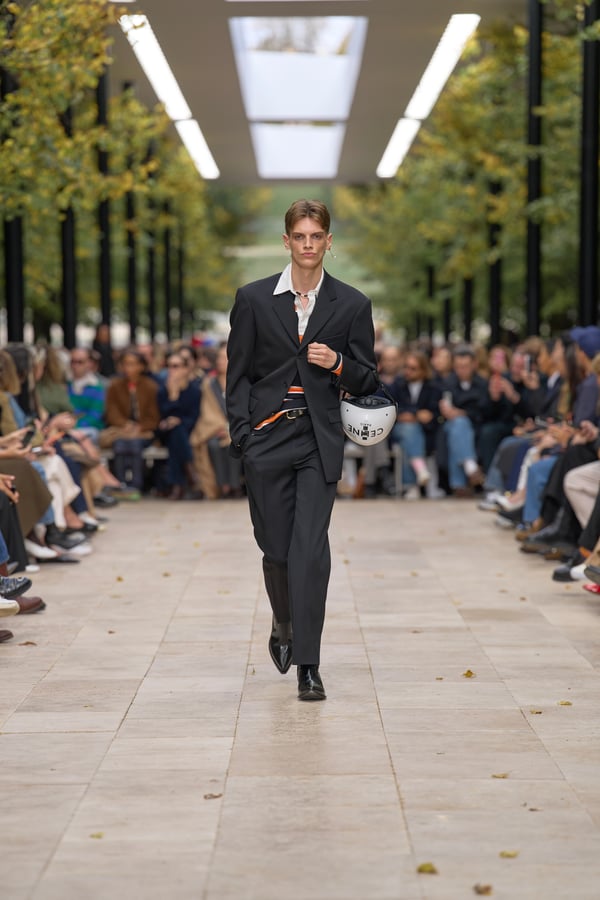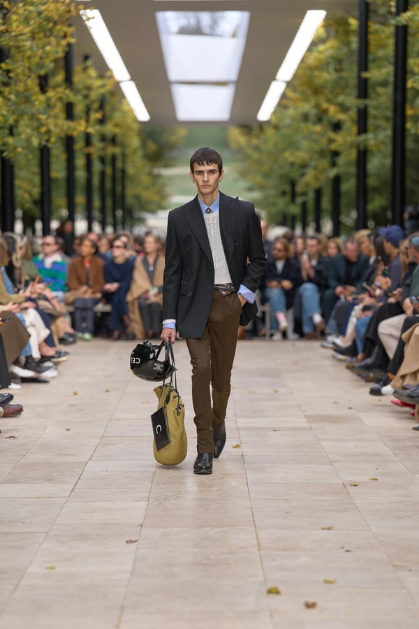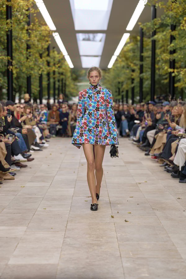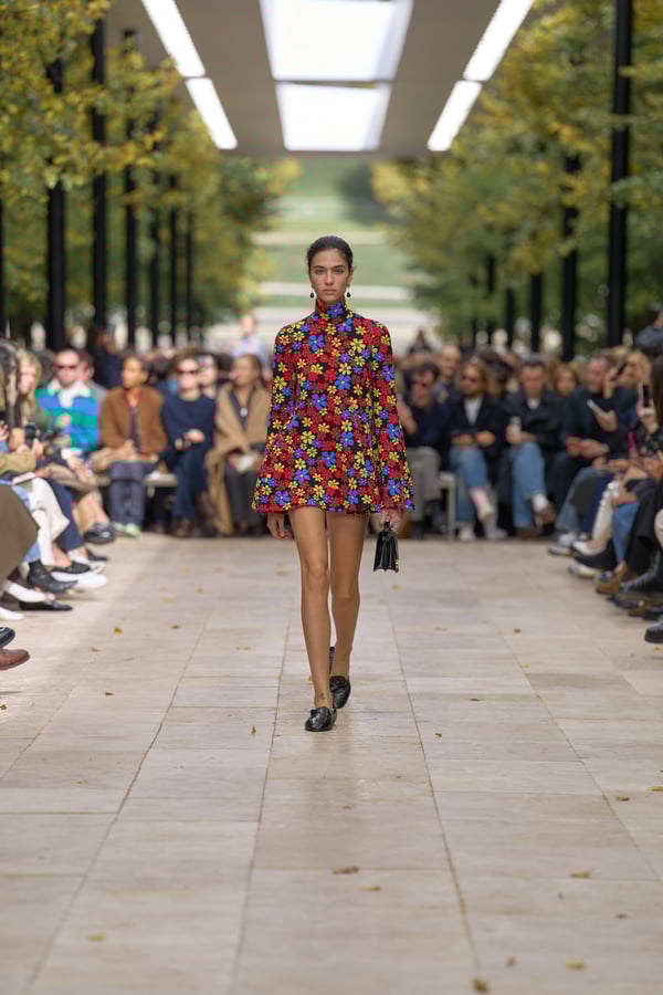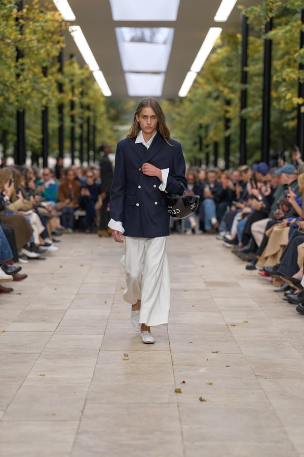 マイケル・ライダー(Michael Rider)による「セリーヌ(CELINE)」2026年サマーコレクションは、秋色に染まり始めた木々が揺れるパリ郊外のサン=クルー公園で披露された。前回7月に発表したデビューシーズンのスプリングコレクションからの“継続”とし、シルクスカーフや自転車のヘルメットなど、ブランドを象徴するアイテムが新たな解釈で登場。60年代風の花柄ミニドレスやショルダーパッドを効かせたジャケット、シルキーな素材のラグビーシャツなどが並び、鮮やかなスカーフをアクセントに都会的で洗練されたウェアラブルスタイルが披露された。