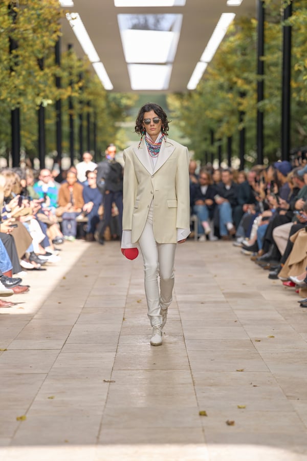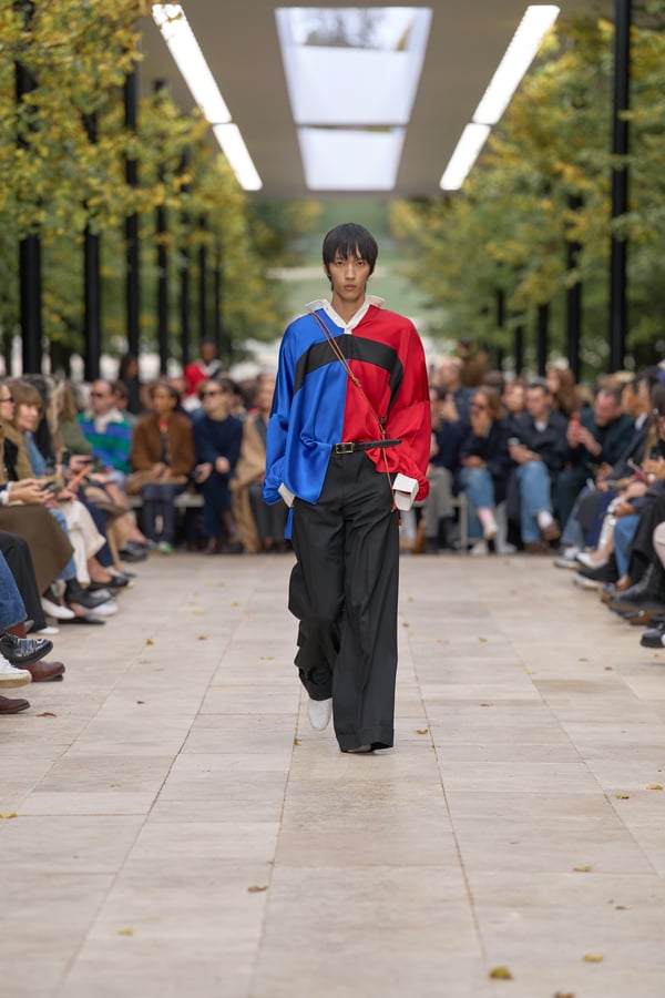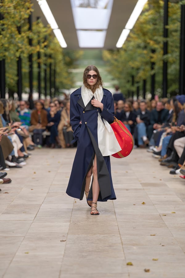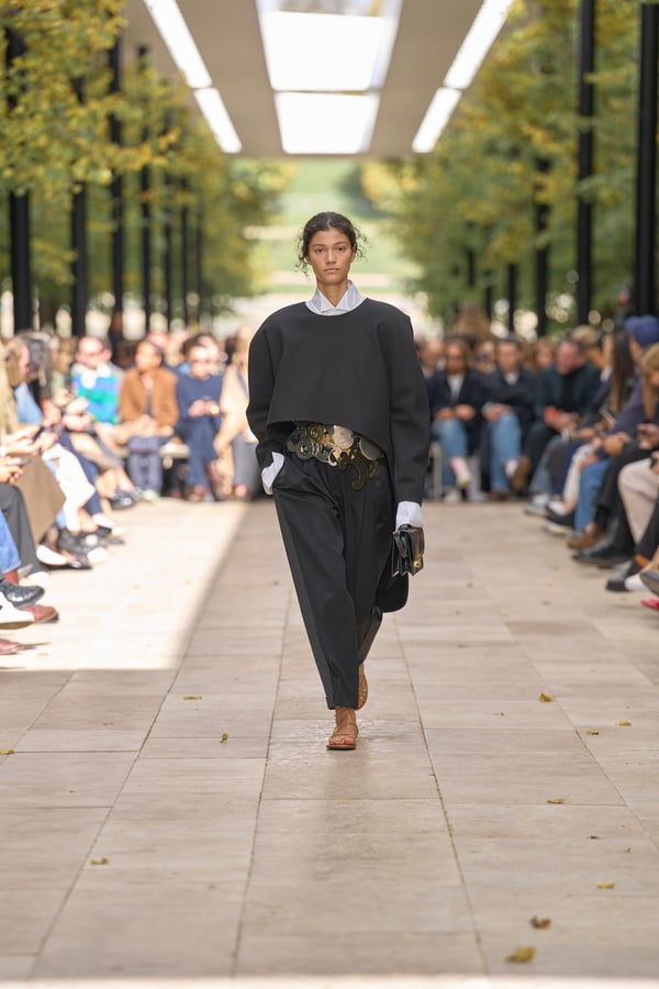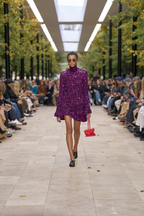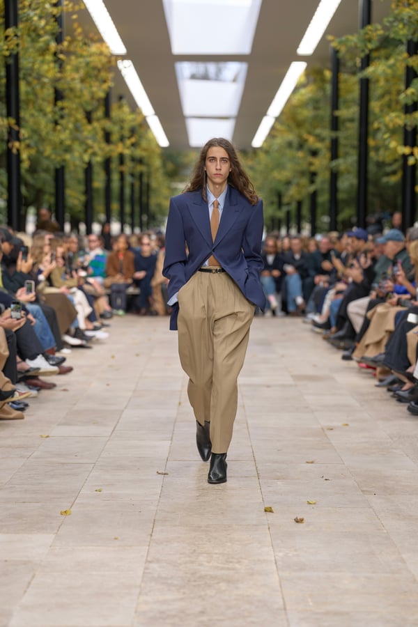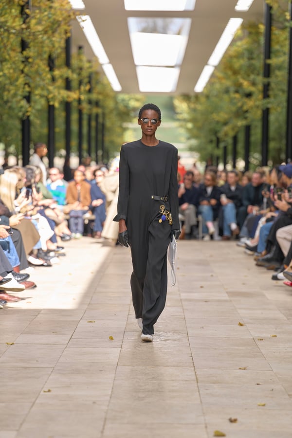 マイケル・ライダー(Michael Rider)による「セリーヌ(CELINE)」2026年サマーコレクションは、秋色に染まり始めた木々が揺れるパリ郊外のサン=クルー公園で披露された。前回7月に発表したデビューシーズンのスプリングコレクションからの“継続”とし、シルクスカーフや自転車のヘルメットなど、ブランドを象徴するアイテムが新たな解釈で登場。60年代風の花柄ミニドレスやショルダーパッドを効かせたジャケット、シルキーな素材のラグビーシャツなどが並び、鮮やかなスカーフをアクセントに都会的で洗練されたウェアラブルスタイルが披露された。