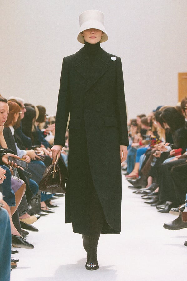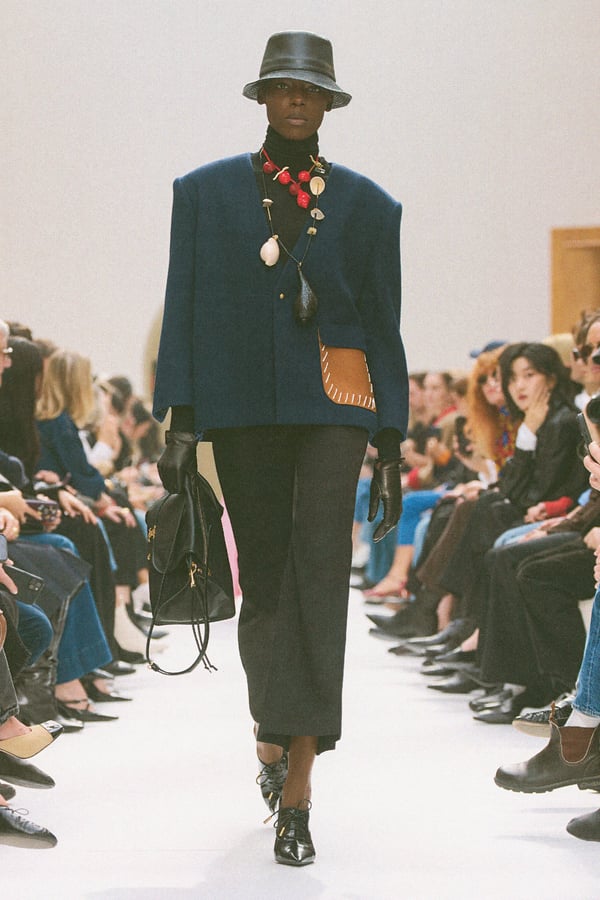 マイケル・ライダー(Michael Rider)による「セリーヌ(CELINE)」2026年秋冬は、前季までのプレッピーなムードを引き継ぎながら、より身体に近いシャープなラインを中心にコレクションを構成した。丸みのある肩線のジャケットやコート、ボディに沿うテーラリング、フレアパンツがつくる縦長のシルエットを軸に、緊張と解放の抑揚を取り入れたルックが多数登場。クラシックをベースにしながらもミニマルに寄りすぎず、ハットやフェザーのヘッドピース、立体的なスカーフで少しの違和感や個性を潜ませるスタイリングが印象的だった。会場は服の輪郭や素材感を自然光の下で見せたいというデビューコレクションからのライダーの希望で、光を取り込むスペースで開催。さらに、デザイナー マテオ・ガルシア(Mateo Garcia)によるステレオをセットの一部に組み込んだ空間構成も相まって、"音を着る"ような感覚や、視覚だけにとどまらない五感的な体験へとつなげた。小物では、細長いレクタングルサイズのトリオバッグやソフトトリオンフも登場し、今季のワードローブに実用と新鮮さを加えていた。