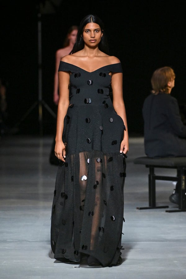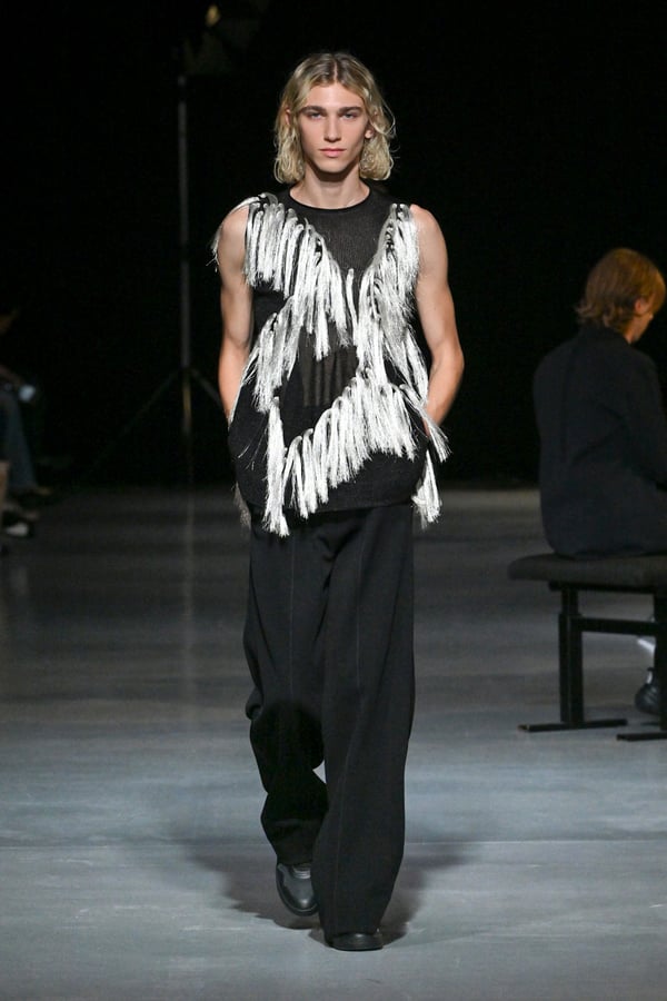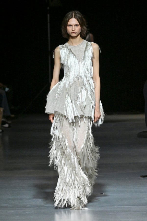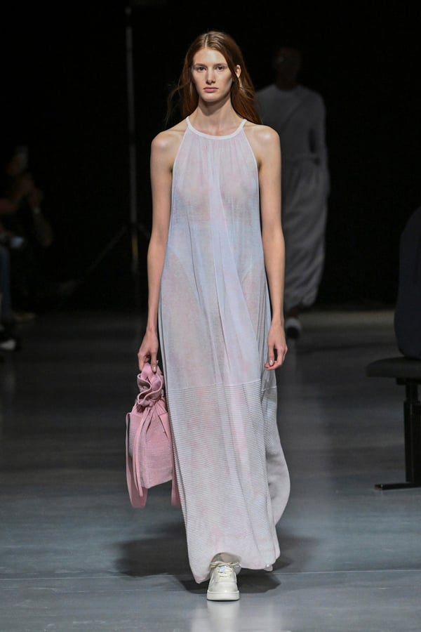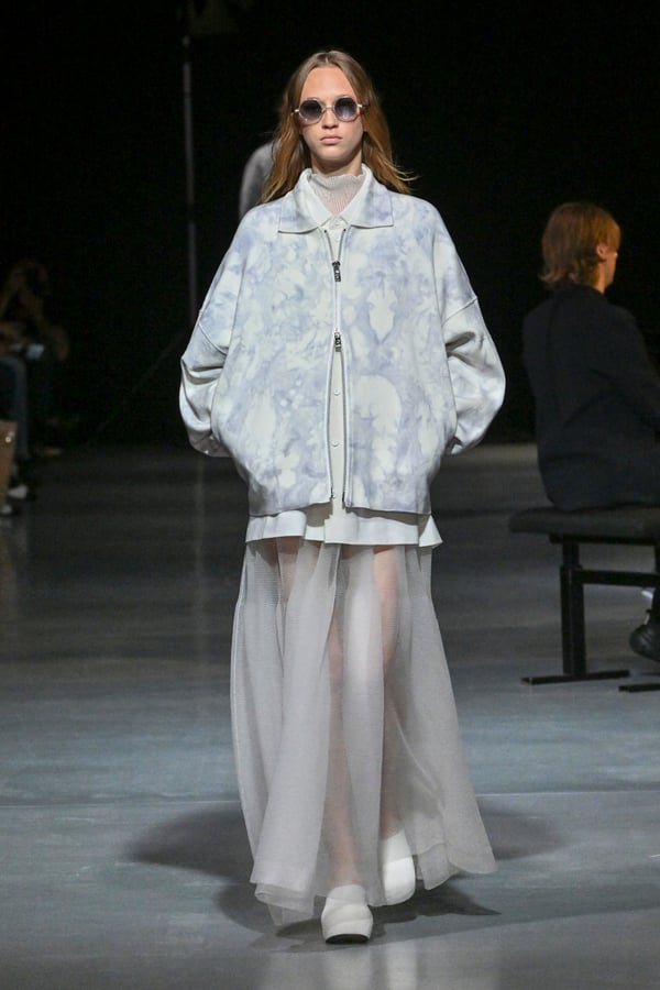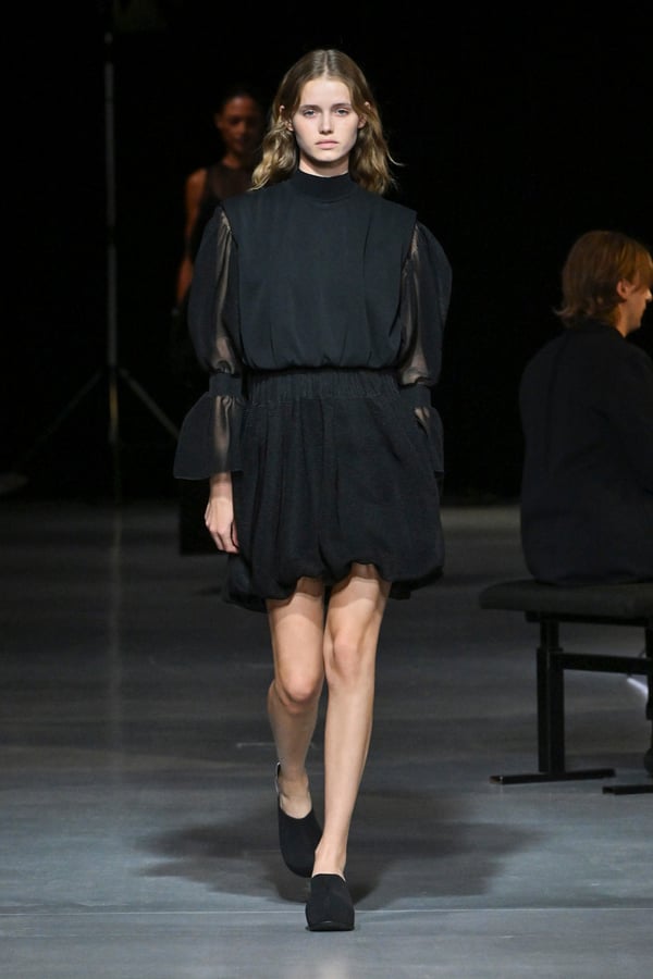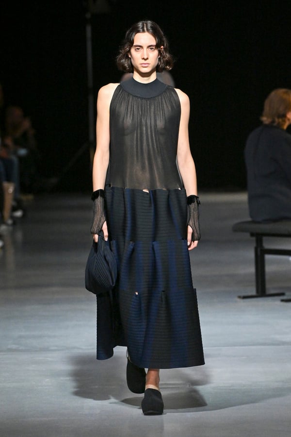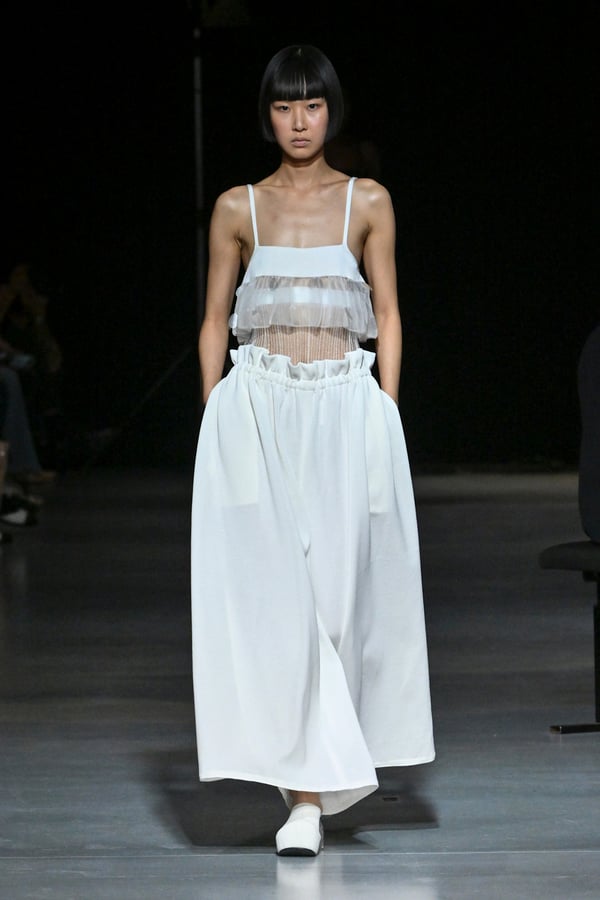 アイコニックなPOTTERYシリーズは、アーティスト森万里子やガラス作家エミール・ガレの作品を着想源に、空気をはらんで透けるドレスにアップデート。後半は、マシーンで編み上げたニットドレスに手作業で施したタッセル状のパーツが印象的に揺らめいた。足元はフランス発のサステナブルスニーカーブランド「ヴェジャ(VEJA)」とのコラボレーションスニーカーが登場した。