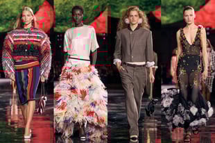 会場のグラン・パレには巨大な惑星が浮かび、観客を宇宙へと誘う壮大な演出が施された。コレクションはメンズウェア起源のシャツとパンツで幕を開け、マスキュリンとフェミニンが融合する「パラドックス」を表現。シャネルの象徴的なツイードはしなやかに再構築され、シワ加工されたカメリアがシルクニットスーツに溶け込み、黒と白のグラフィカルなラインはシャネルのパッケージの精密さを想起させる。ドレスやスカートにはフリンジやフラワーモチーフがふんだんに施され、ドラマティックなシルエットを描いた。
