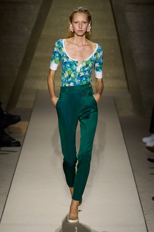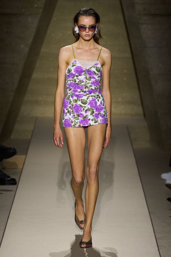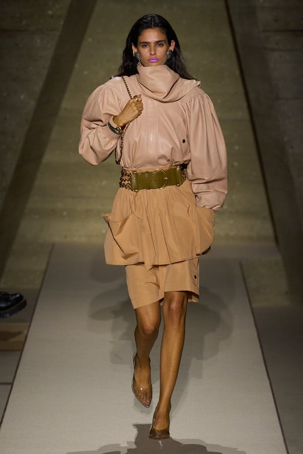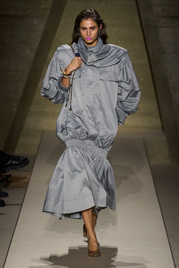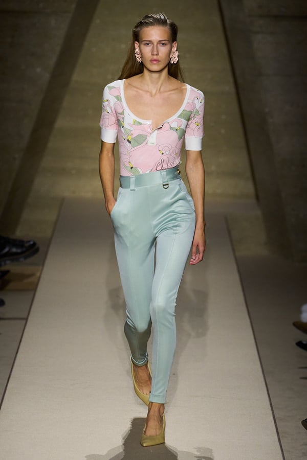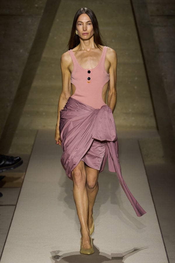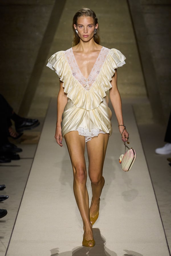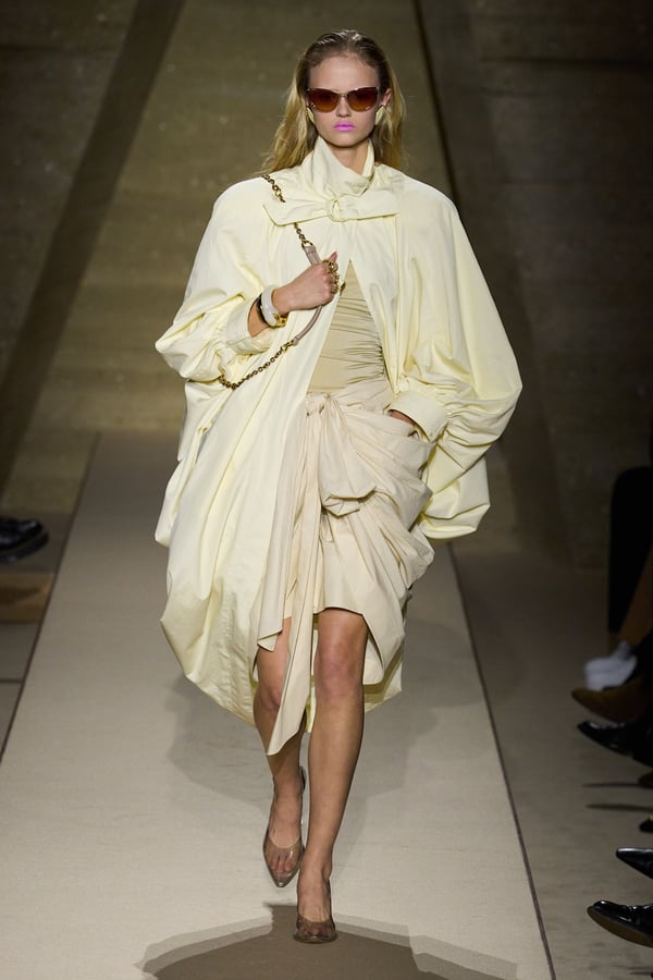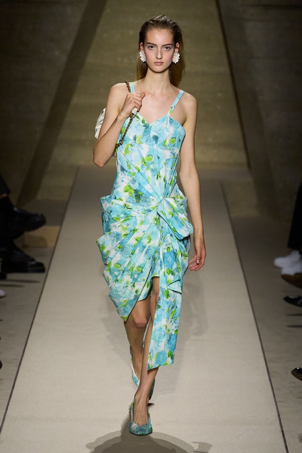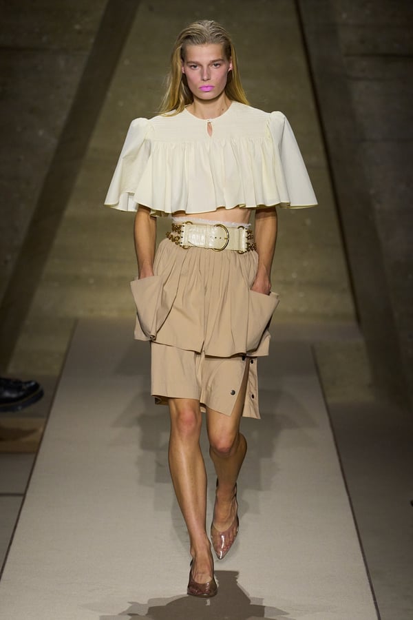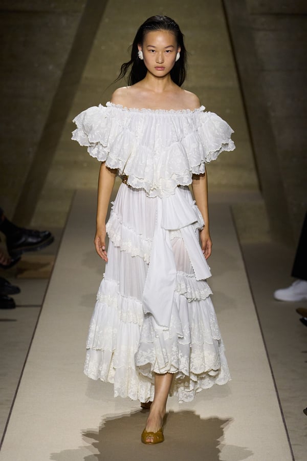 「クロエ(Chloe)」2026年春夏コレクションは、フランス語で“間にある“という「entre deux」をテーマに、オートクチュールの技法を日常的なコットン素材で表現。オートクチュールとプレタポルテの間に位置するコレクションとして、自由で軽やかなシルエットを追求した。前半は1950〜60年代のフローラルのアーカイヴプリントがランウェイを彩り、プリーツや結び、ドレーピングで高揚感と躍動感を演出。シフォンドレスをベースに、肩パッドが入ったコートはボリューミーで、結んだりすぼめたりすることでさまざまな表情のドレープに。コレクションと連動してプリーツを意味する新バック「プリッセ」もさまざまなデザインとカラーで登場した。