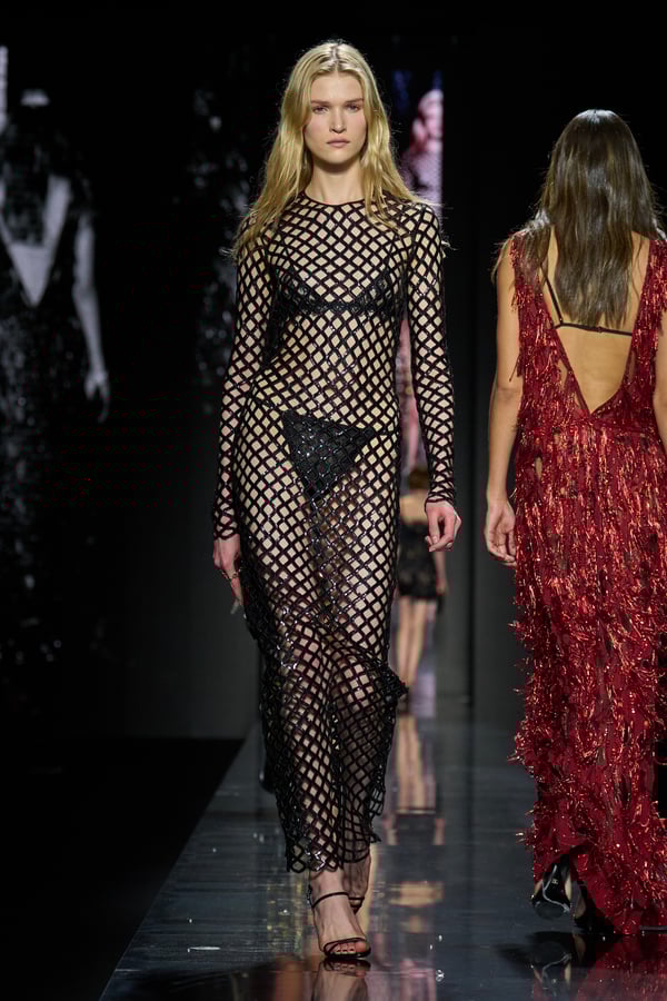 ショーは「アウターウェア」と「イブニングウェア」の2セクションで構成され、前半はデニムのジャケットやパンツにビジュー刺繍が施されていたり、オーバーサイズのMA-1ジャケットにビーニーを被ったカジュアルなスタイルでありながらグラマラスをちらつかせるなルックが登場。後半はセンシュアルな透け感や繊細な刺繍やスパンコール、クリスタルを施したショート丈のドレスで、チュールやランジェリー素材を取り入れた。ランウェイは会場を飛び出し外にまで延長され、会場に集まったファンにも新作コレクションを披露。ロックバンド マネスキンのヴィクトリア・デ・アンジェリスによるDJプレイをBGMに、自由な感性でファッションを楽しむ女性たちに向けた、洗練されたスタイリングの可能性を大衆を巻き込む形で提示した。
