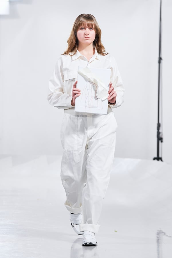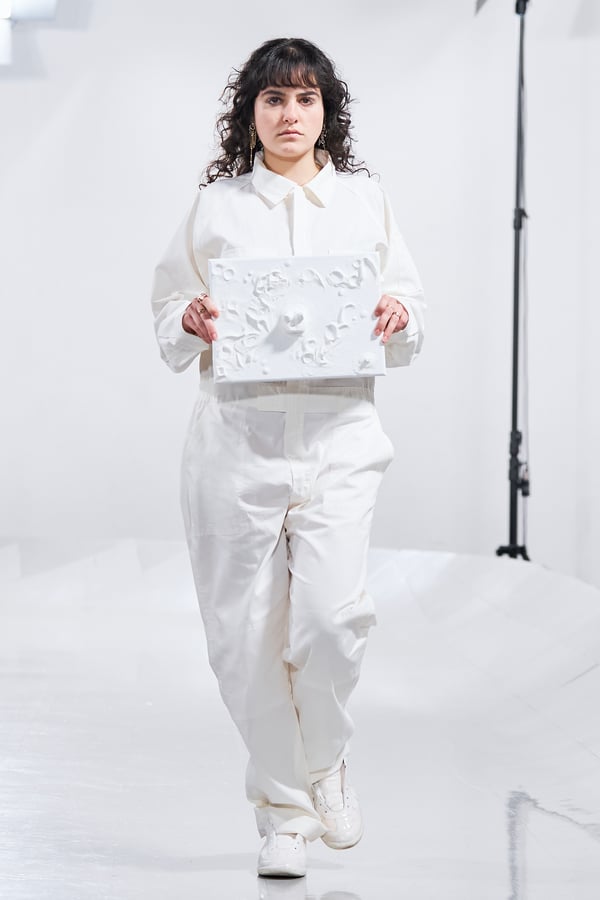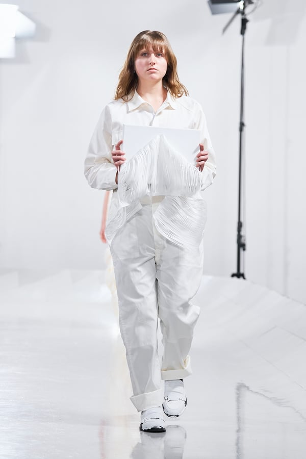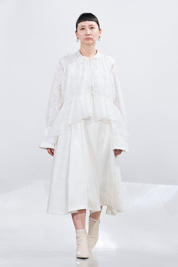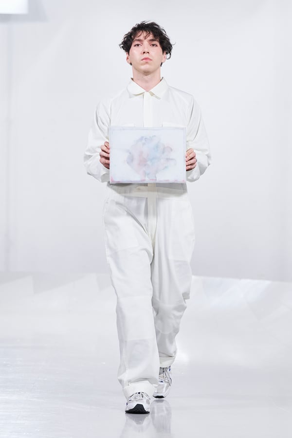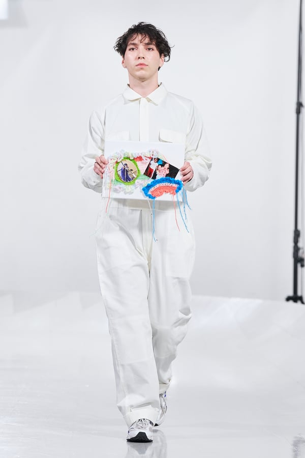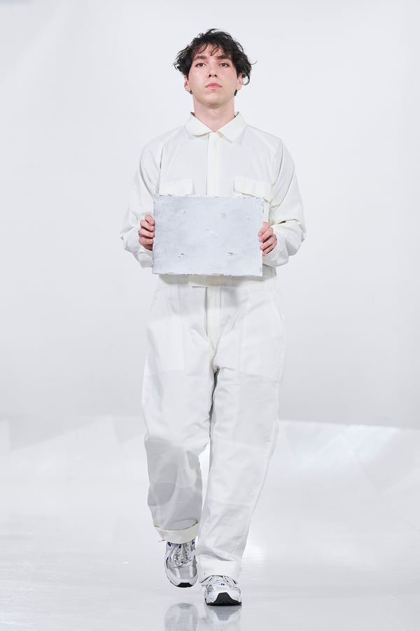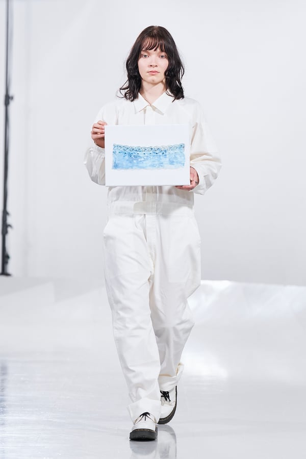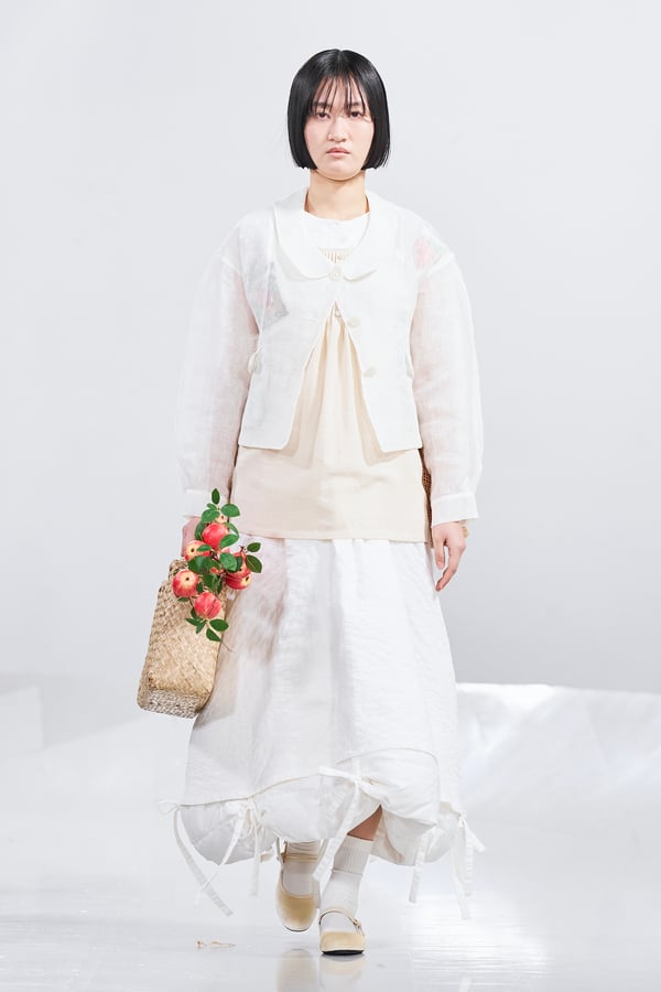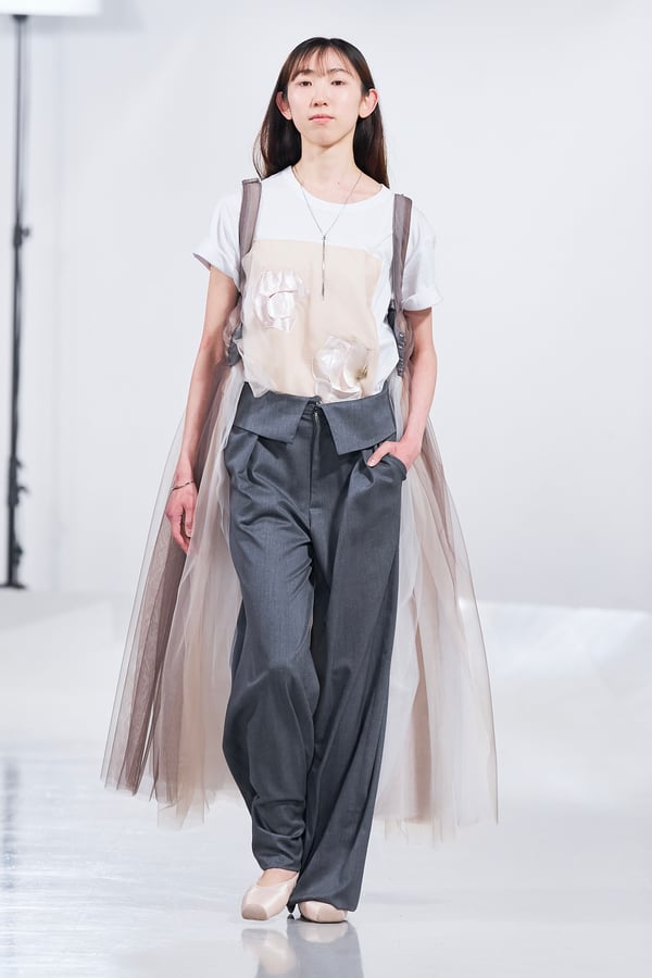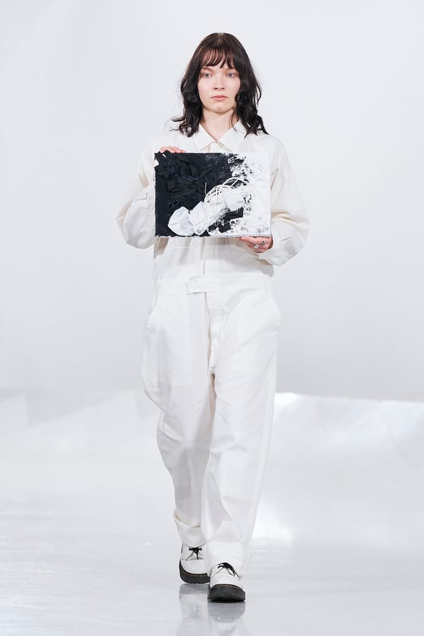 今年のコレクションのテーマは、白いキャンバスを意味する「ホワイトキャンバス(WHITE CANVAS)」。あらゆるクリエイションの始まりであり、不確かさと可能性の両方を内包する「白」を起点に、2026年3月卒業予定の31人の学生たちが、約1年間にわたるリサーチ・製作期間を経て完成させた作品の数々を披露した。同じテーマを起点としながらも、何気ない日常の儚さや、田舎での家族と過ごした時間や記憶、自然との侵されきらず拒まない共存の在り方、“女性らしさ”への違和感と反抗など、それぞれの学生が自身の経験や、感性、思想を反映して製作した多彩な作品が登場。またショーでは、パリ校からの留学生が作品のテーマを表現したパネルを手に持ち、各作品の先頭を歩く演出も行われた。