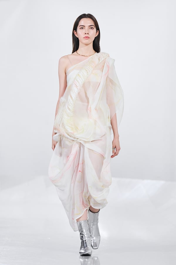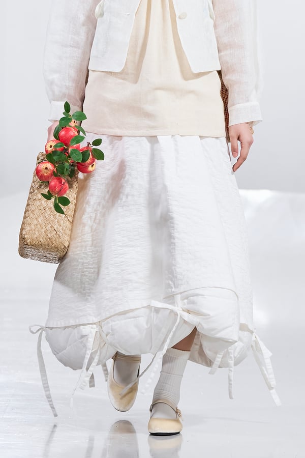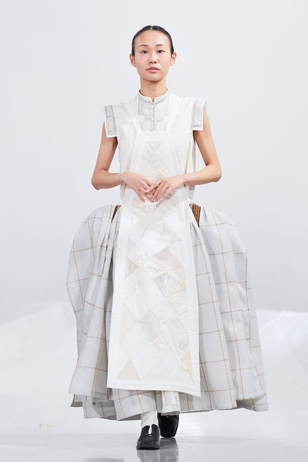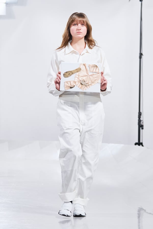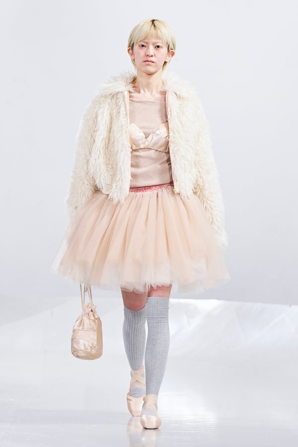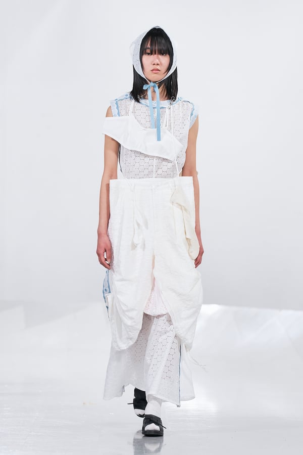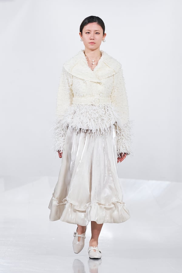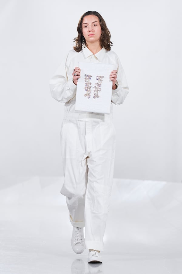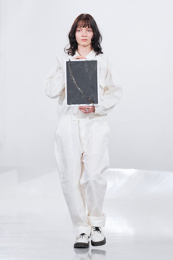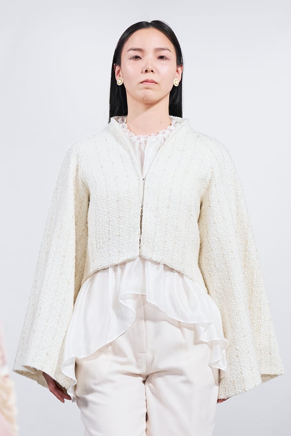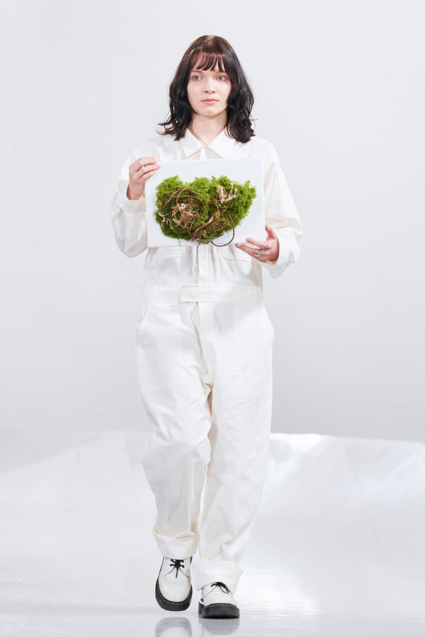 今年のコレクションのテーマは、白いキャンバスを意味する「ホワイトキャンバス(WHITE CANVAS)」。あらゆるクリエイションの始まりであり、不確かさと可能性の両方を内包する「白」を起点に、2026年3月卒業予定の31人の学生たちが、約1年間にわたるリサーチ・製作期間を経て完成させた作品の数々を披露した。同じテーマを起点としながらも、何気ない日常の儚さや、田舎での家族と過ごした時間や記憶、自然との侵されきらず拒まない共存の在り方、“女性らしさ”への違和感と反抗など、それぞれの学生が自身の経験や、感性、思想を反映して製作した多彩な作品が登場。またショーでは、パリ校からの留学生が作品のテーマを表現したパネルを手に持ち、各作品の先頭を歩く演出も行われた。