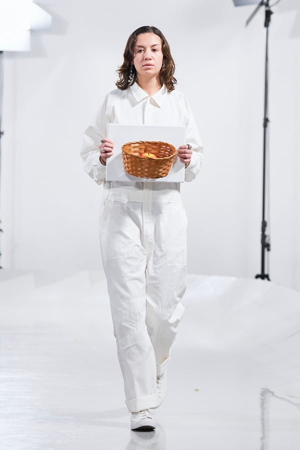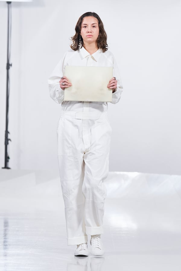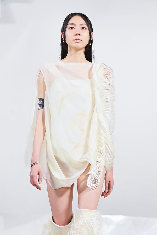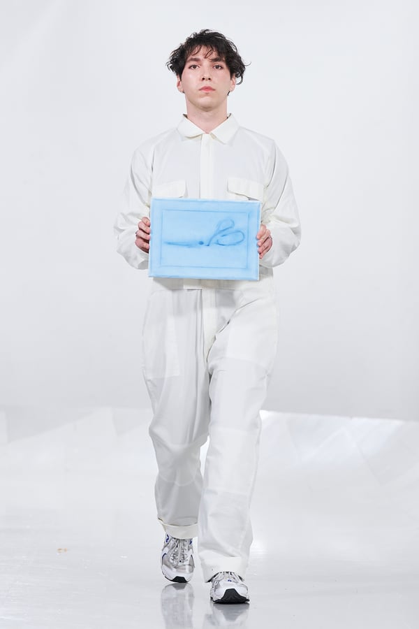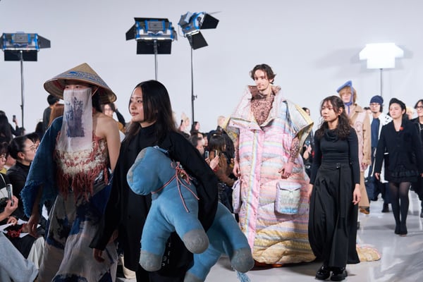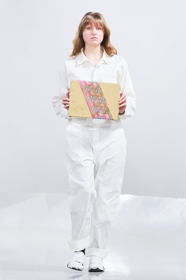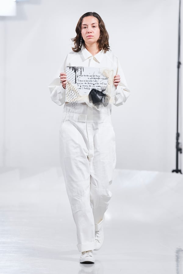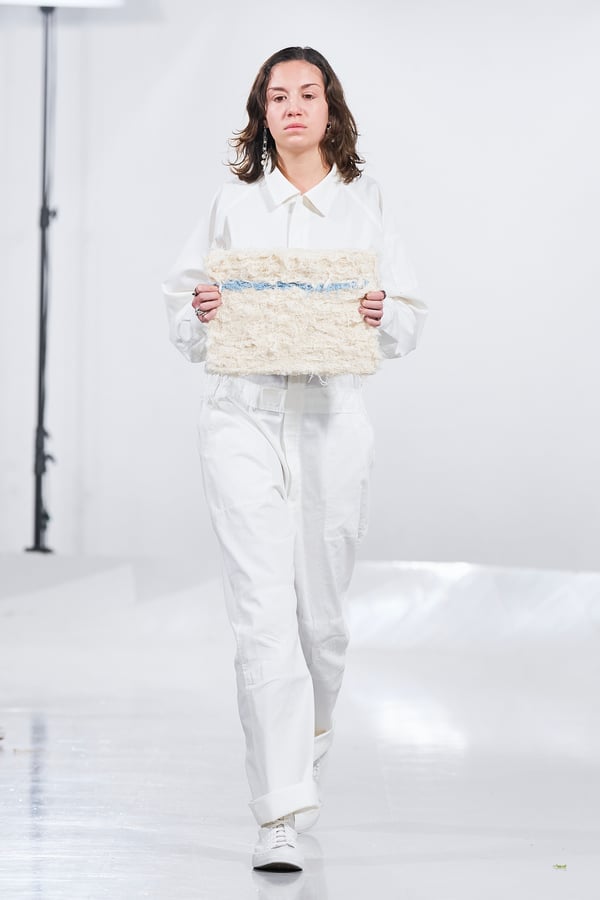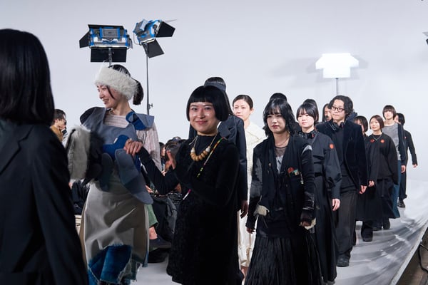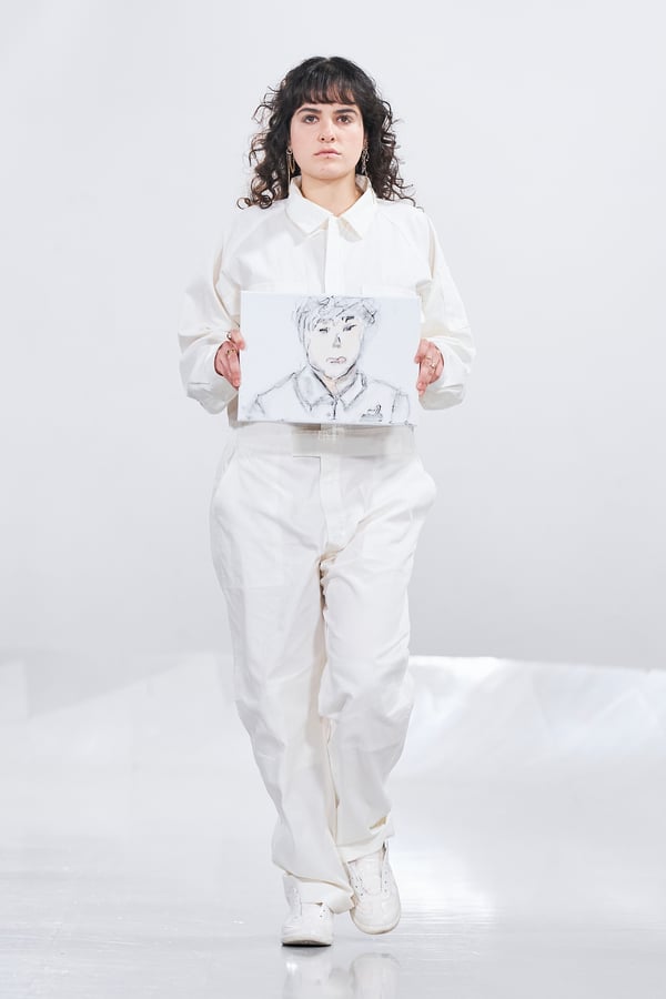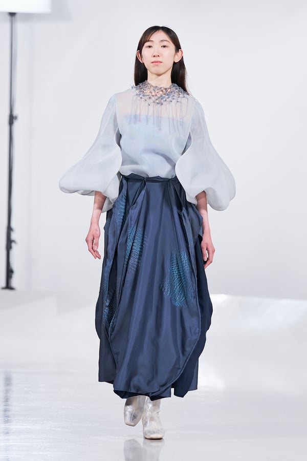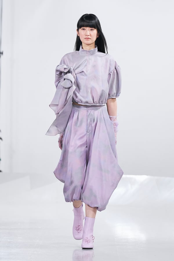 今年のコレクションのテーマは、白いキャンバスを意味する「ホワイトキャンバス(WHITE CANVAS)」。あらゆるクリエイションの始まりであり、不確かさと可能性の両方を内包する「白」を起点に、2026年3月卒業予定の31人の学生たちが、約1年間にわたるリサーチ・製作期間を経て完成させた作品の数々を披露した。同じテーマを起点としながらも、何気ない日常の儚さや、田舎での家族と過ごした時間や記憶、自然との侵されきらず拒まない共存の在り方、“女性らしさ”への違和感と反抗など、それぞれの学生が自身の経験や、感性、思想を反映して製作した多彩な作品が登場。またショーでは、パリ校からの留学生が作品のテーマを表現したパネルを手に持ち、各作品の先頭を歩く演出も行われた。