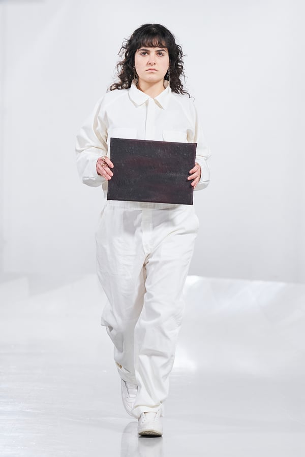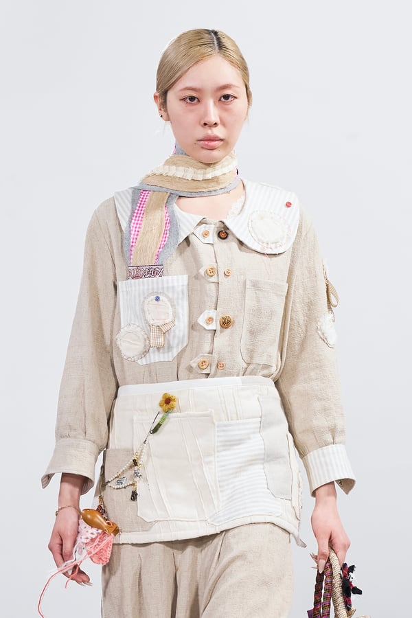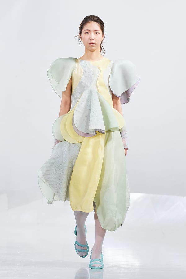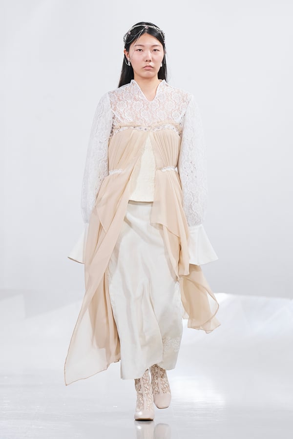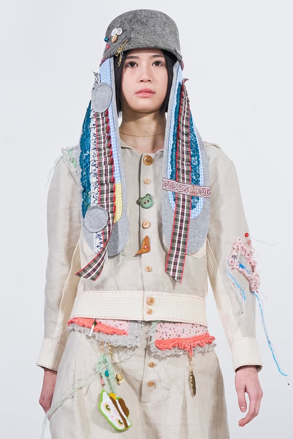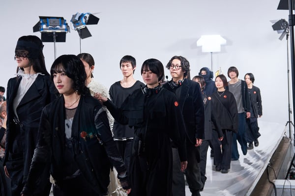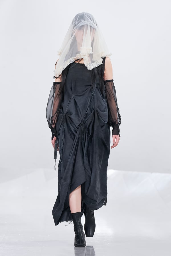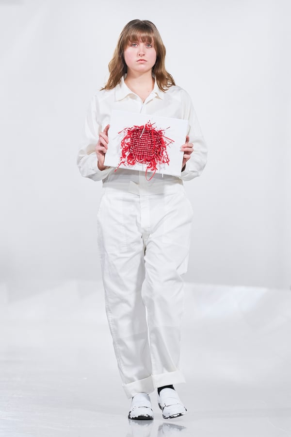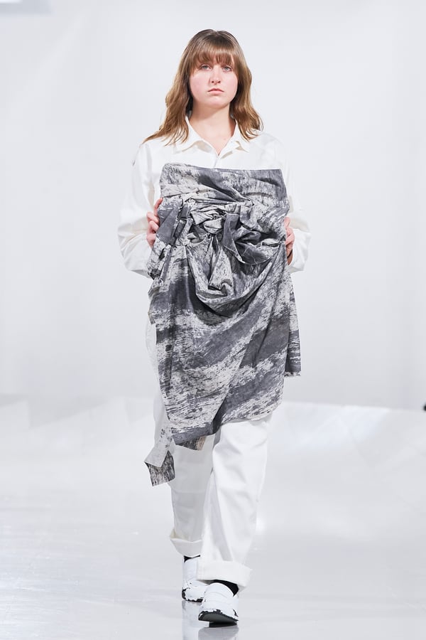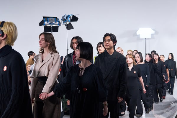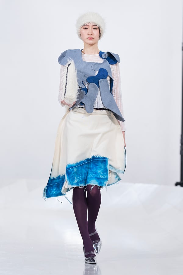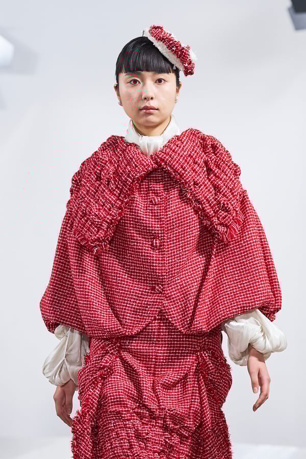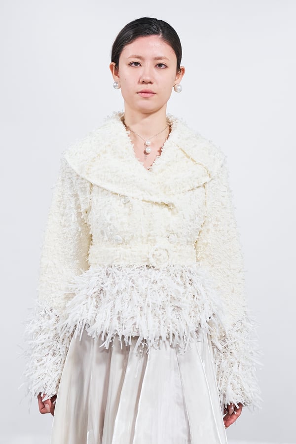 今年のコレクションのテーマは、白いキャンバスを意味する「ホワイトキャンバス(WHITE CANVAS)」。あらゆるクリエイションの始まりであり、不確かさと可能性の両方を内包する「白」を起点に、2026年3月卒業予定の31人の学生たちが、約1年間にわたるリサーチ・製作期間を経て完成させた作品の数々を披露した。同じテーマを起点としながらも、何気ない日常の儚さや、田舎での家族と過ごした時間や記憶、自然との侵されきらず拒まない共存の在り方、“女性らしさ”への違和感と反抗など、それぞれの学生が自身の経験や、感性、思想を反映して製作した多彩な作品が登場。またショーでは、パリ校からの留学生が作品のテーマを表現したパネルを手に持ち、各作品の先頭を歩く演出も行われた。