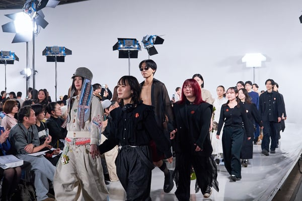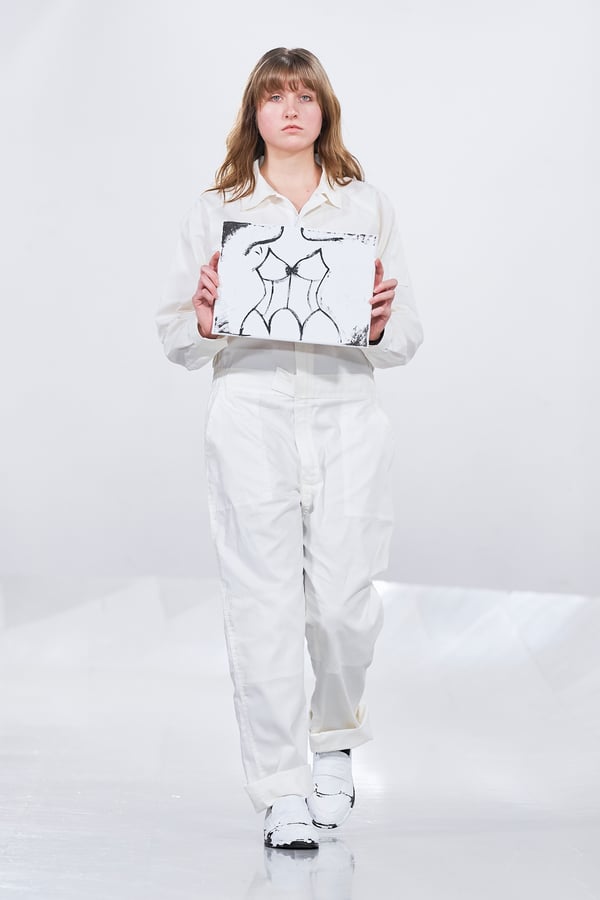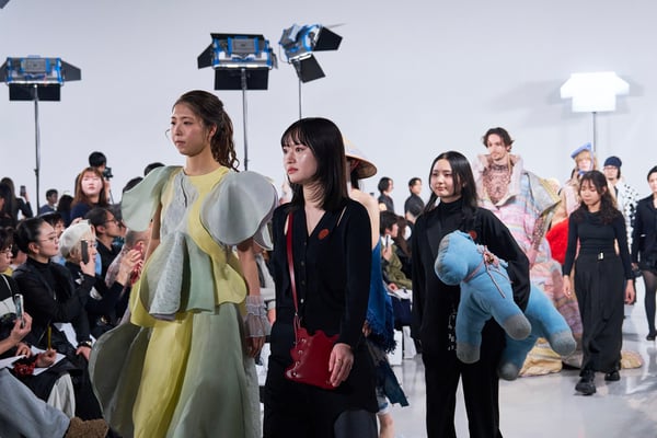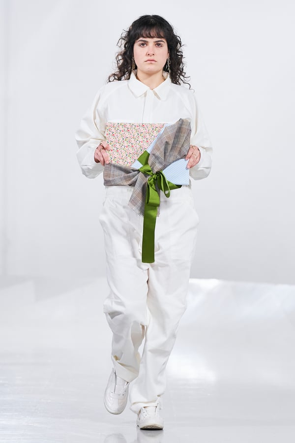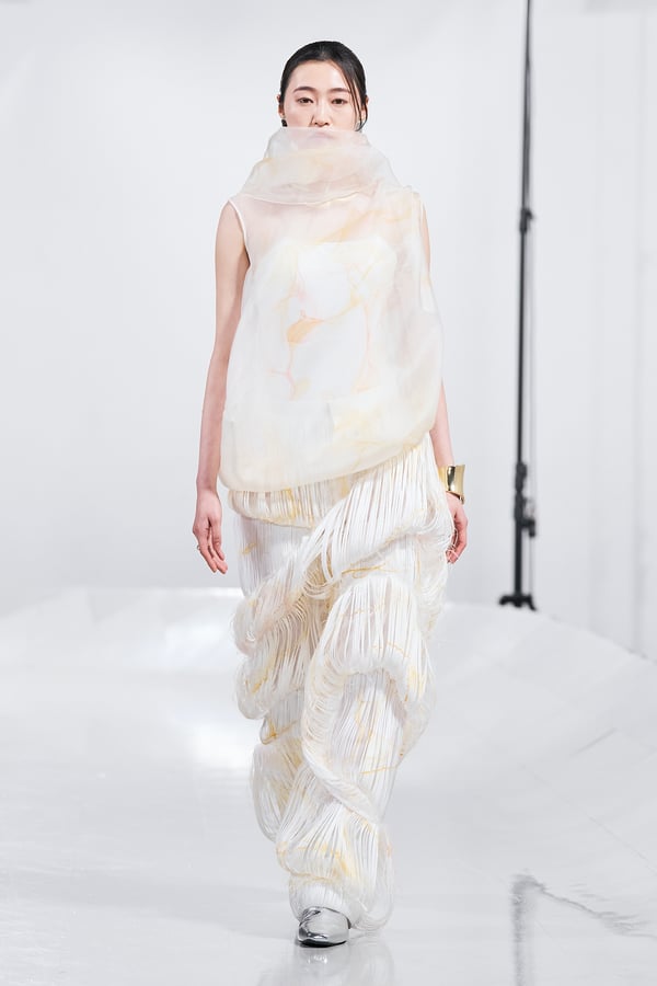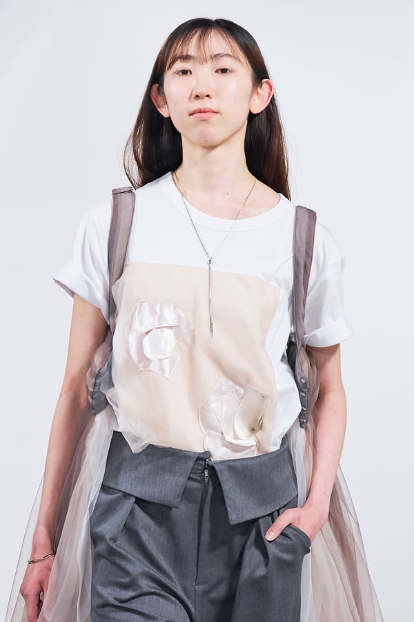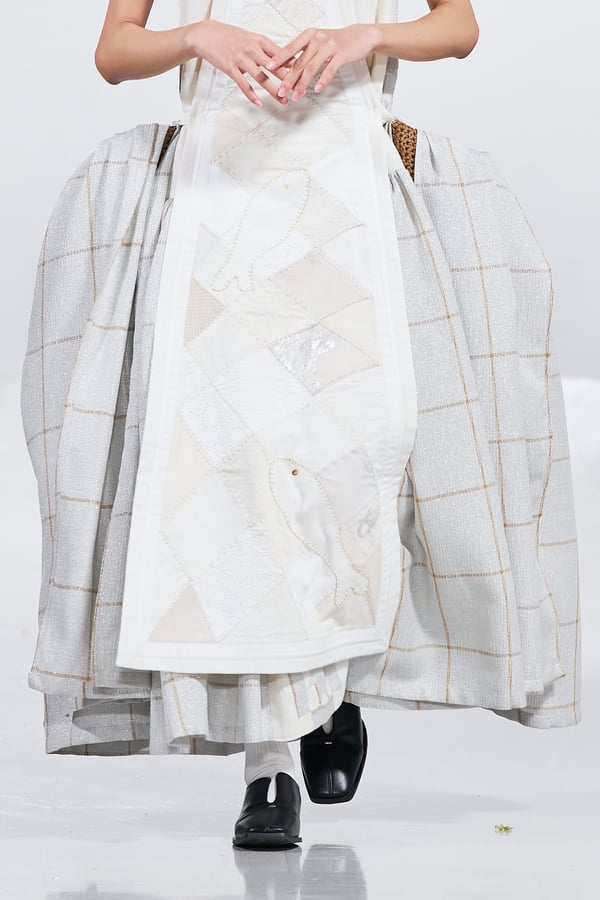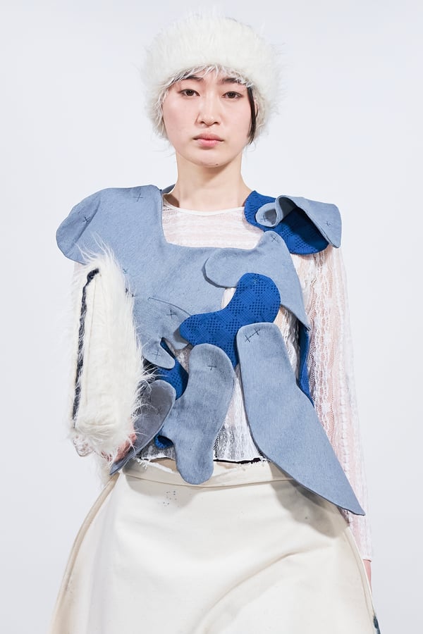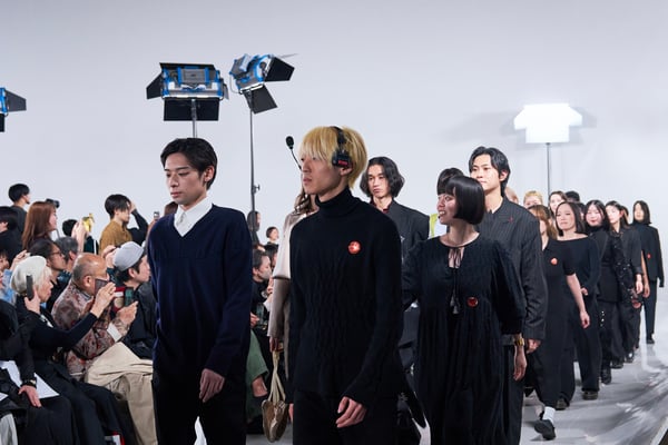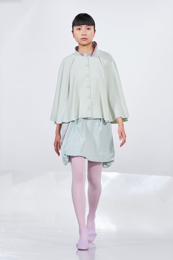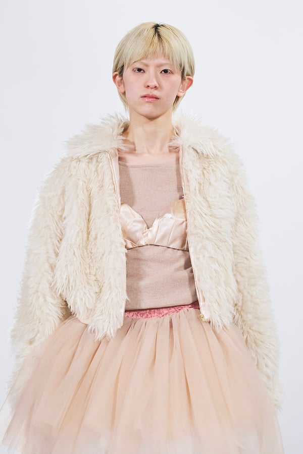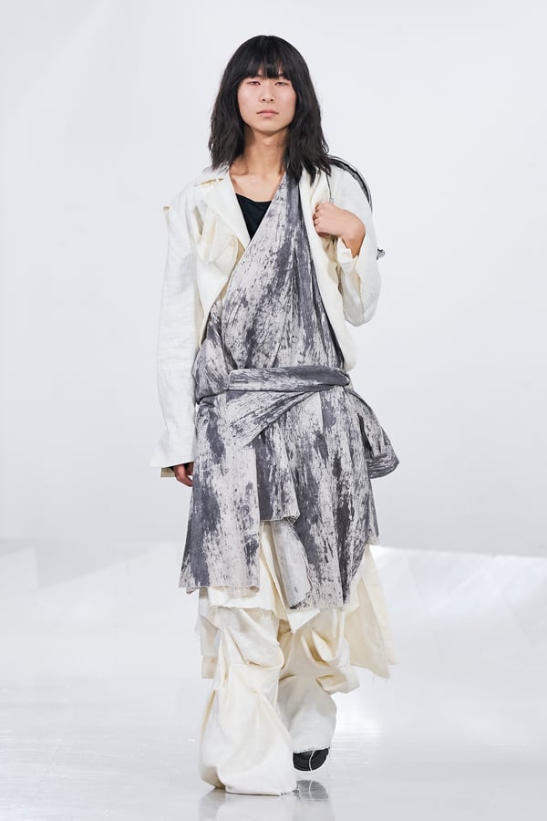 今年のコレクションのテーマは、白いキャンバスを意味する「ホワイトキャンバス(WHITE CANVAS)」。あらゆるクリエイションの始まりであり、不確かさと可能性の両方を内包する「白」を起点に、2026年3月卒業予定の31人の学生たちが、約1年間にわたるリサーチ・製作期間を経て完成させた作品の数々を披露した。同じテーマを起点としながらも、何気ない日常の儚さや、田舎での家族と過ごした時間や記憶、自然との侵されきらず拒まない共存の在り方、“女性らしさ”への違和感と反抗など、それぞれの学生が自身の経験や、感性、思想を反映して製作した多彩な作品が登場。またショーでは、パリ校からの留学生が作品のテーマを表現したパネルを手に持ち、各作品の先頭を歩く演出も行われた。