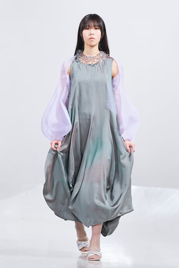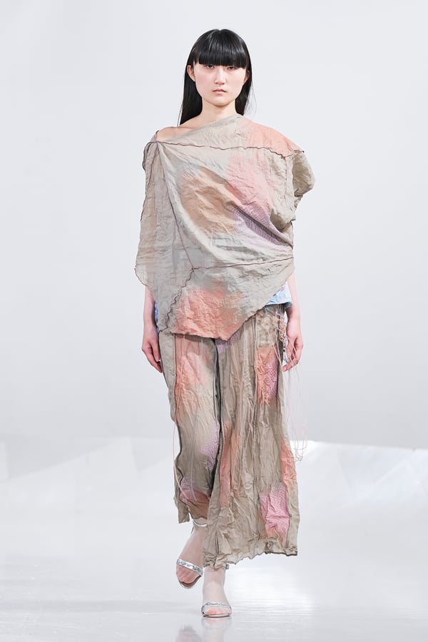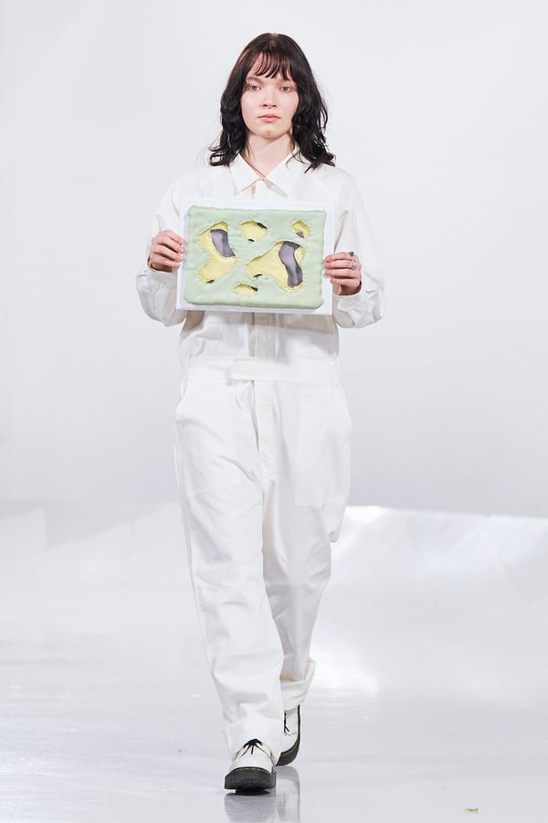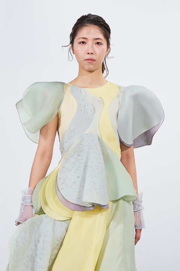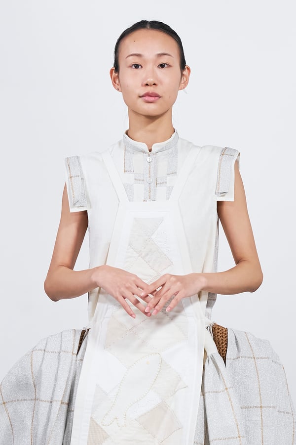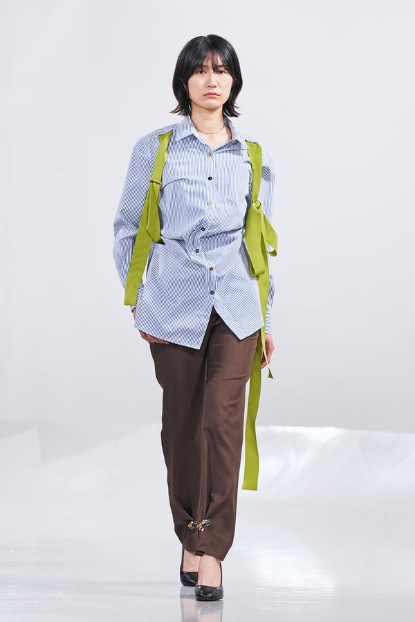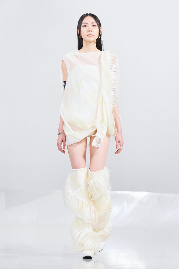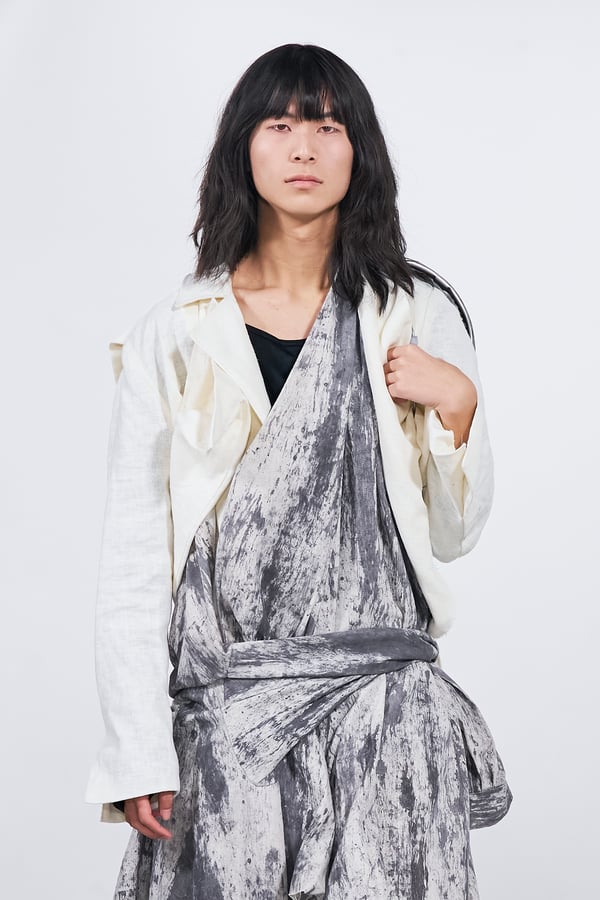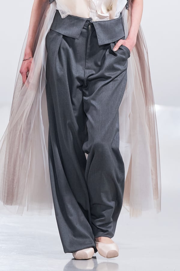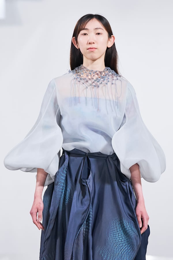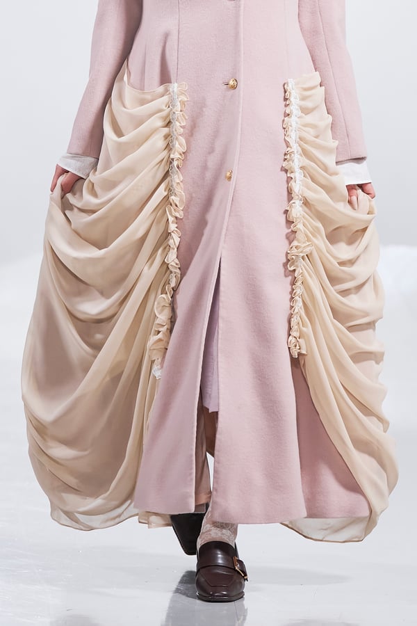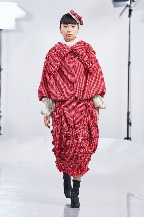 今年のコレクションのテーマは、白いキャンバスを意味する「ホワイトキャンバス(WHITE CANVAS)」。あらゆるクリエイションの始まりであり、不確かさと可能性の両方を内包する「白」を起点に、2026年3月卒業予定の31人の学生たちが、約1年間にわたるリサーチ・製作期間を経て完成させた作品の数々を披露した。同じテーマを起点としながらも、何気ない日常の儚さや、田舎での家族と過ごした時間や記憶、自然との侵されきらず拒まない共存の在り方、“女性らしさ”への違和感と反抗など、それぞれの学生が自身の経験や、感性、思想を反映して製作した多彩な作品が登場。またショーでは、パリ校からの留学生が作品のテーマを表現したパネルを手に持ち、各作品の先頭を歩く演出も行われた。