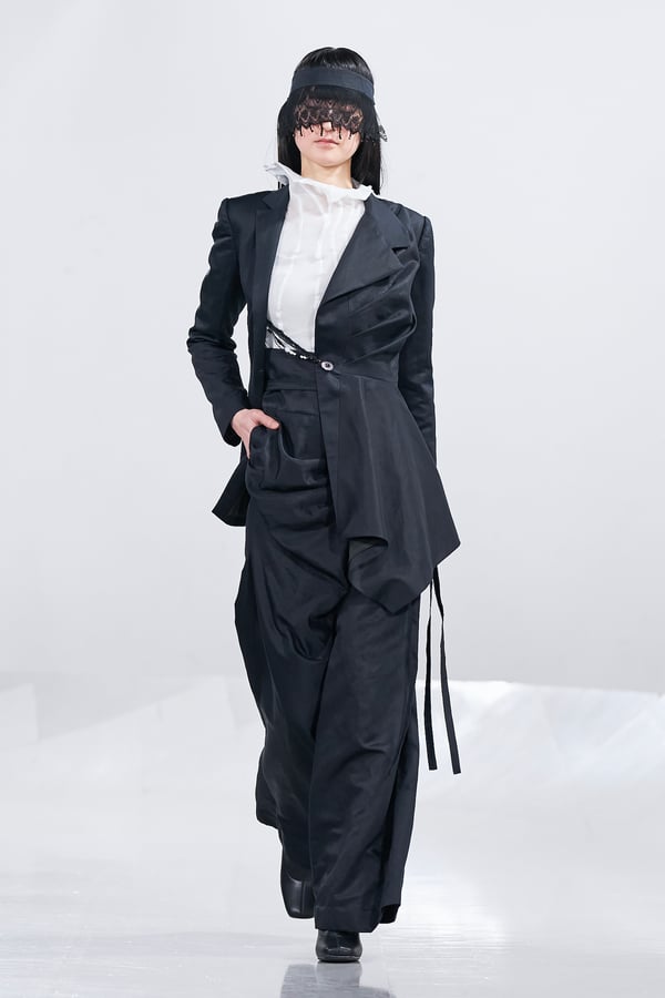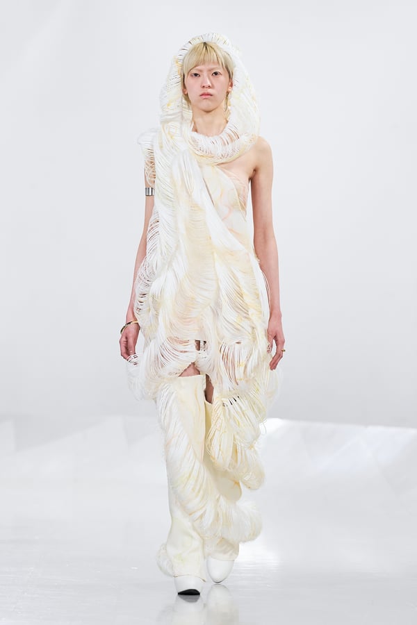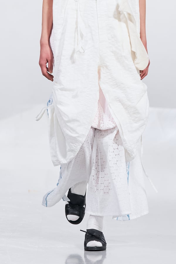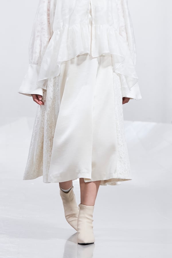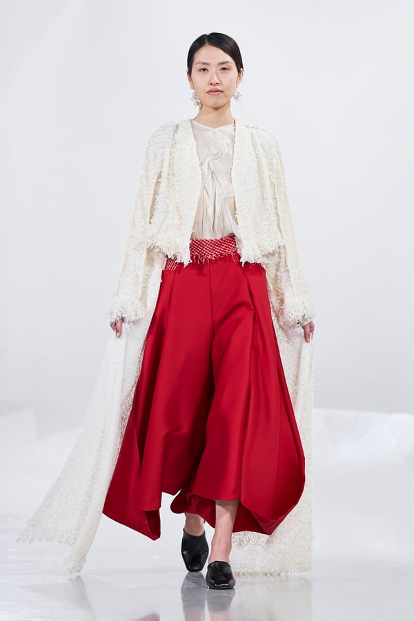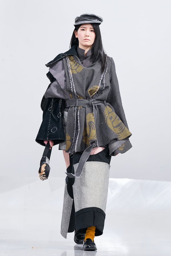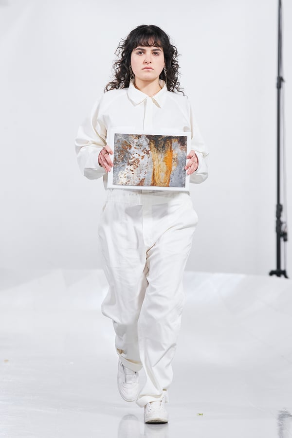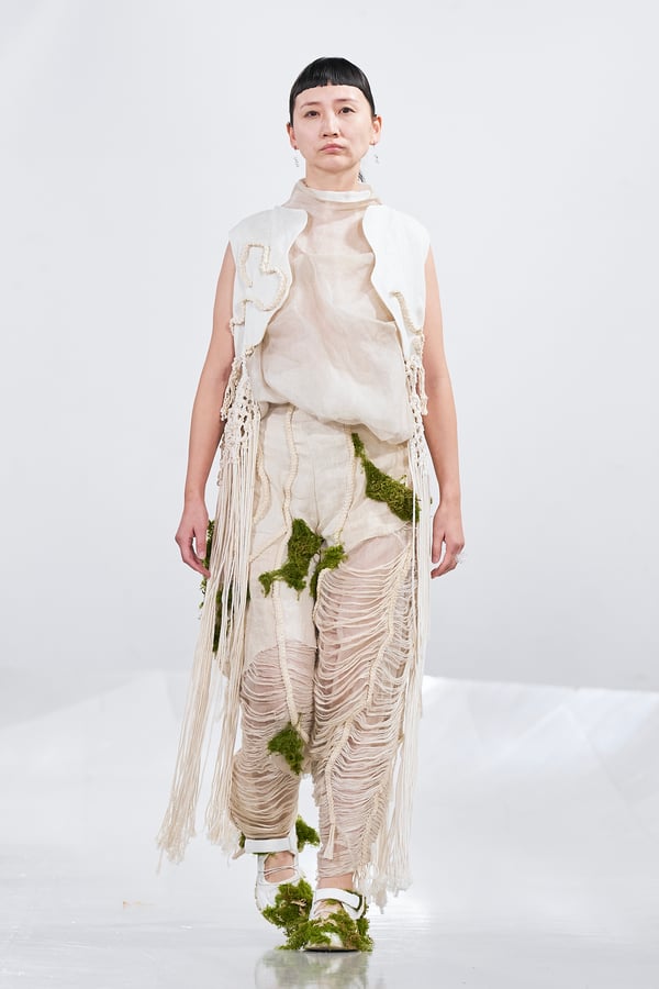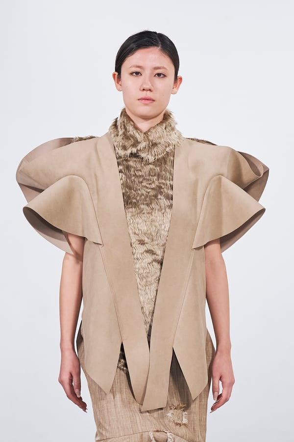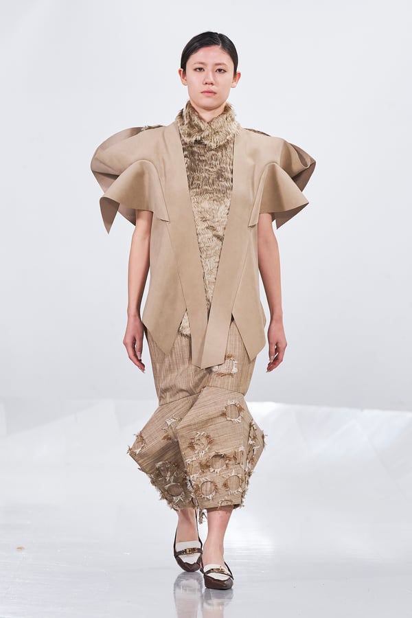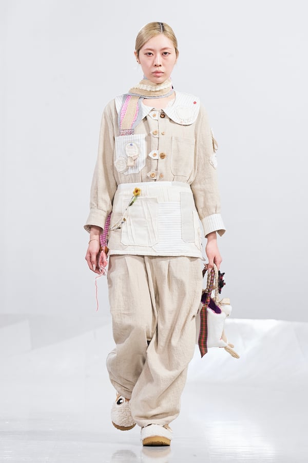 今年のコレクションのテーマは、白いキャンバスを意味する「ホワイトキャンバス(WHITE CANVAS)」。あらゆるクリエイションの始まりであり、不確かさと可能性の両方を内包する「白」を起点に、2026年3月卒業予定の31人の学生たちが、約1年間にわたるリサーチ・製作期間を経て完成させた作品の数々を披露した。同じテーマを起点としながらも、何気ない日常の儚さや、田舎での家族と過ごした時間や記憶、自然との侵されきらず拒まない共存の在り方、“女性らしさ”への違和感と反抗など、それぞれの学生が自身の経験や、感性、思想を反映して製作した多彩な作品が登場。またショーでは、パリ校からの留学生が作品のテーマを表現したパネルを手に持ち、各作品の先頭を歩く演出も行われた。