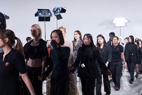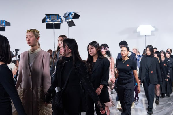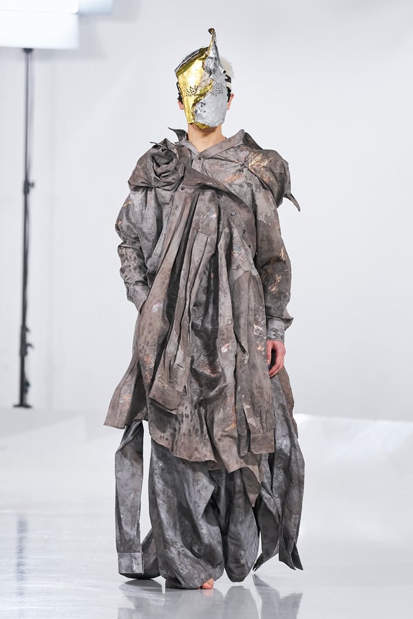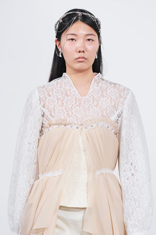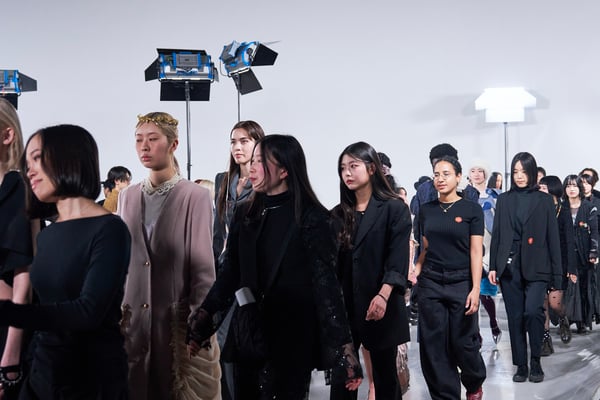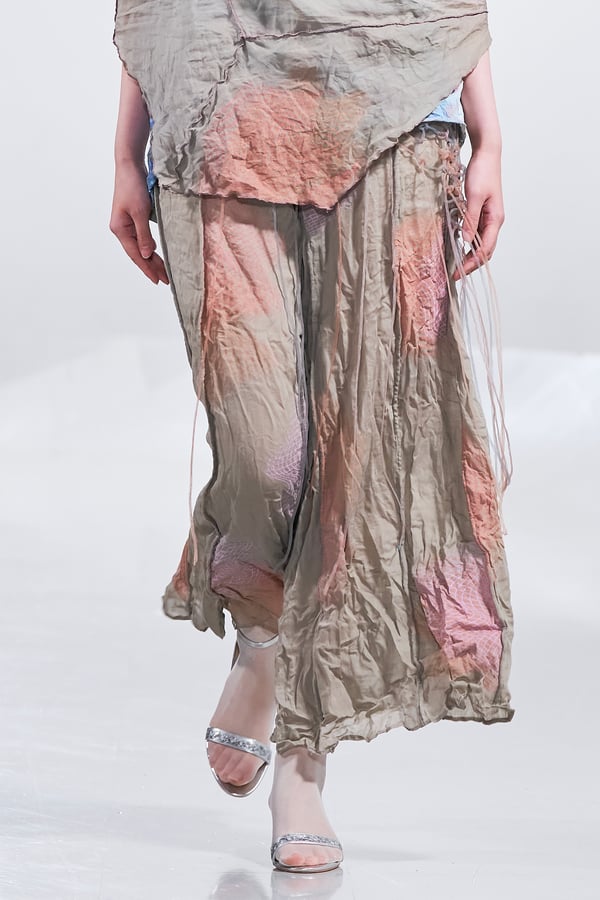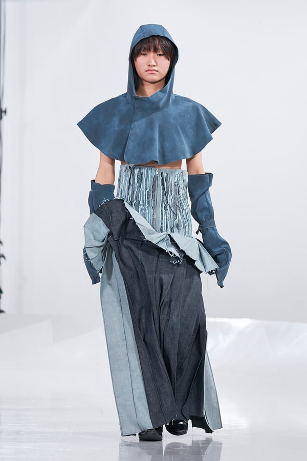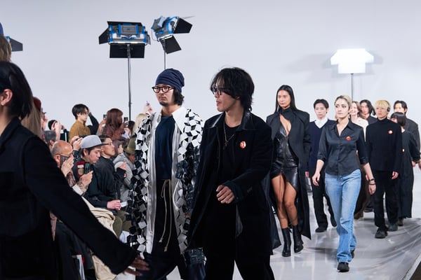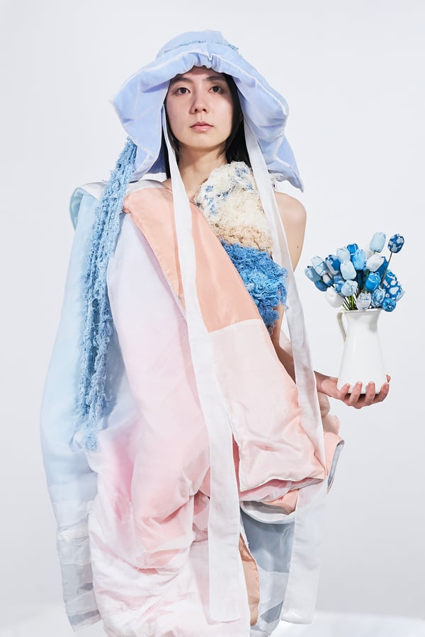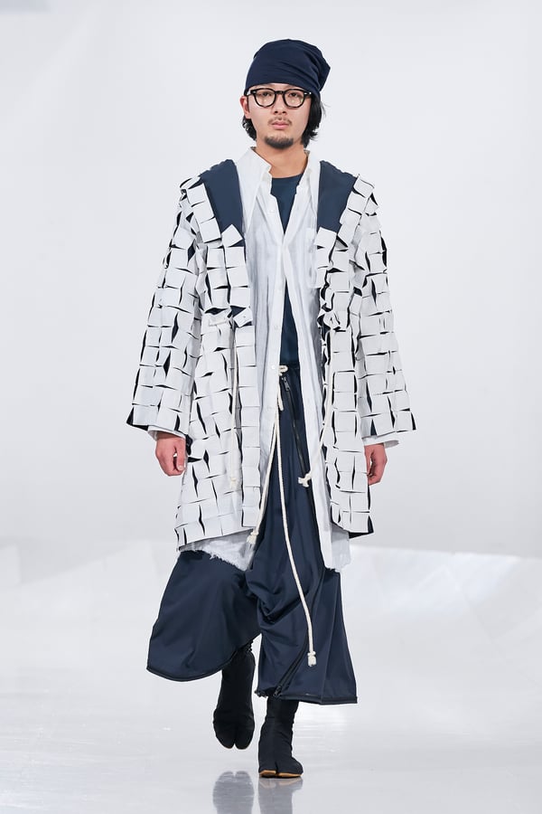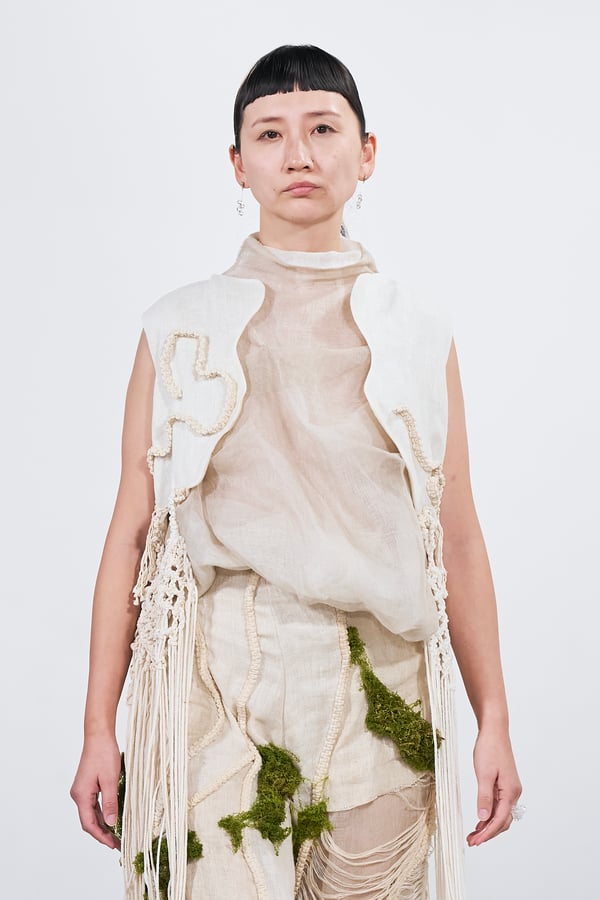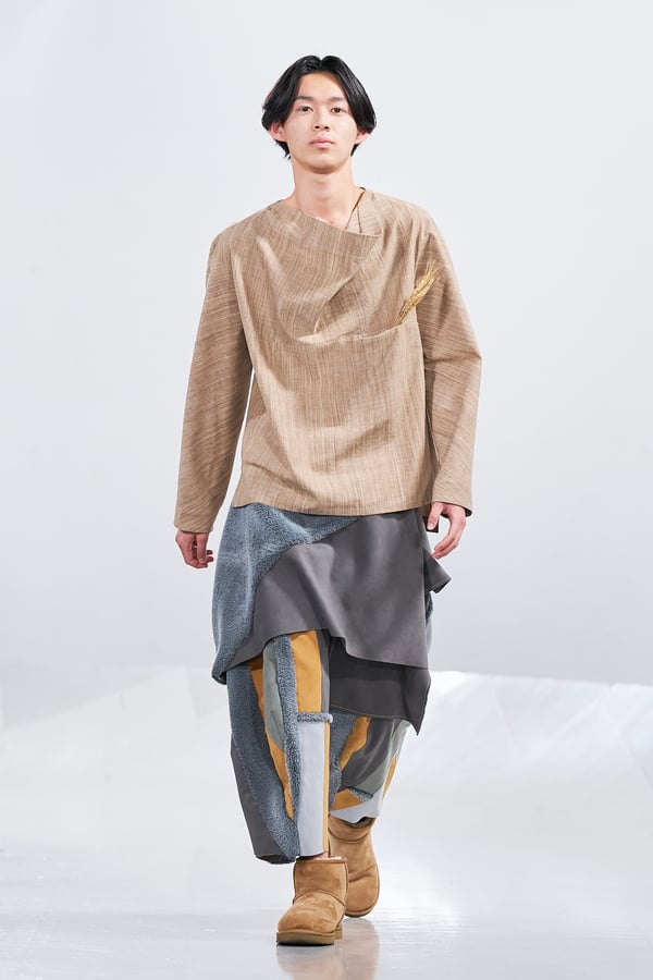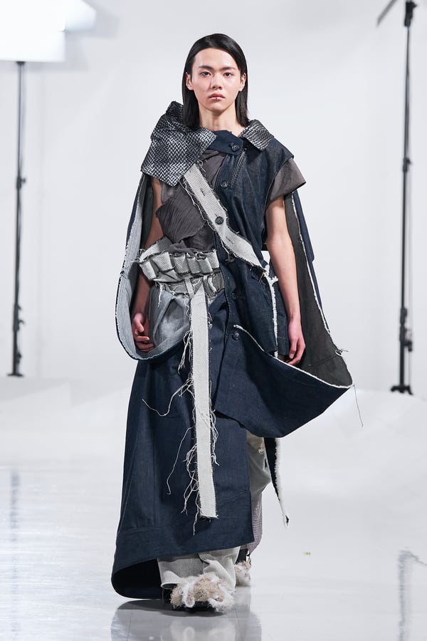 今年のコレクションのテーマは、白いキャンバスを意味する「ホワイトキャンバス(WHITE CANVAS)」。あらゆるクリエイションの始まりであり、不確かさと可能性の両方を内包する「白」を起点に、2026年3月卒業予定の31人の学生たちが、約1年間にわたるリサーチ・製作期間を経て完成させた作品の数々を披露した。同じテーマを起点としながらも、何気ない日常の儚さや、田舎での家族と過ごした時間や記憶、自然との侵されきらず拒まない共存の在り方、“女性らしさ”への違和感と反抗など、それぞれの学生が自身の経験や、感性、思想を反映して製作した多彩な作品が登場。またショーでは、パリ校からの留学生が作品のテーマを表現したパネルを手に持ち、各作品の先頭を歩く演出も行われた。