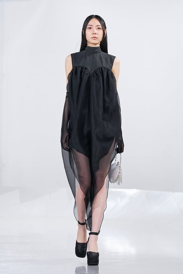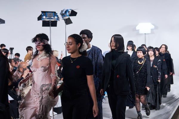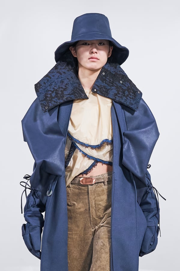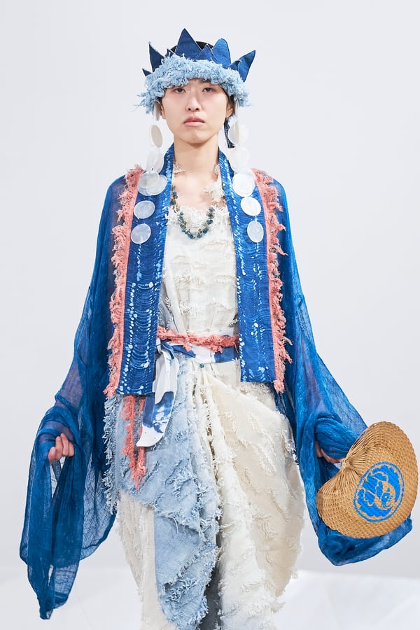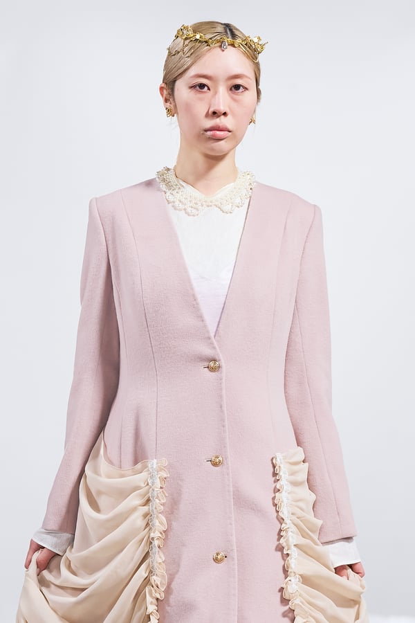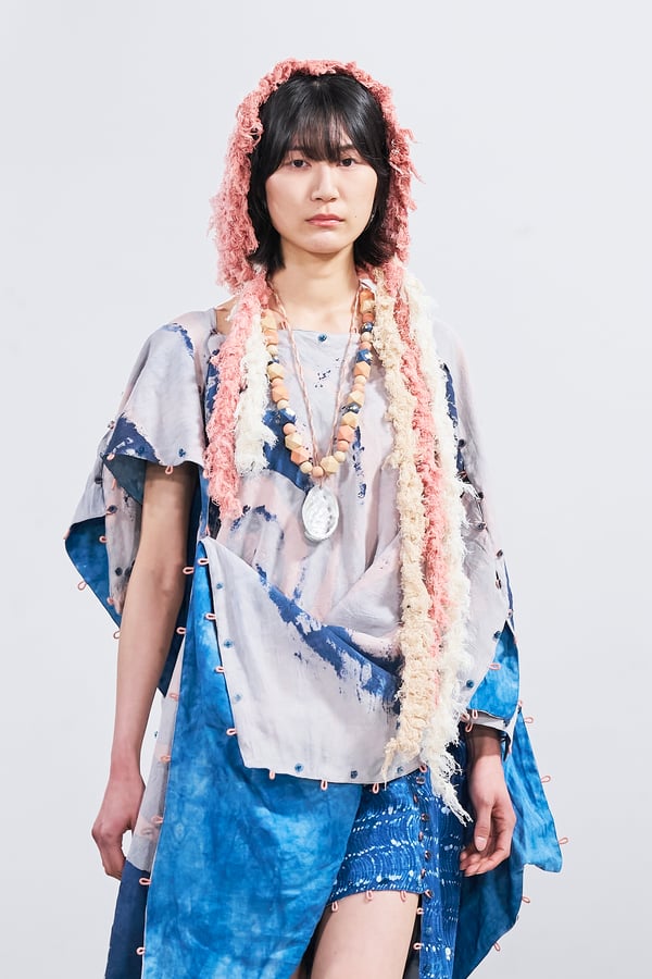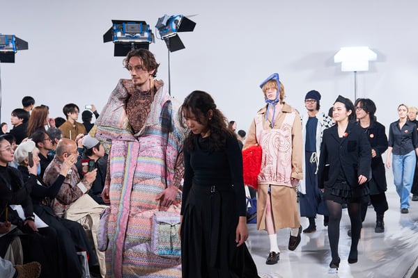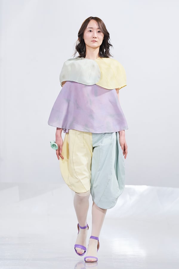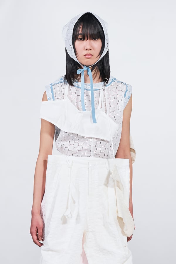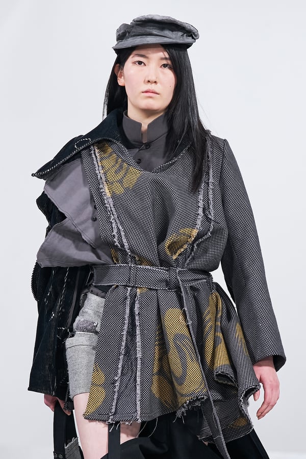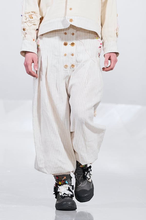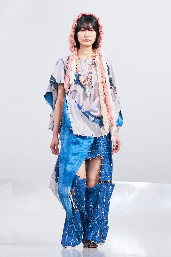 今年のコレクションのテーマは、白いキャンバスを意味する「ホワイトキャンバス(WHITE CANVAS)」。あらゆるクリエイションの始まりであり、不確かさと可能性の両方を内包する「白」を起点に、2026年3月卒業予定の31人の学生たちが、約1年間にわたるリサーチ・製作期間を経て完成させた作品の数々を披露した。同じテーマを起点としながらも、何気ない日常の儚さや、田舎での家族と過ごした時間や記憶、自然との侵されきらず拒まない共存の在り方、“女性らしさ”への違和感と反抗など、それぞれの学生が自身の経験や、感性、思想を反映して製作した多彩な作品が登場。またショーでは、パリ校からの留学生が作品のテーマを表現したパネルを手に持ち、各作品の先頭を歩く演出も行われた。