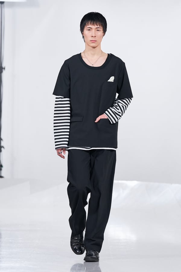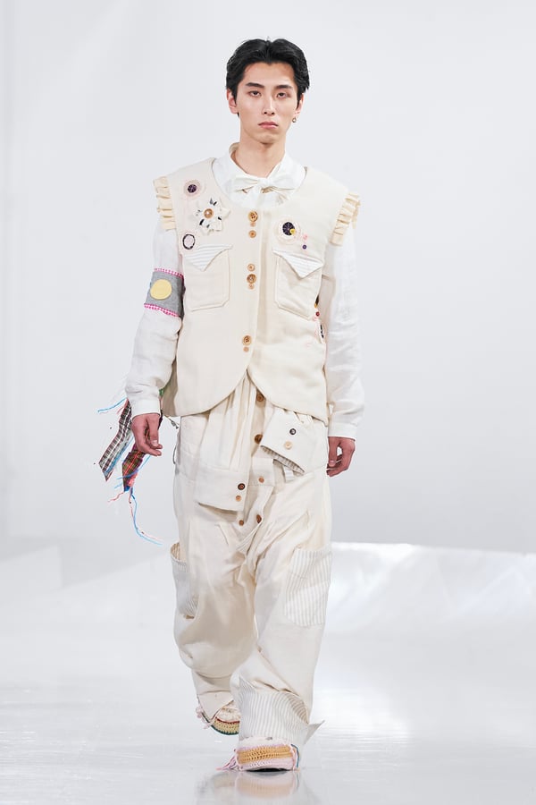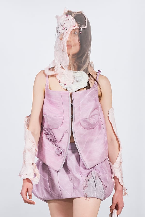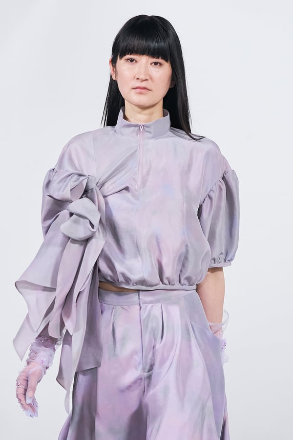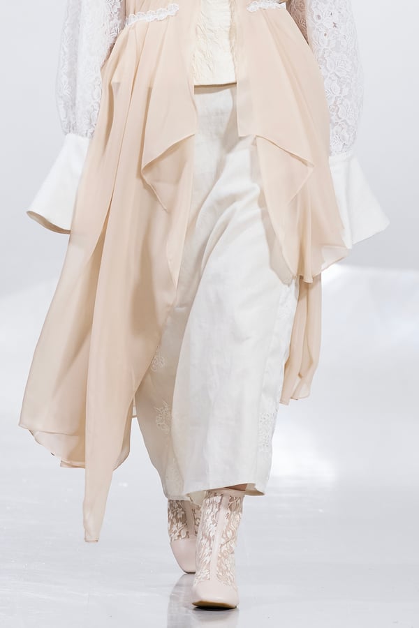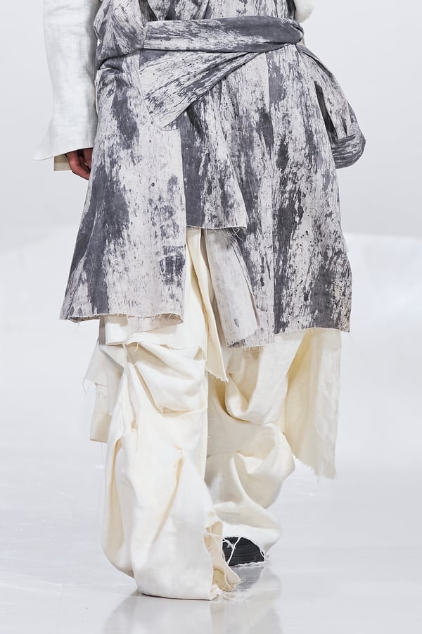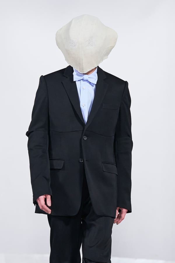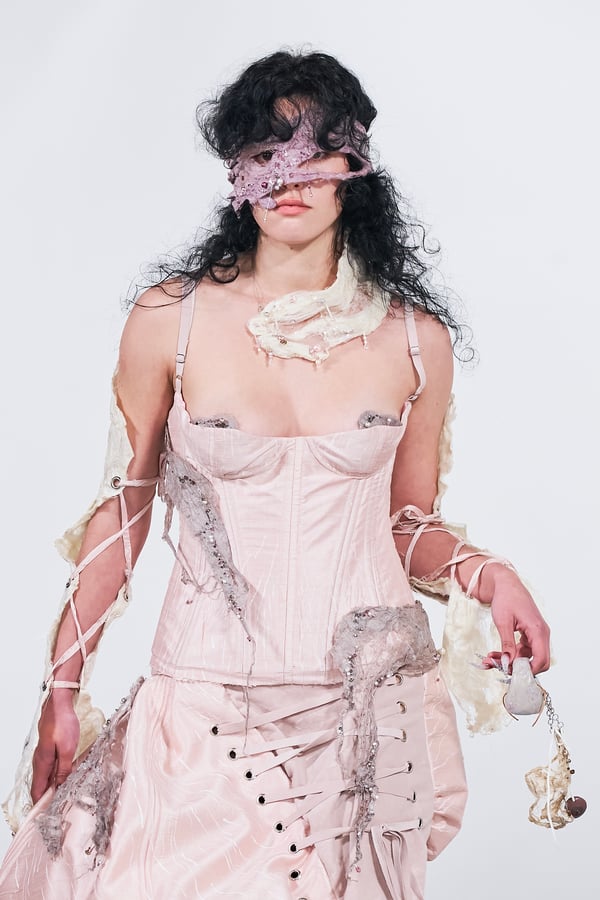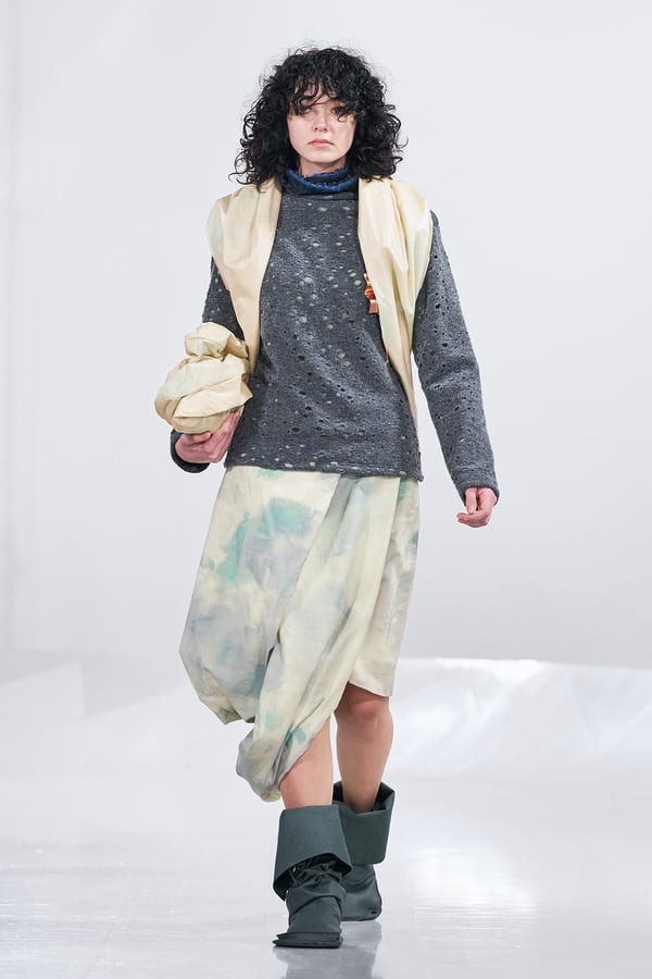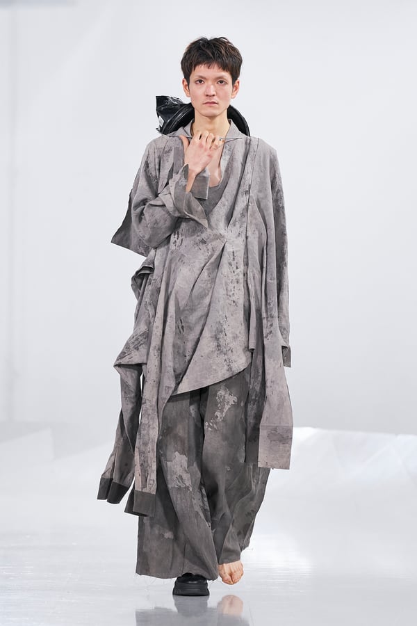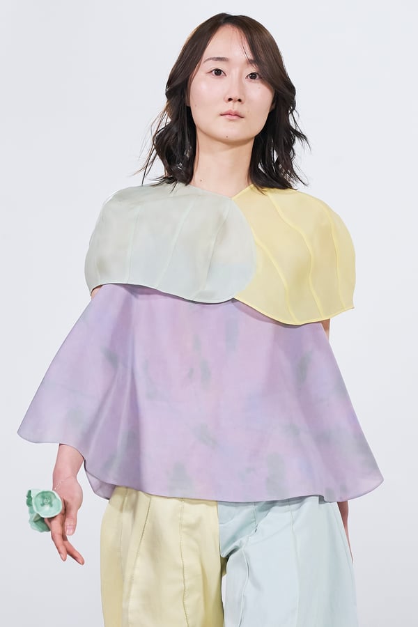 今年のコレクションのテーマは、白いキャンバスを意味する「ホワイトキャンバス(WHITE CANVAS)」。あらゆるクリエイションの始まりであり、不確かさと可能性の両方を内包する「白」を起点に、2026年3月卒業予定の31人の学生たちが、約1年間にわたるリサーチ・製作期間を経て完成させた作品の数々を披露した。同じテーマを起点としながらも、何気ない日常の儚さや、田舎での家族と過ごした時間や記憶、自然との侵されきらず拒まない共存の在り方、“女性らしさ”への違和感と反抗など、それぞれの学生が自身の経験や、感性、思想を反映して製作した多彩な作品が登場。またショーでは、パリ校からの留学生が作品のテーマを表現したパネルを手に持ち、各作品の先頭を歩く演出も行われた。