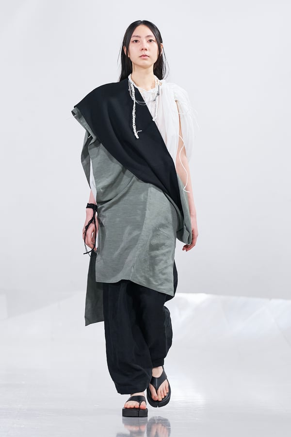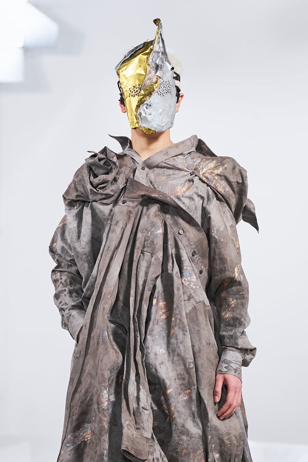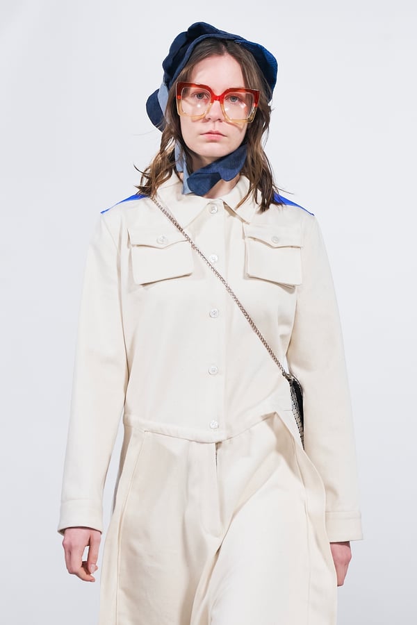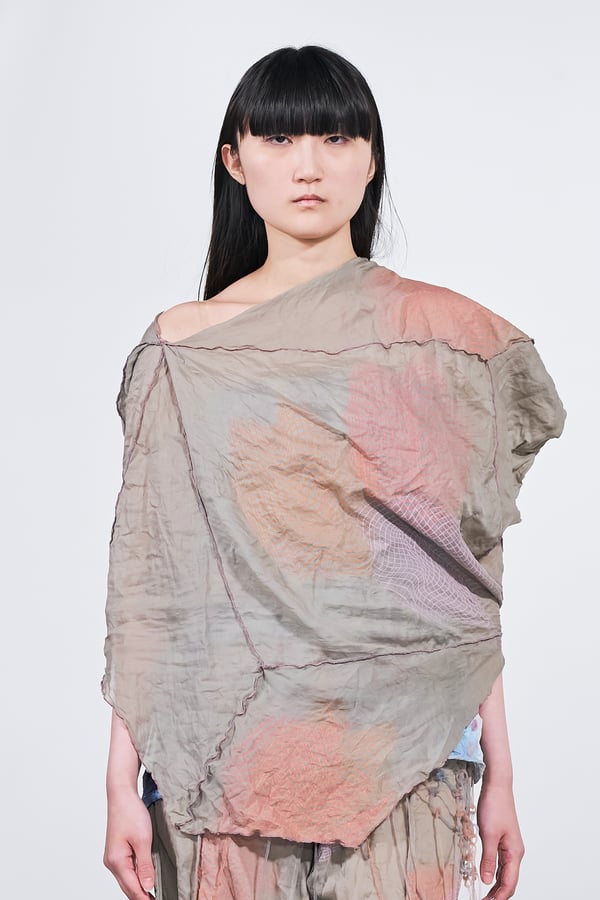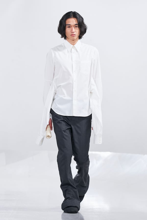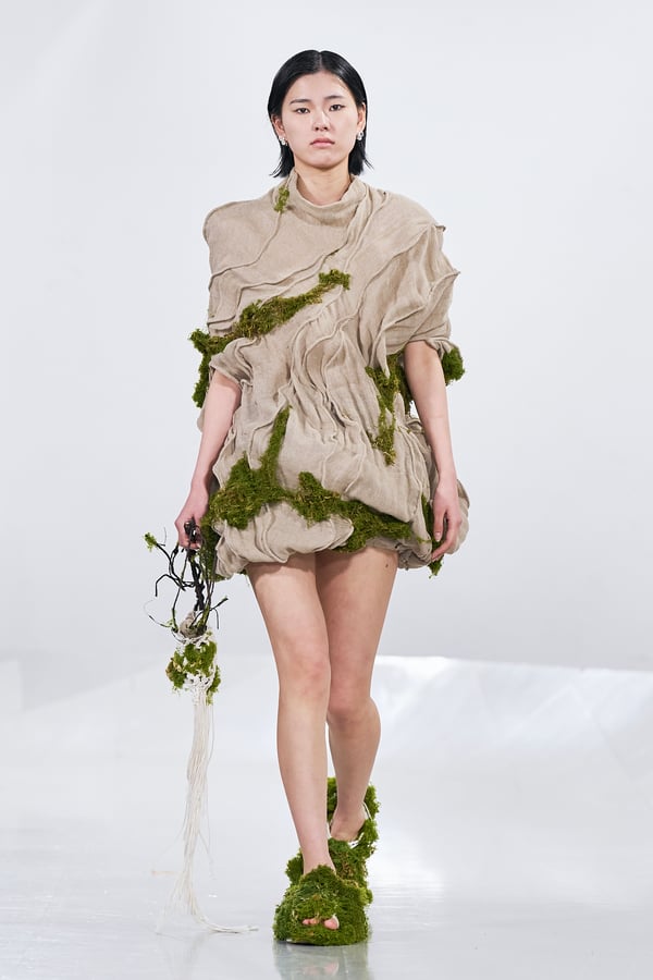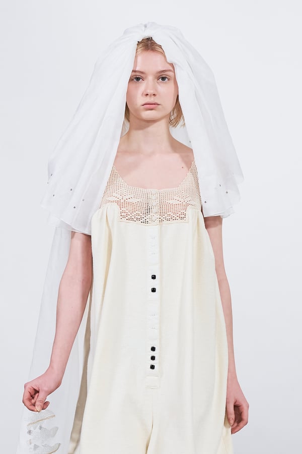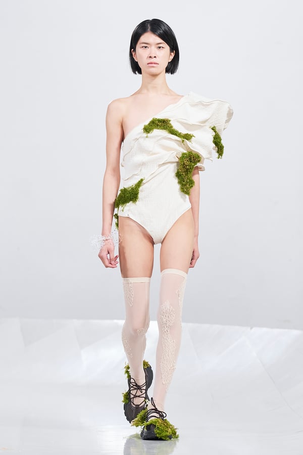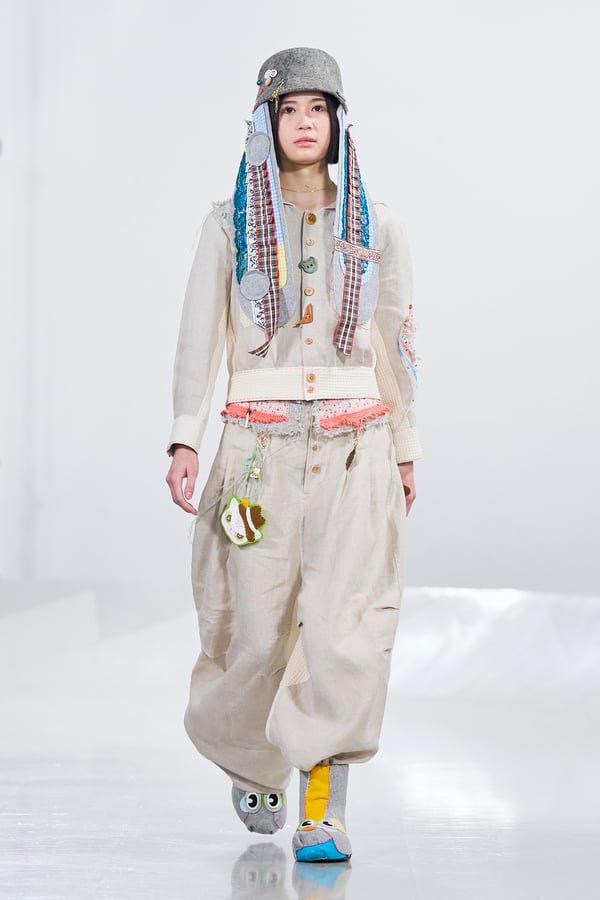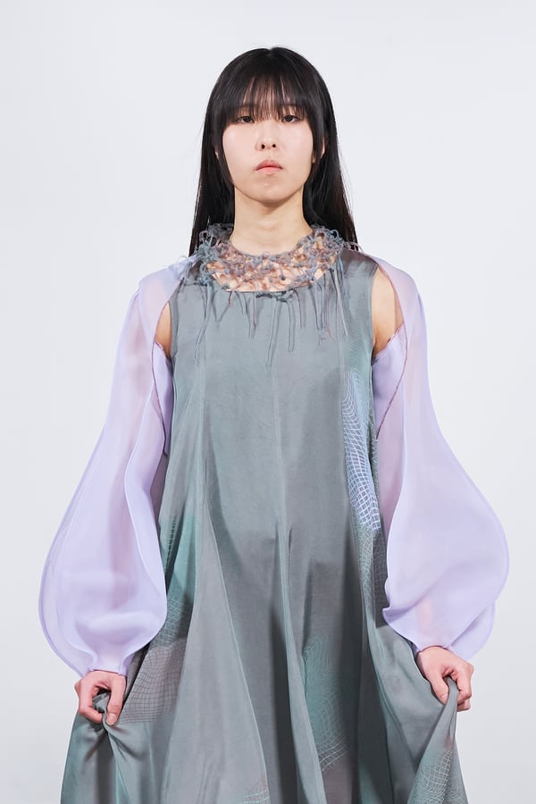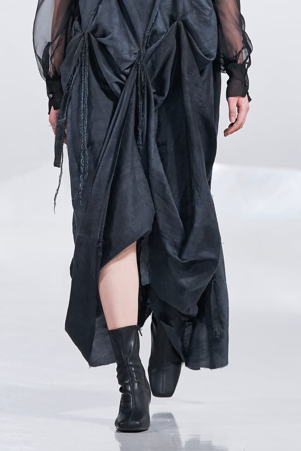 今年のコレクションのテーマは、白いキャンバスを意味する「ホワイトキャンバス(WHITE CANVAS)」。あらゆるクリエイションの始まりであり、不確かさと可能性の両方を内包する「白」を起点に、2026年3月卒業予定の31人の学生たちが、約1年間にわたるリサーチ・製作期間を経て完成させた作品の数々を披露した。同じテーマを起点としながらも、何気ない日常の儚さや、田舎での家族と過ごした時間や記憶、自然との侵されきらず拒まない共存の在り方、“女性らしさ”への違和感と反抗など、それぞれの学生が自身の経験や、感性、思想を反映して製作した多彩な作品が登場。またショーでは、パリ校からの留学生が作品のテーマを表現したパネルを手に持ち、各作品の先頭を歩く演出も行われた。