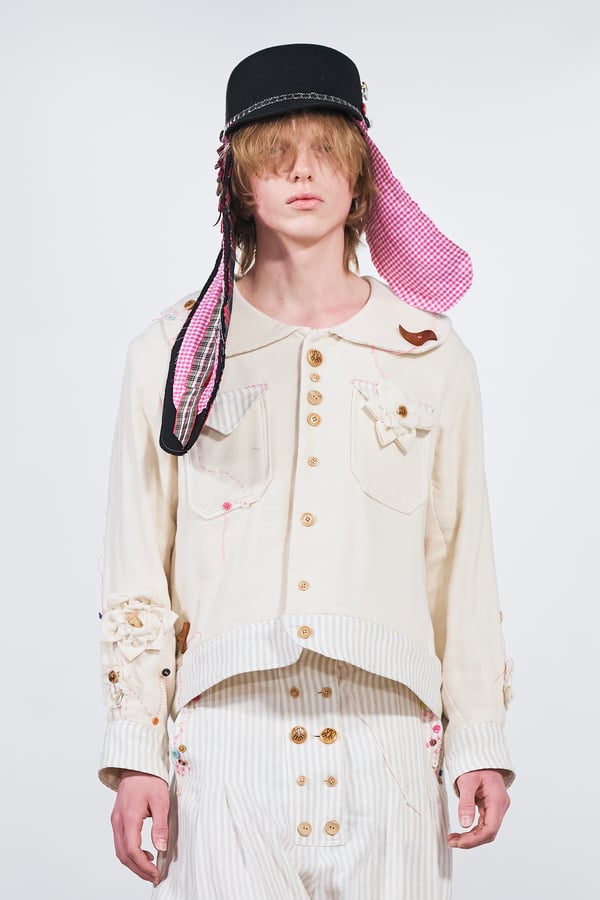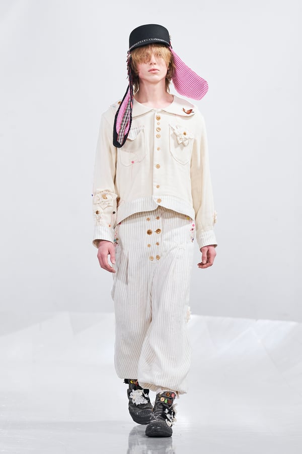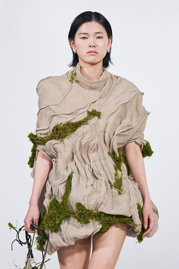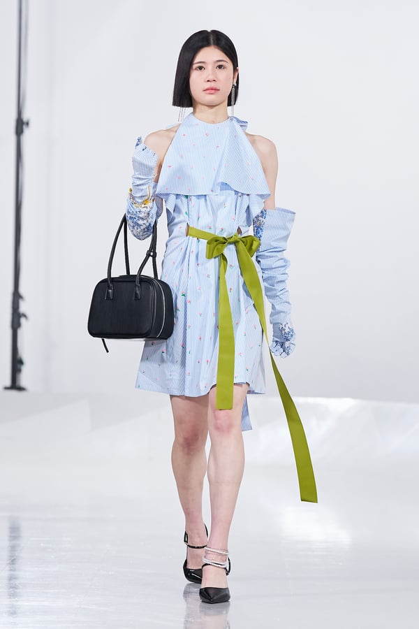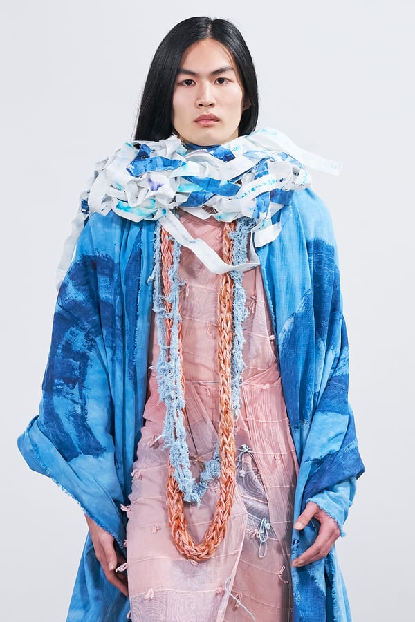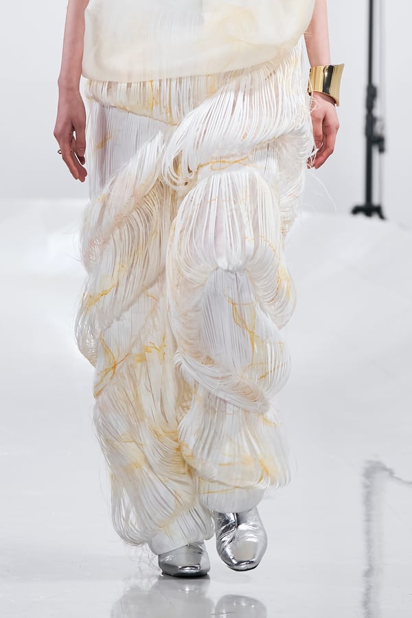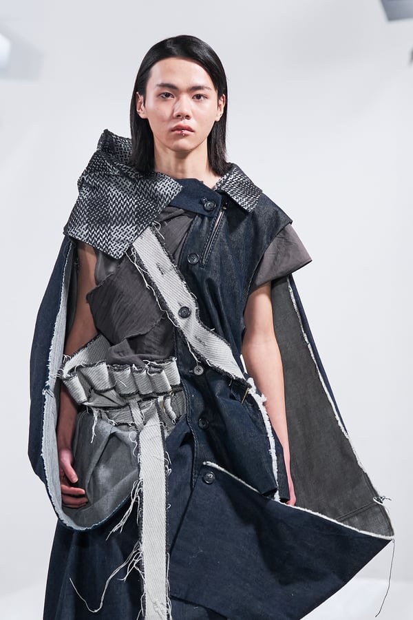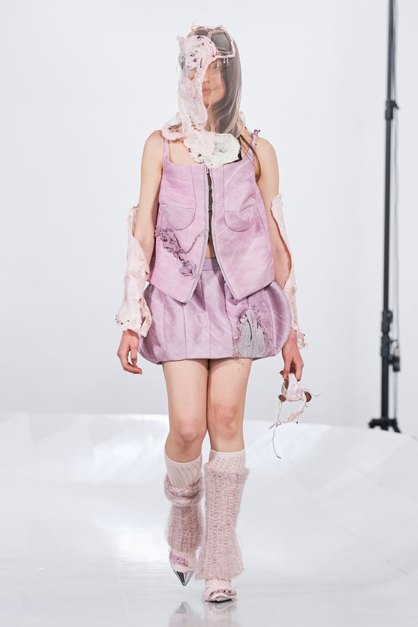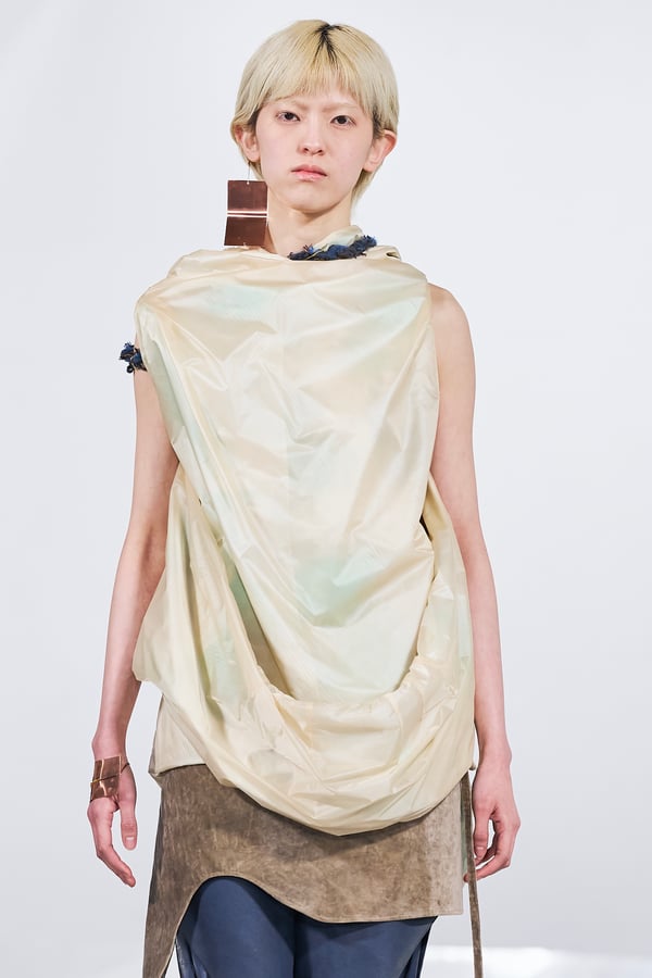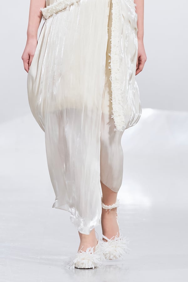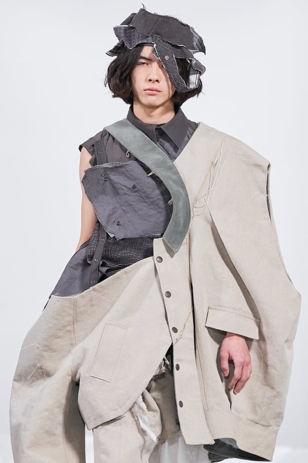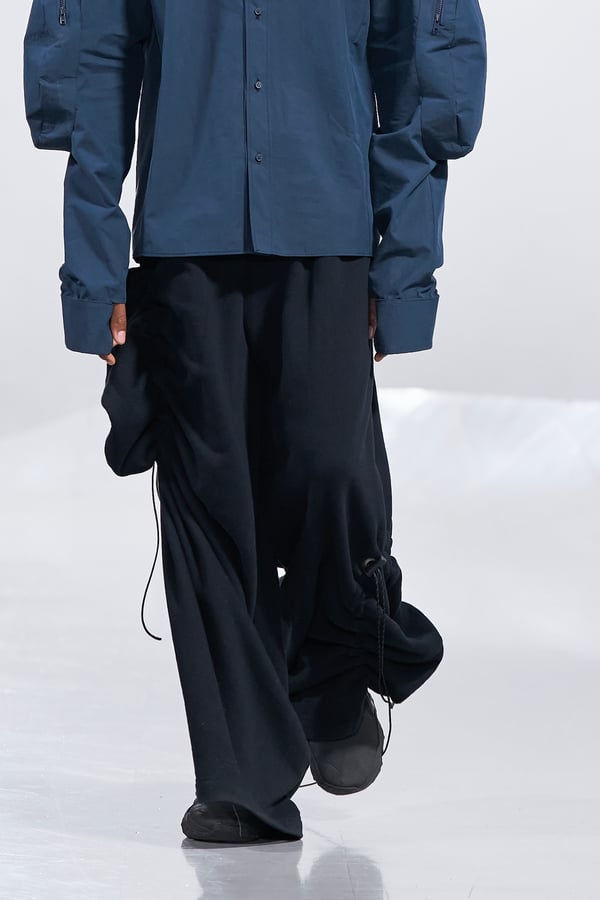 今年のコレクションのテーマは、白いキャンバスを意味する「ホワイトキャンバス(WHITE CANVAS)」。あらゆるクリエイションの始まりであり、不確かさと可能性の両方を内包する「白」を起点に、2026年3月卒業予定の31人の学生たちが、約1年間にわたるリサーチ・製作期間を経て完成させた作品の数々を披露した。同じテーマを起点としながらも、何気ない日常の儚さや、田舎での家族と過ごした時間や記憶、自然との侵されきらず拒まない共存の在り方、“女性らしさ”への違和感と反抗など、それぞれの学生が自身の経験や、感性、思想を反映して製作した多彩な作品が登場。またショーでは、パリ校からの留学生が作品のテーマを表現したパネルを手に持ち、各作品の先頭を歩く演出も行われた。