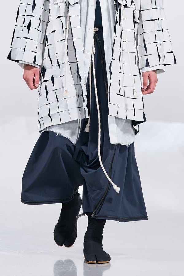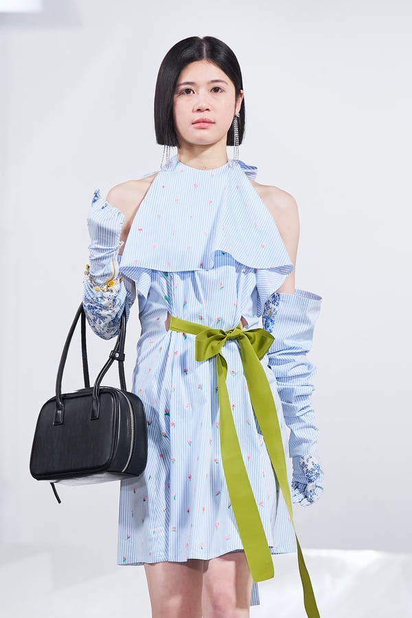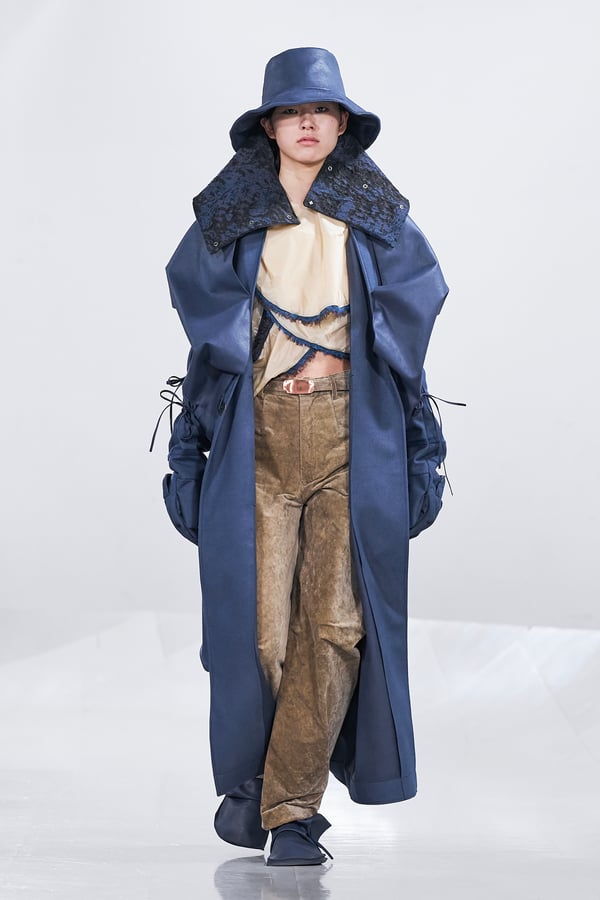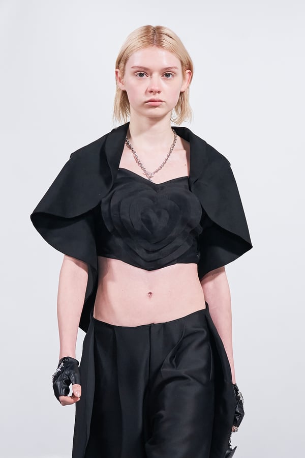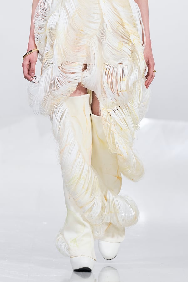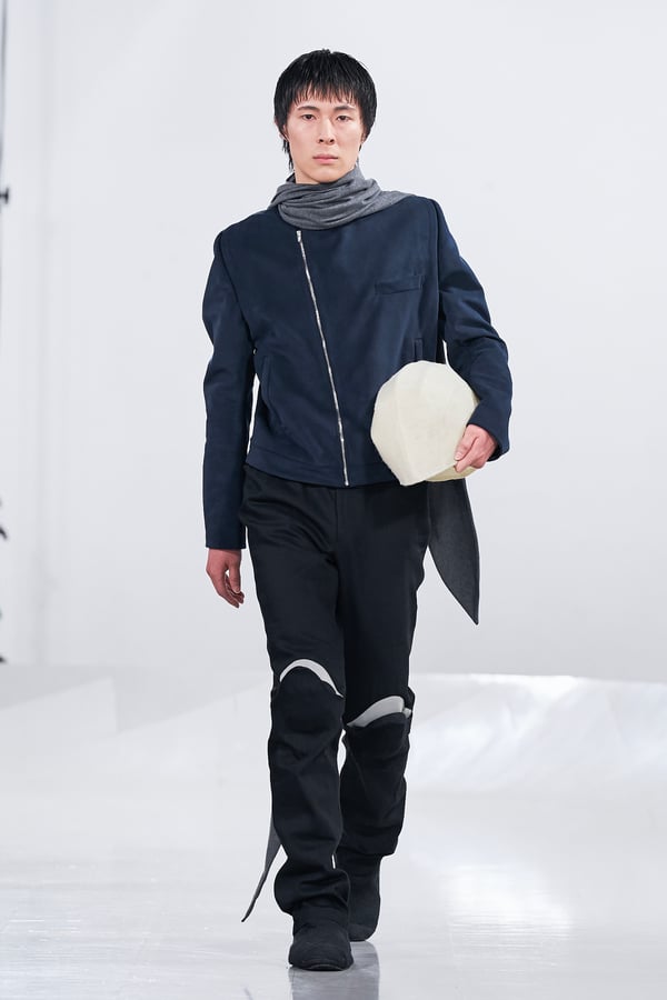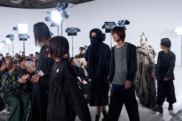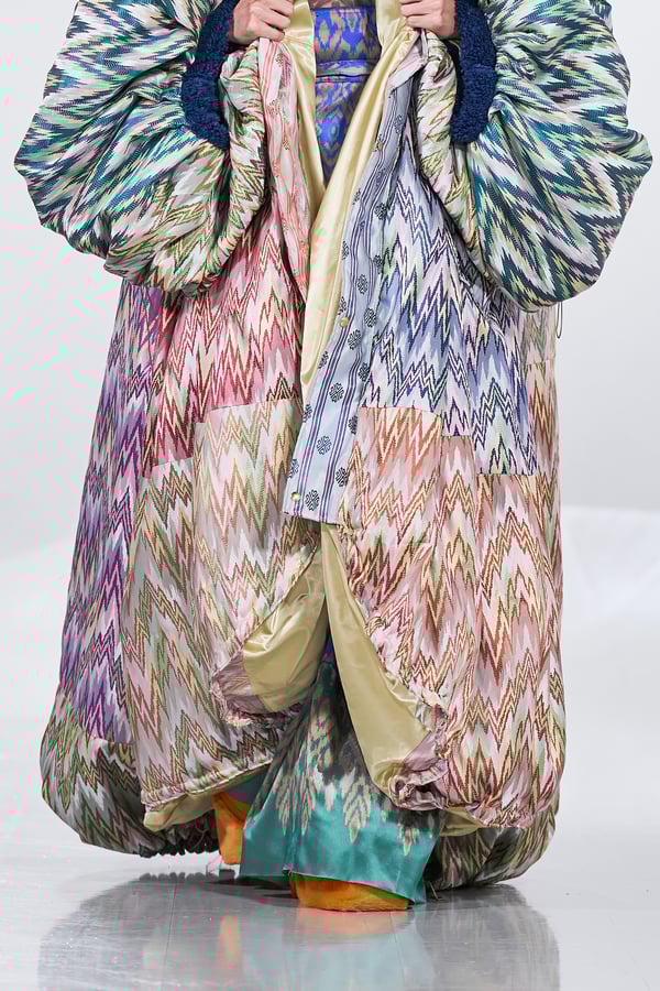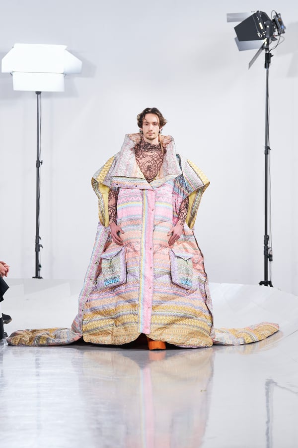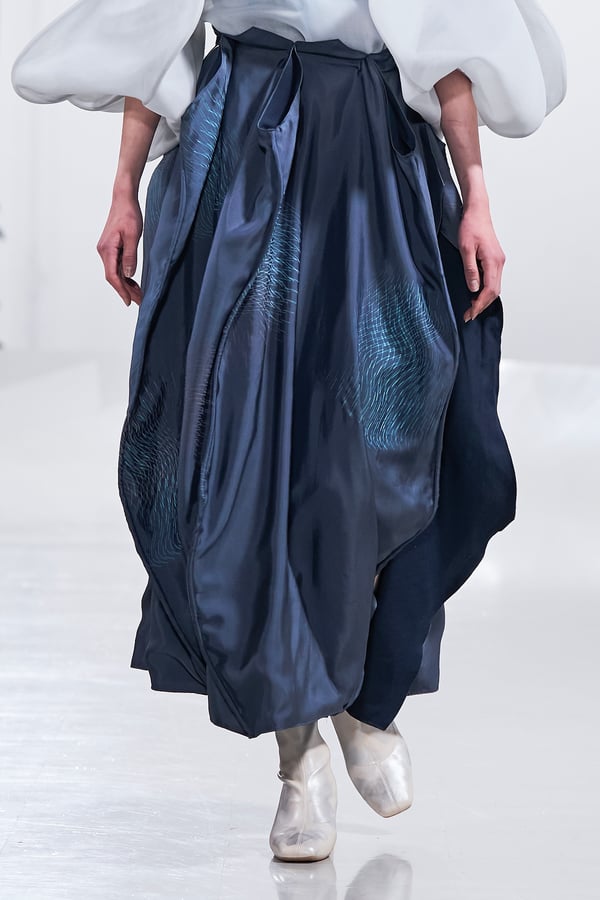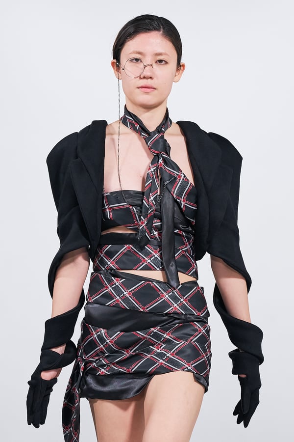 今年のコレクションのテーマは、白いキャンバスを意味する「ホワイトキャンバス(WHITE CANVAS)」。あらゆるクリエイションの始まりであり、不確かさと可能性の両方を内包する「白」を起点に、2026年3月卒業予定の31人の学生たちが、約1年間にわたるリサーチ・製作期間を経て完成させた作品の数々を披露した。同じテーマを起点としながらも、何気ない日常の儚さや、田舎での家族と過ごした時間や記憶、自然との侵されきらず拒まない共存の在り方、“女性らしさ”への違和感と反抗など、それぞれの学生が自身の経験や、感性、思想を反映して製作した多彩な作品が登場。またショーでは、パリ校からの留学生が作品のテーマを表現したパネルを手に持ち、各作品の先頭を歩く演出も行われた。