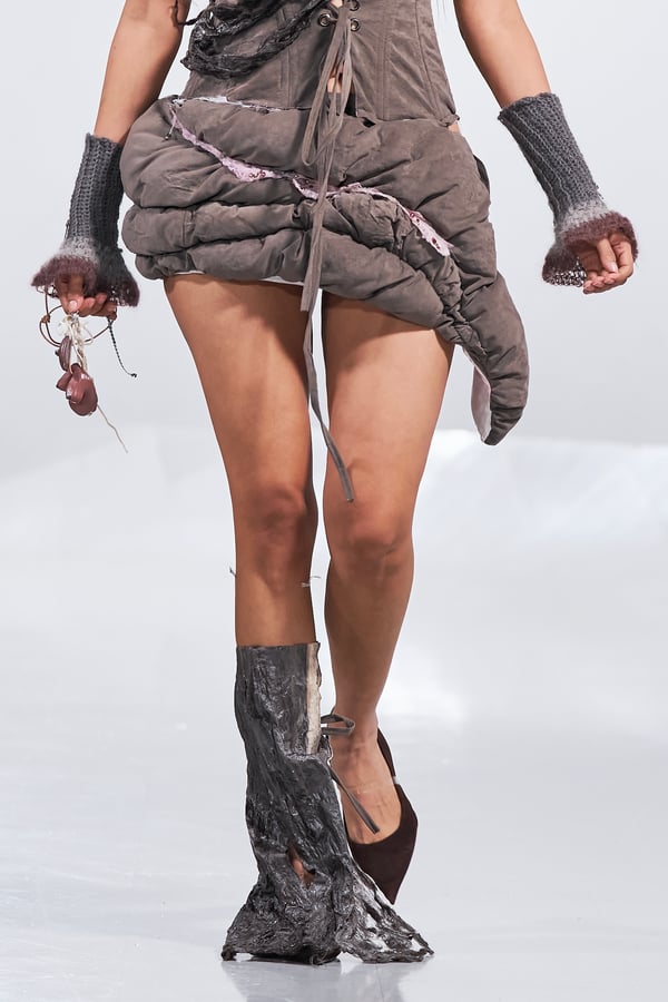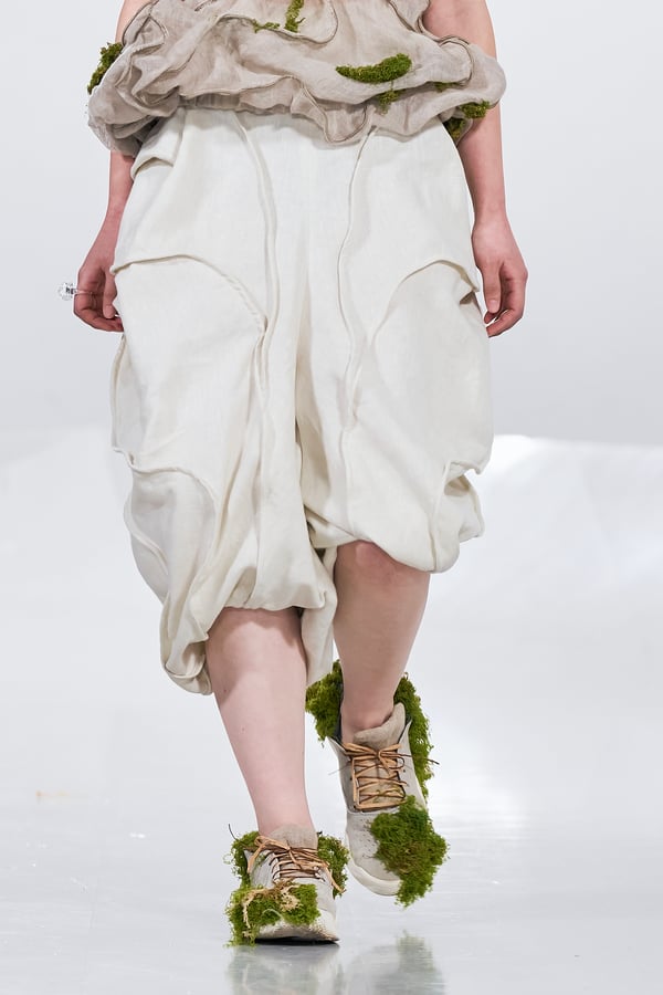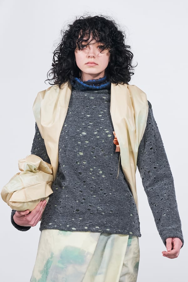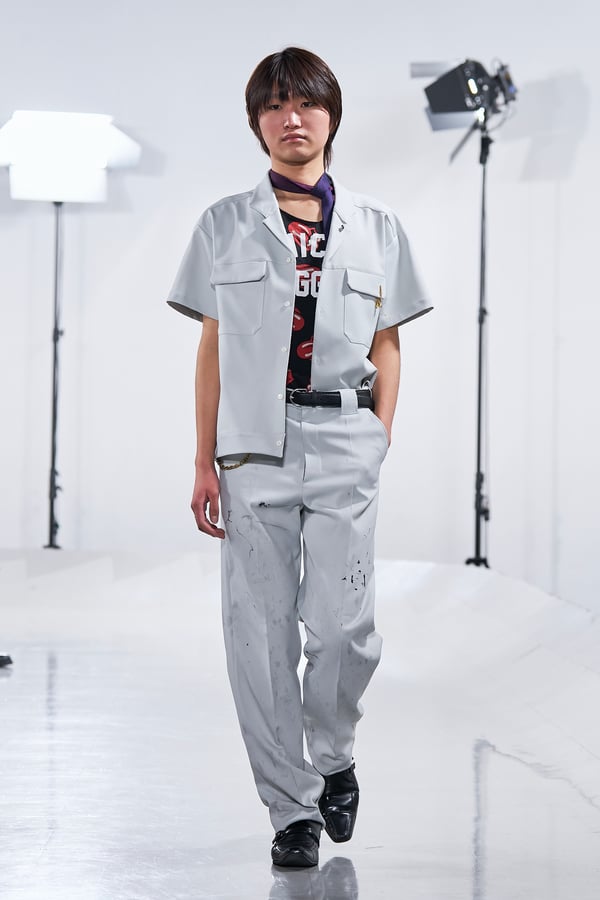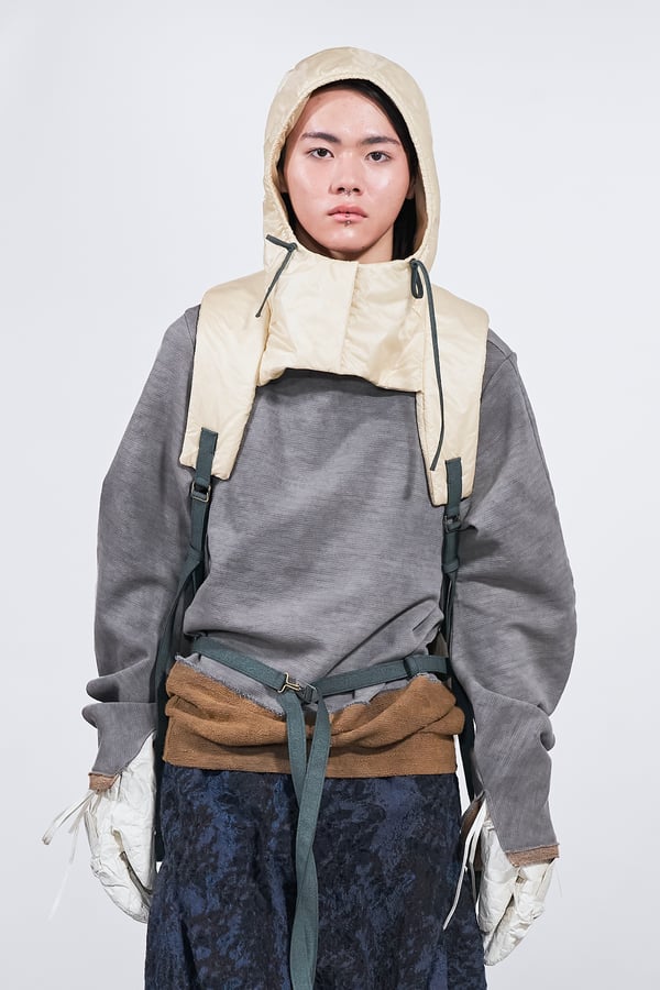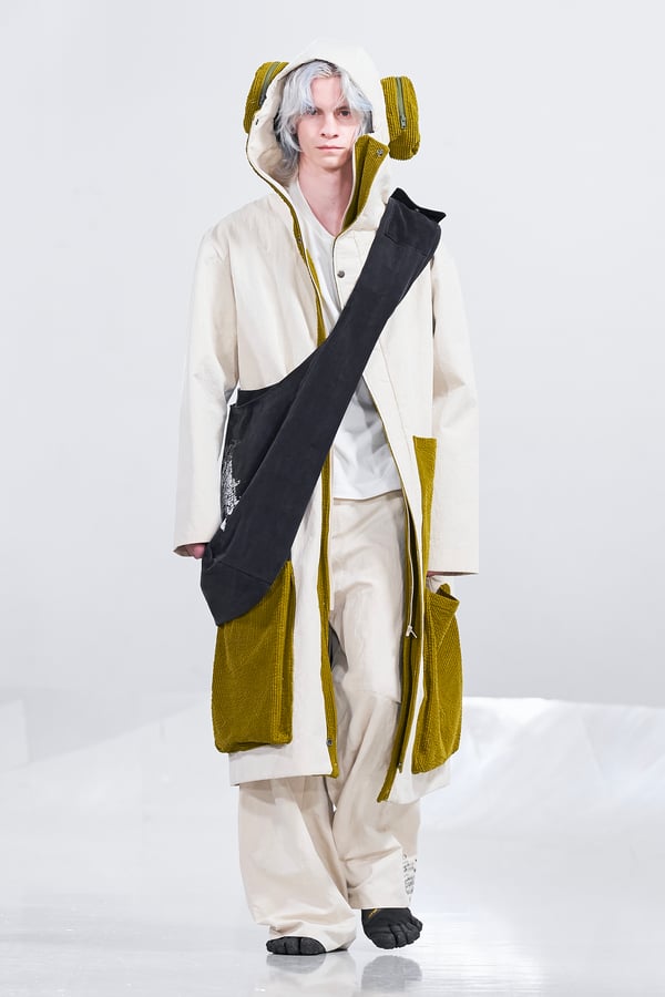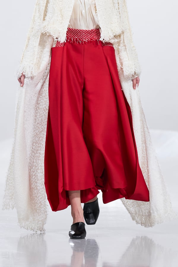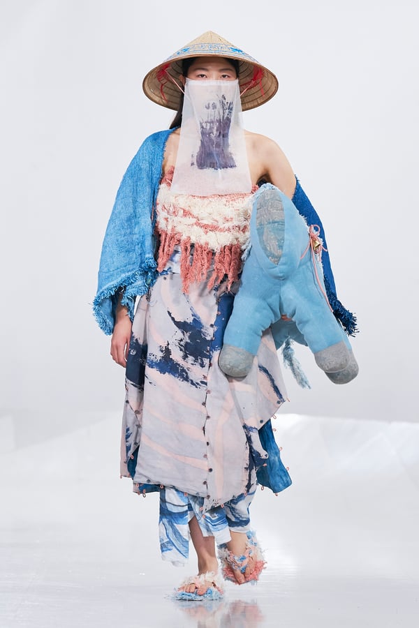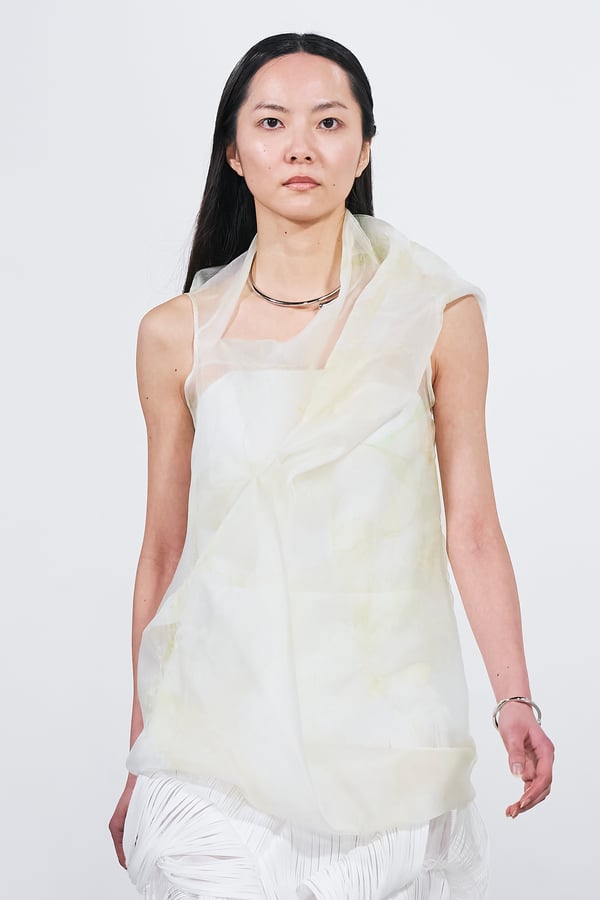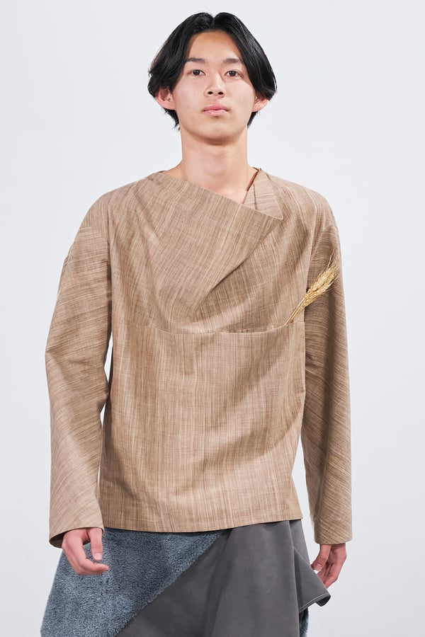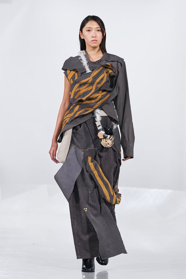 今年のコレクションのテーマは、白いキャンバスを意味する「ホワイトキャンバス(WHITE CANVAS)」。あらゆるクリエイションの始まりであり、不確かさと可能性の両方を内包する「白」を起点に、2026年3月卒業予定の31人の学生たちが、約1年間にわたるリサーチ・製作期間を経て完成させた作品の数々を披露した。同じテーマを起点としながらも、何気ない日常の儚さや、田舎での家族と過ごした時間や記憶、自然との侵されきらず拒まない共存の在り方、“女性らしさ”への違和感と反抗など、それぞれの学生が自身の経験や、感性、思想を反映して製作した多彩な作品が登場。またショーでは、パリ校からの留学生が作品のテーマを表現したパネルを手に持ち、各作品の先頭を歩く演出も行われた。