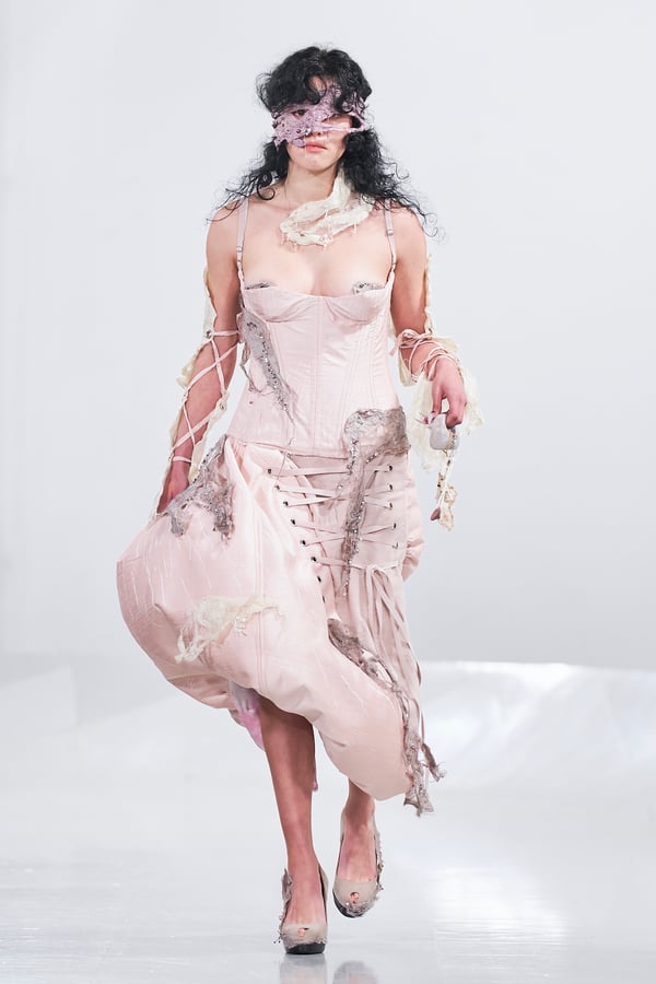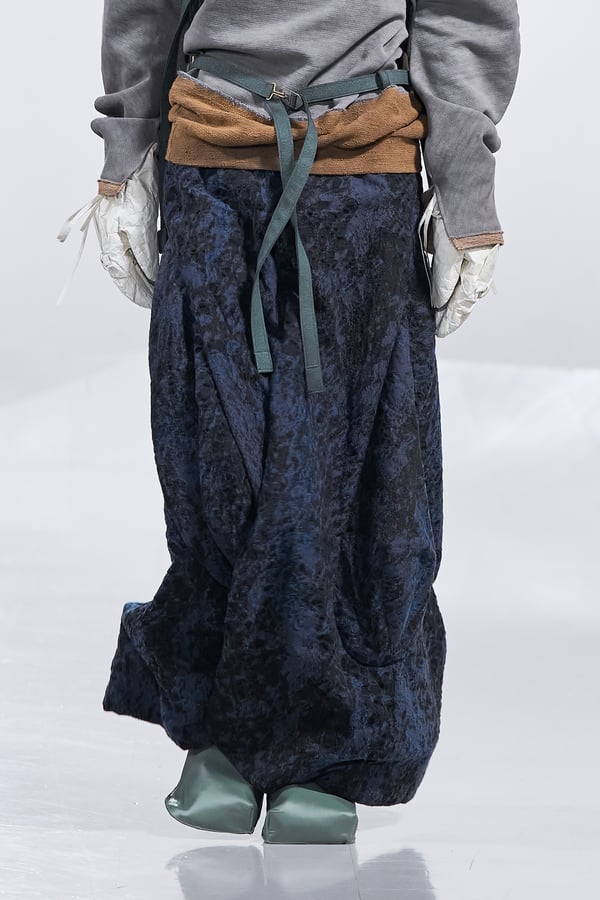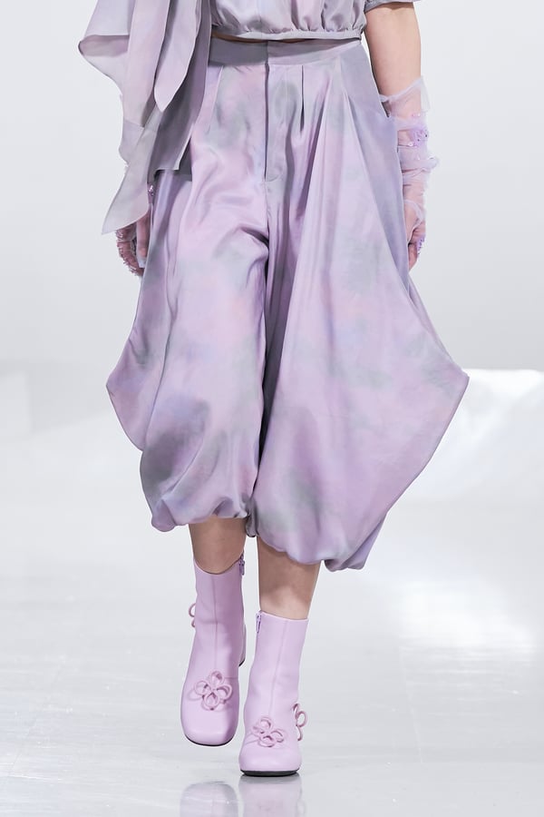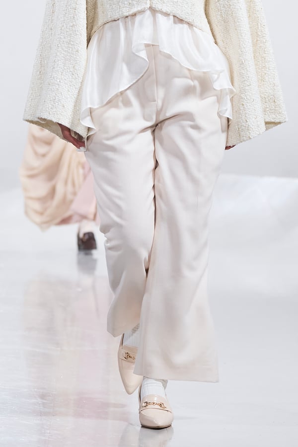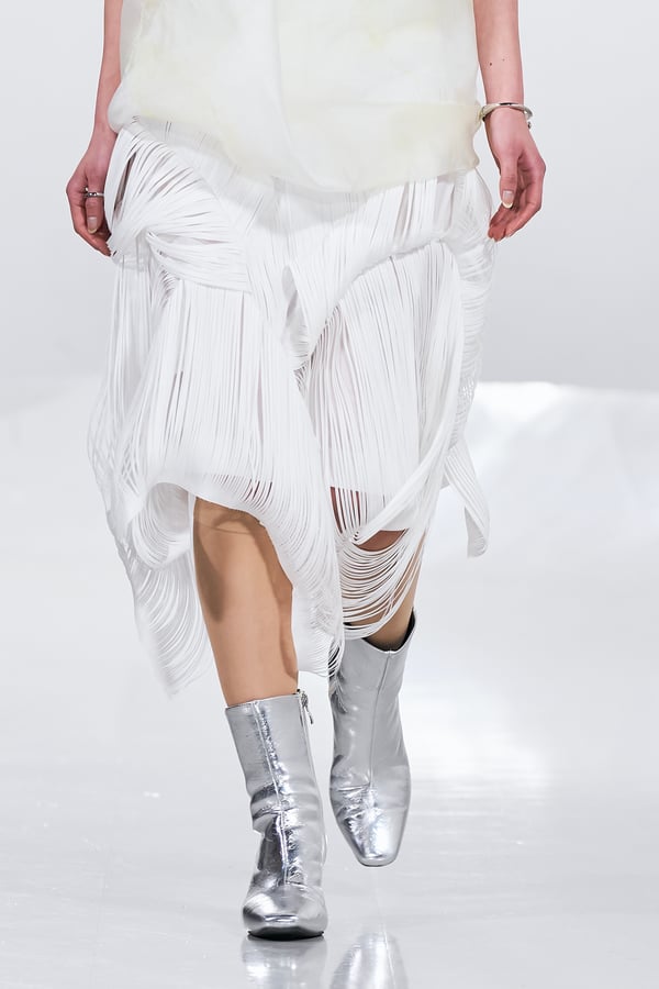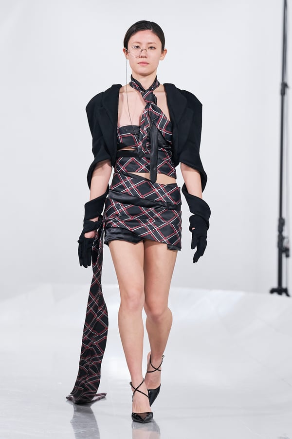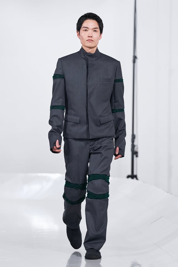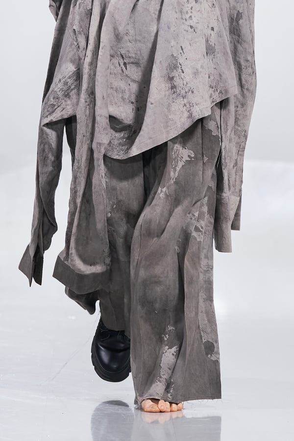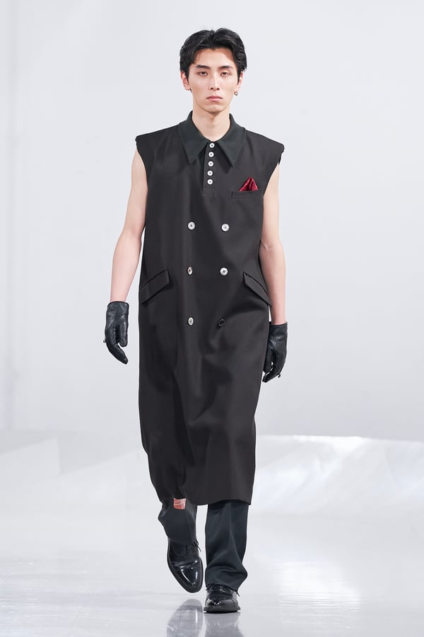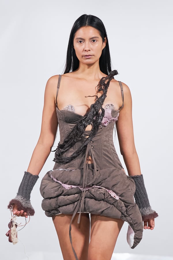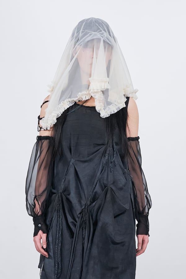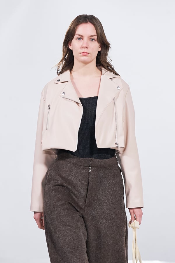 今年のコレクションのテーマは、白いキャンバスを意味する「ホワイトキャンバス(WHITE CANVAS)」。あらゆるクリエイションの始まりであり、不確かさと可能性の両方を内包する「白」を起点に、2026年3月卒業予定の31人の学生たちが、約1年間にわたるリサーチ・製作期間を経て完成させた作品の数々を披露した。同じテーマを起点としながらも、何気ない日常の儚さや、田舎での家族と過ごした時間や記憶、自然との侵されきらず拒まない共存の在り方、“女性らしさ”への違和感と反抗など、それぞれの学生が自身の経験や、感性、思想を反映して製作した多彩な作品が登場。またショーでは、パリ校からの留学生が作品のテーマを表現したパネルを手に持ち、各作品の先頭を歩く演出も行われた。