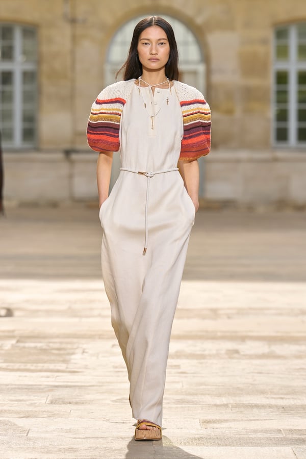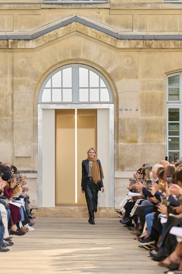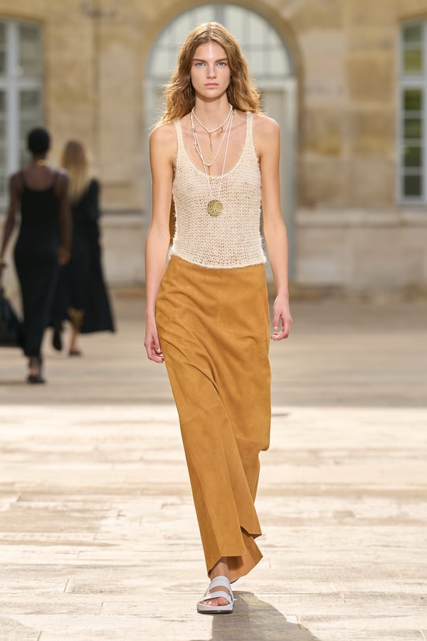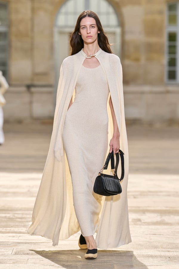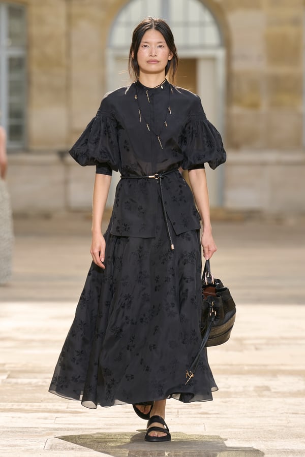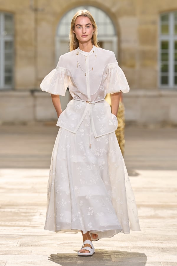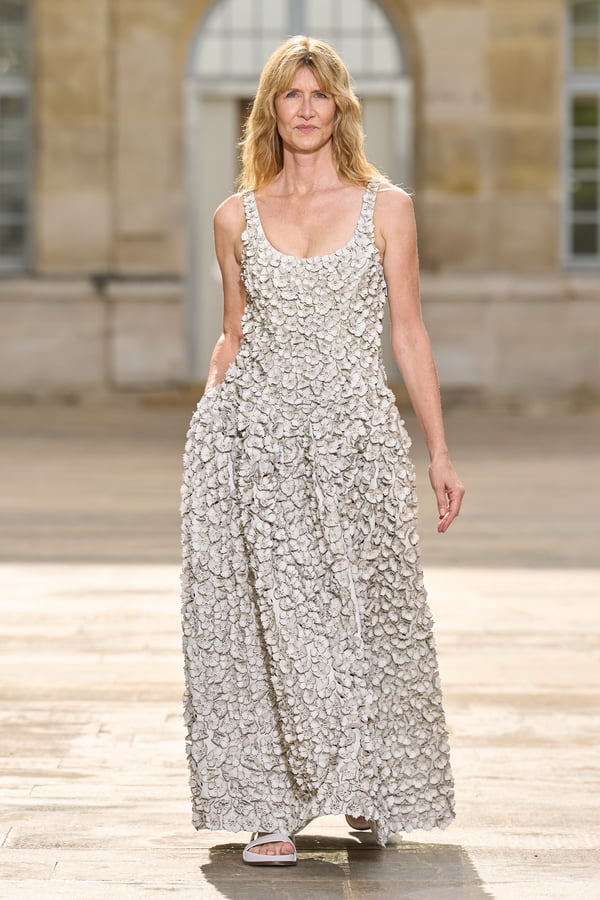 「ガブリエラ・ハースト(GABRIELA HEARST)」2026年春夏コレクションは、デザイナーが若い頃から親しんできたタロットカードに着想。リゾートコレクションに続く第2弾であり、今シーズンは78枚からなるタロットのうち22枚の大アルカナをテーマにコレクションを製作した。ショーは女優のローラ・ダーンがまとった愛と叡智を兼ね備えた母なる大地を意味するTHE EMPRESS(皇后)に始まり、古いパターンを打ち破ることを意味するTHE HANGED MAN(吊るされた男)で締めくくられた。2500個のレザー製の花を配したドレスや、自身の娘の絵がモチーフの花柄刺繍が施されたスカートやシャツ、アップサイクルリネンにレーザーカットを施したドレスなどクラフトと物語性が融合。シルエットはパフスリーブやクリノリンの構造が多用され、フェミニンなシルエットのなかに、上質な素材使いによるマチュアなエレガンスを醸し出している。金メッキのチャームや手編みのレザーアクセサリーはカードのシンボルを表しており、フリンジやマクラメでルックに動きを与えた。コレクションは前シーズンのデッドストック素材の織物を97%使用し、環境負荷を抑えつつ芸術性を宿したコレクションとなった。