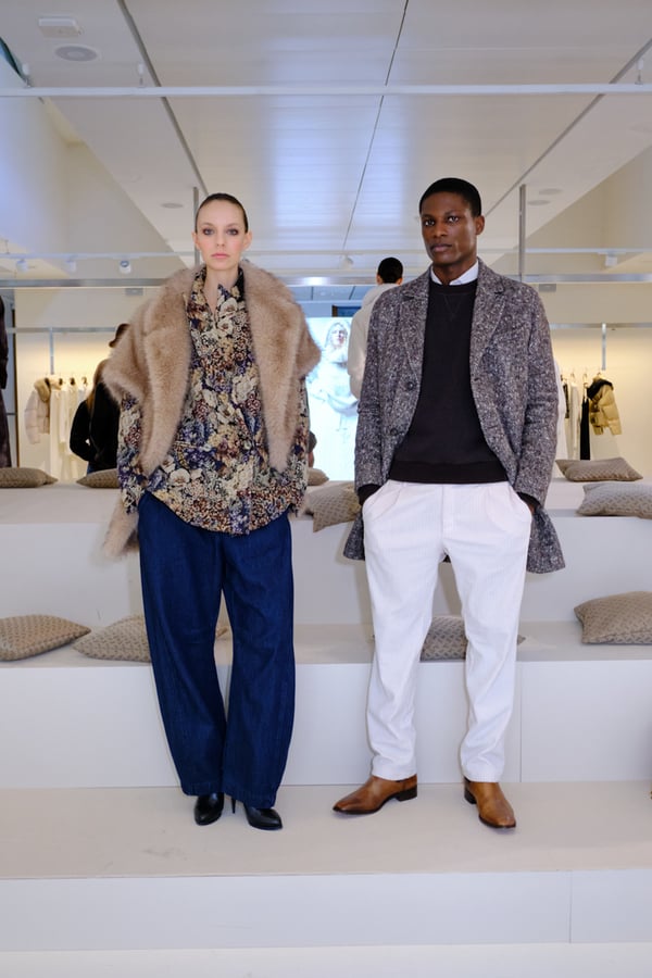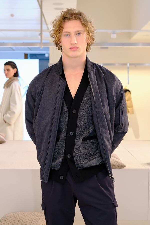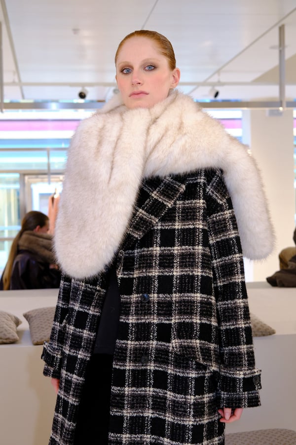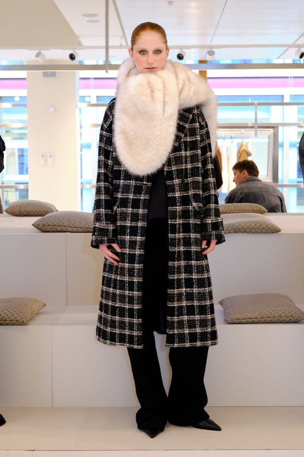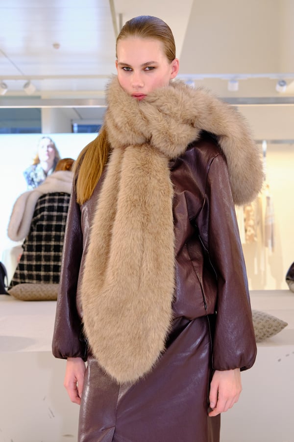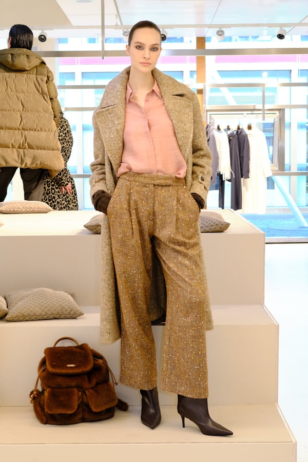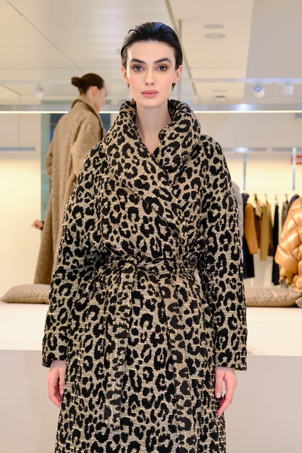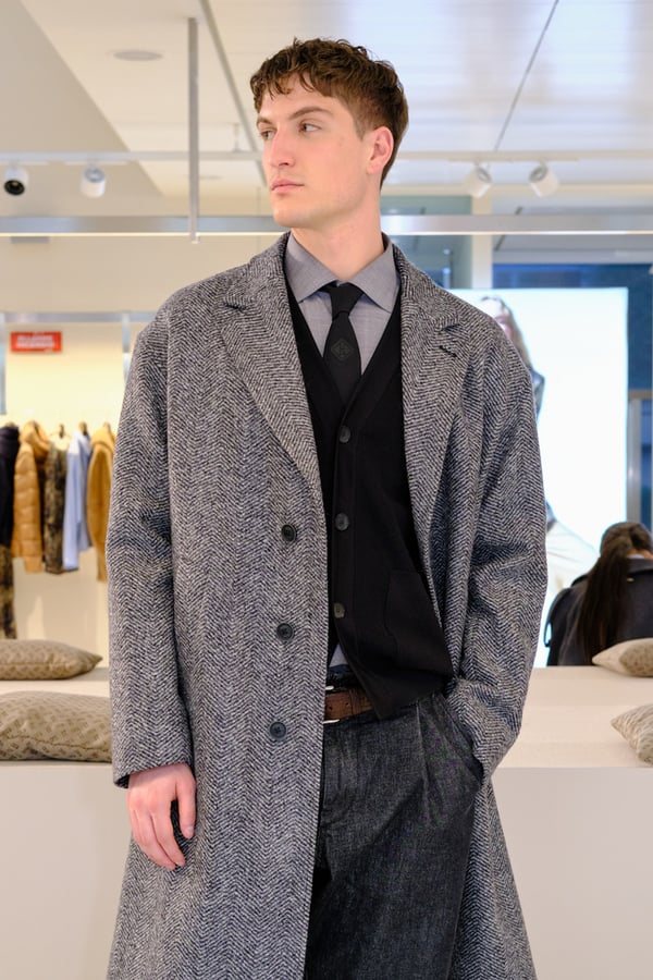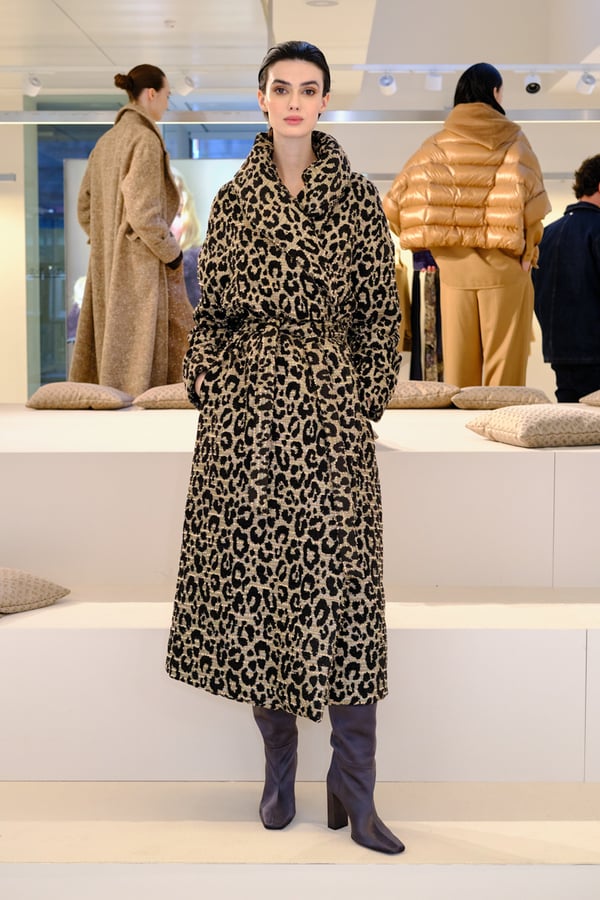エクセレンスはヘルノのラグジュアリーを純粋に表現。カシミアやシルクカシミア、ベビーキャメルといった上質な素材が、洗練されたエレガントなシルエットを形作り、「H」のゴールドピンや、真珠のボタン、レザーのアクセント、フリンジなどで彩られた。ネップツイードのジャケット、ハンドニットでスパンコールと総柄を編み上げたドレスなどをラインナップ。また、膨れジャカードのスカートと、同柄のプリントワンピースといった遊びのあるアイテムも登場した。