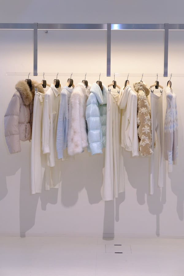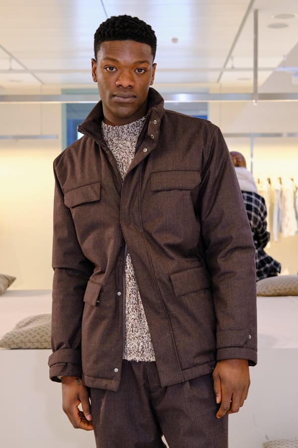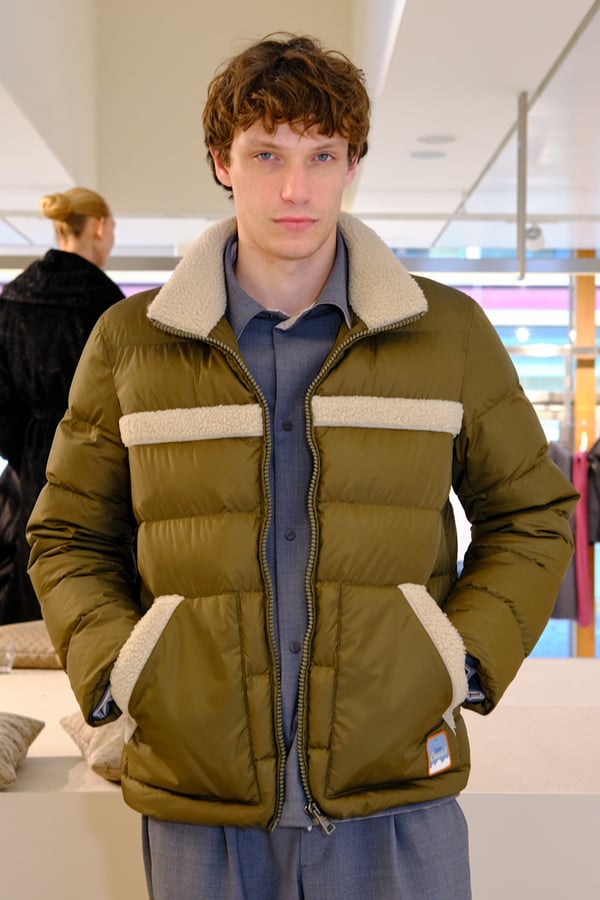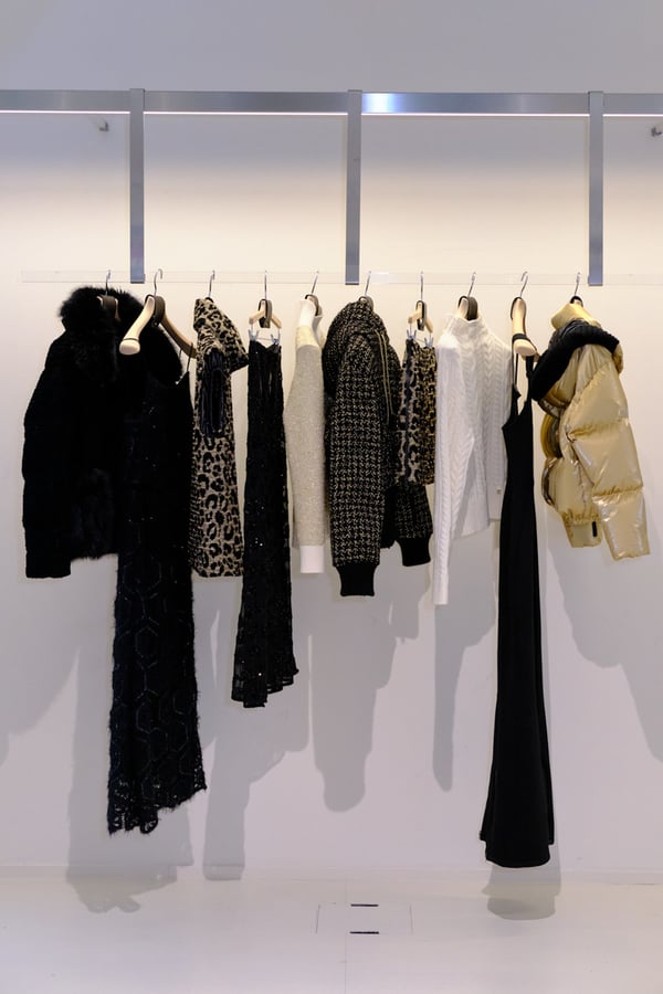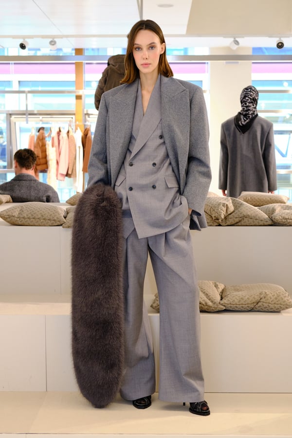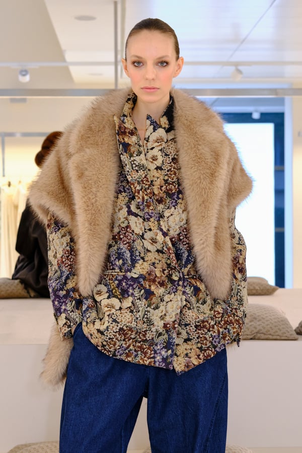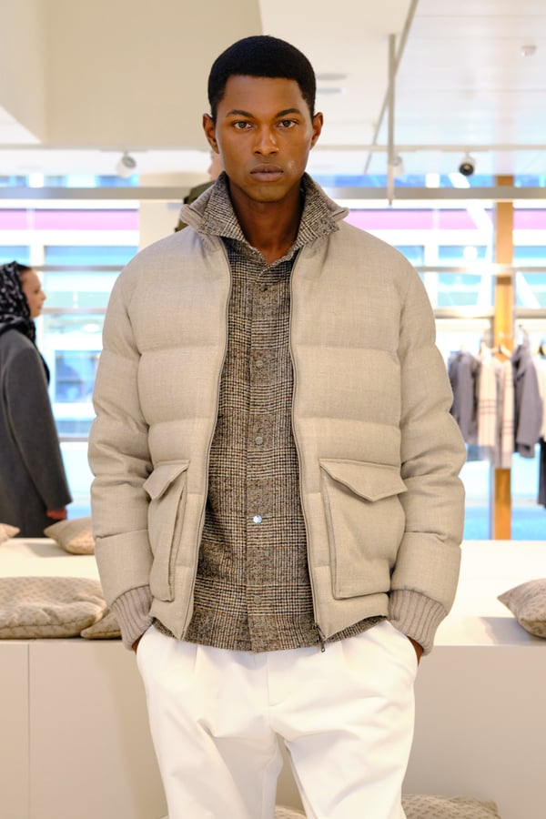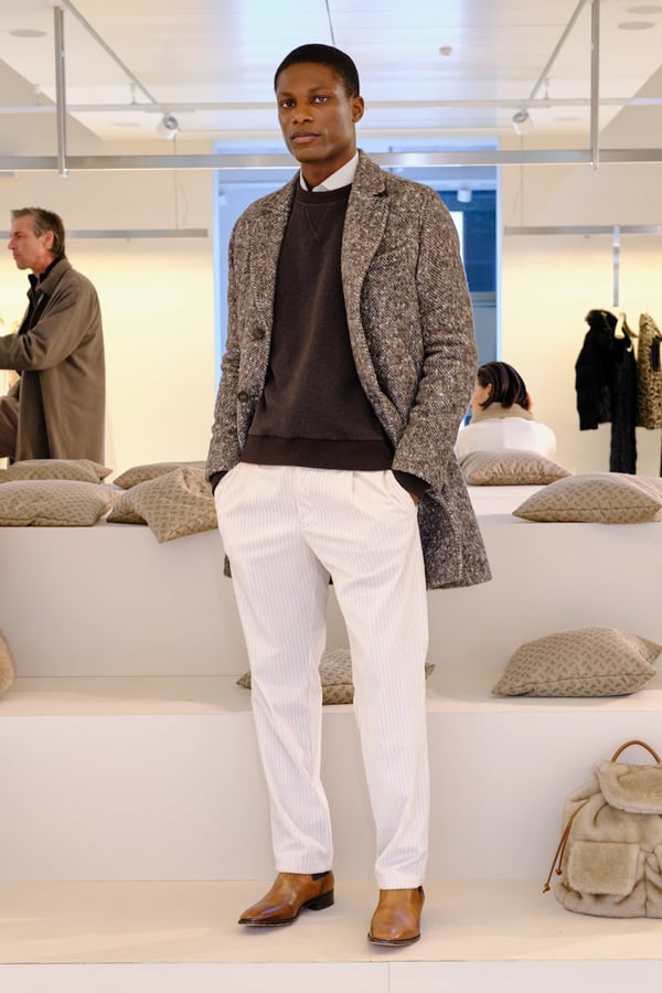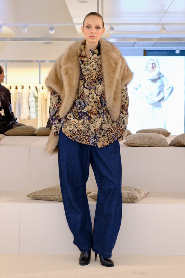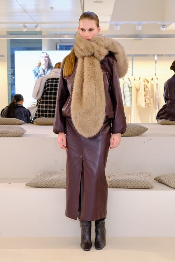 エクセレンスはヘルノのラグジュアリーを純粋に表現。カシミアやシルクカシミア、ベビーキャメルといった上質な素材が、洗練されたエレガントなシルエットを形作り、「H」のゴールドピンや、真珠のボタン、レザーのアクセント、フリンジなどで彩られた。ネップツイードのジャケット、ハンドニットでスパンコールと総柄を編み上げたドレスなどをラインナップ。また、膨れジャカードのスカートと、同柄のプリントワンピースといった遊びのあるアイテムも登場した。