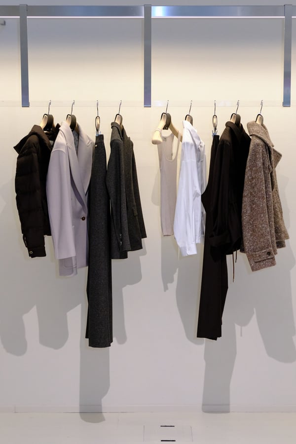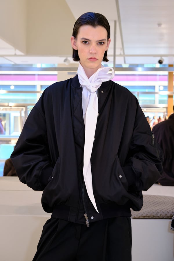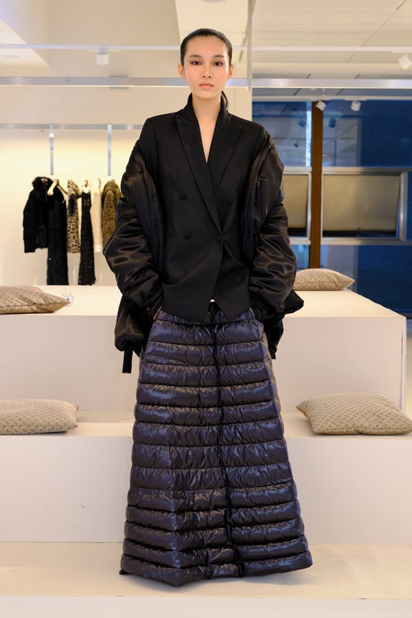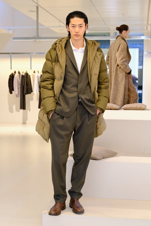 アドバンストは建築にインスピレーションを得て、洗練された現代的美学を探求。肩のラインをシャープに強調したジャケット・コート類が特徴的。ディテールをブラックで統一し、ミニマルで洗練された哲学を投影した。