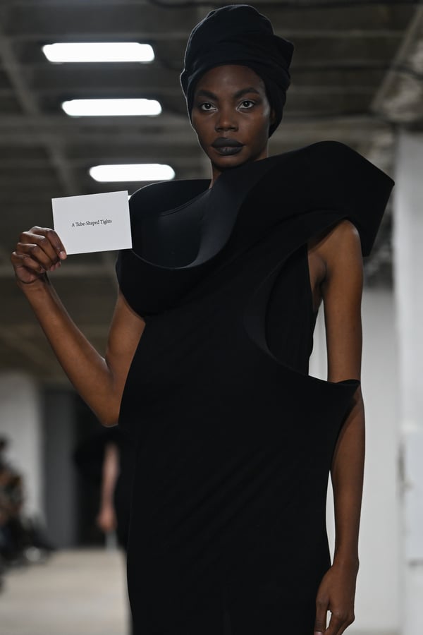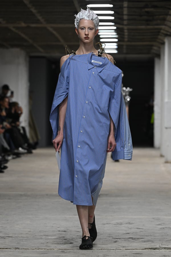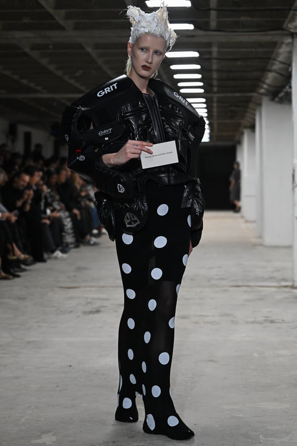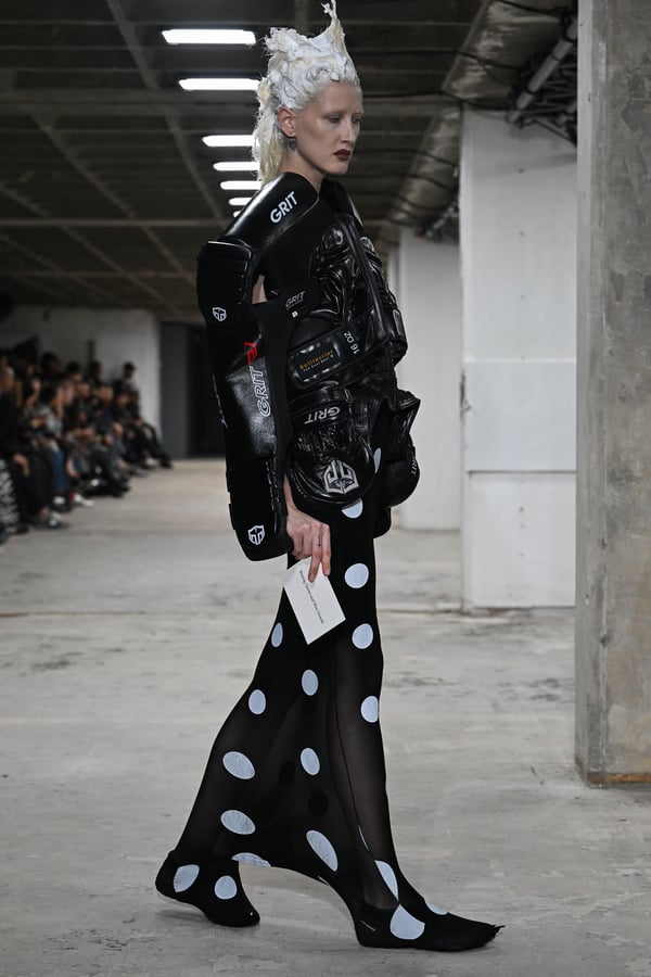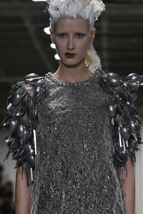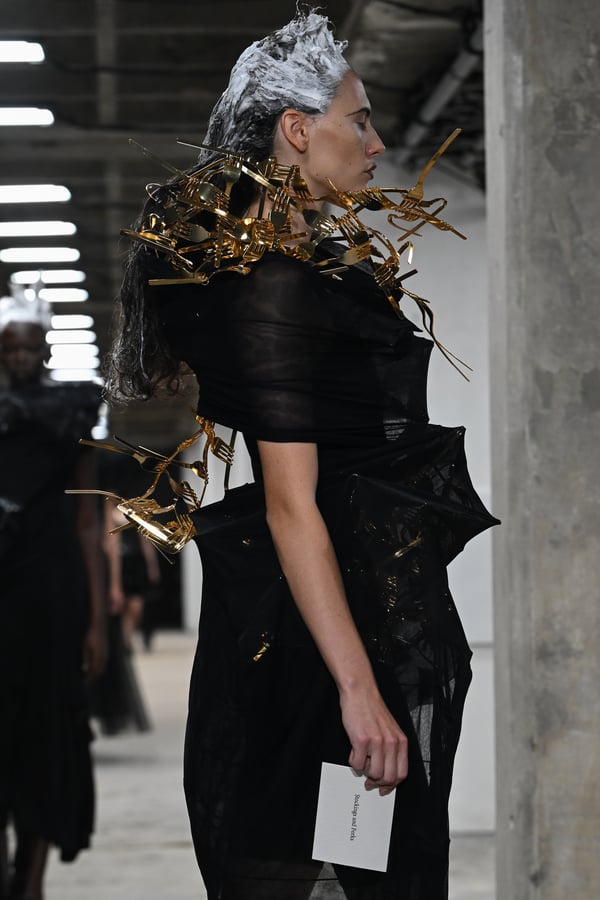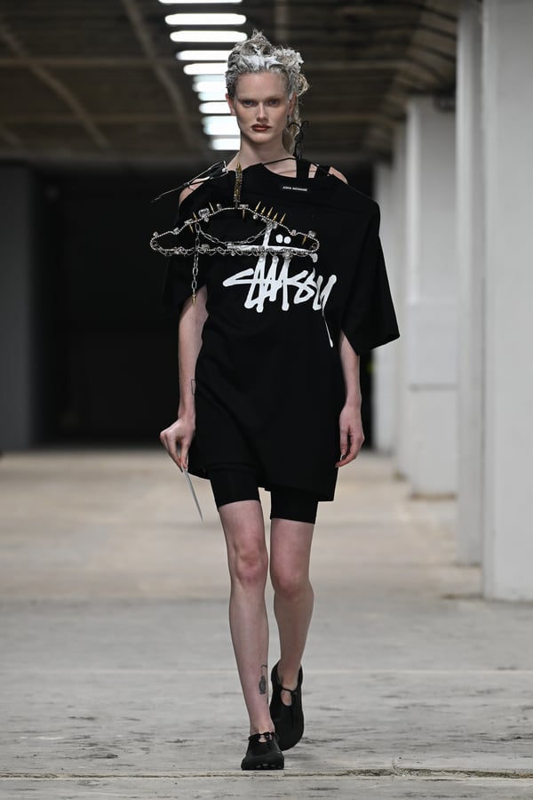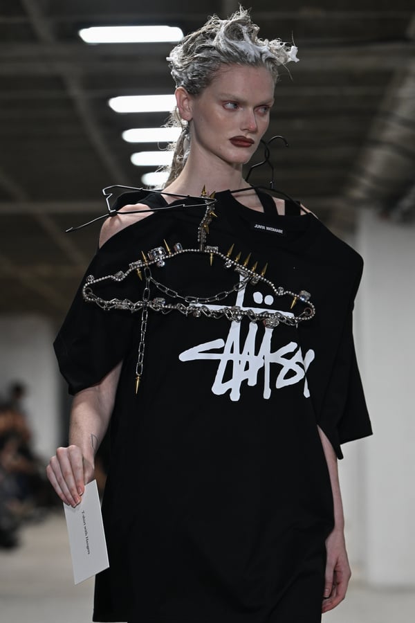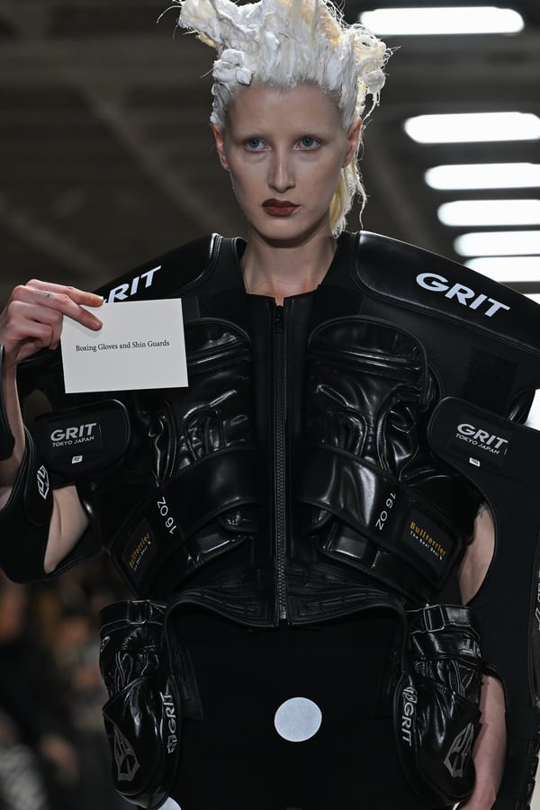 コレクションでは、パンプスやハット、ハンガー、カトラリー、ワイングラスを衣服の一部として融合。テキスタイルで包むなど、それぞれのオブジェクトごとに異なる手法が用いられた。そのほか「ステューシー(STÜSSY)」のTシャツにもハンガーで装飾したほか、ボレロジャケットは東京の後楽園ホールすぐ側にある格闘技用品を中心に扱う販売店「GRIT」と協業して製作した。